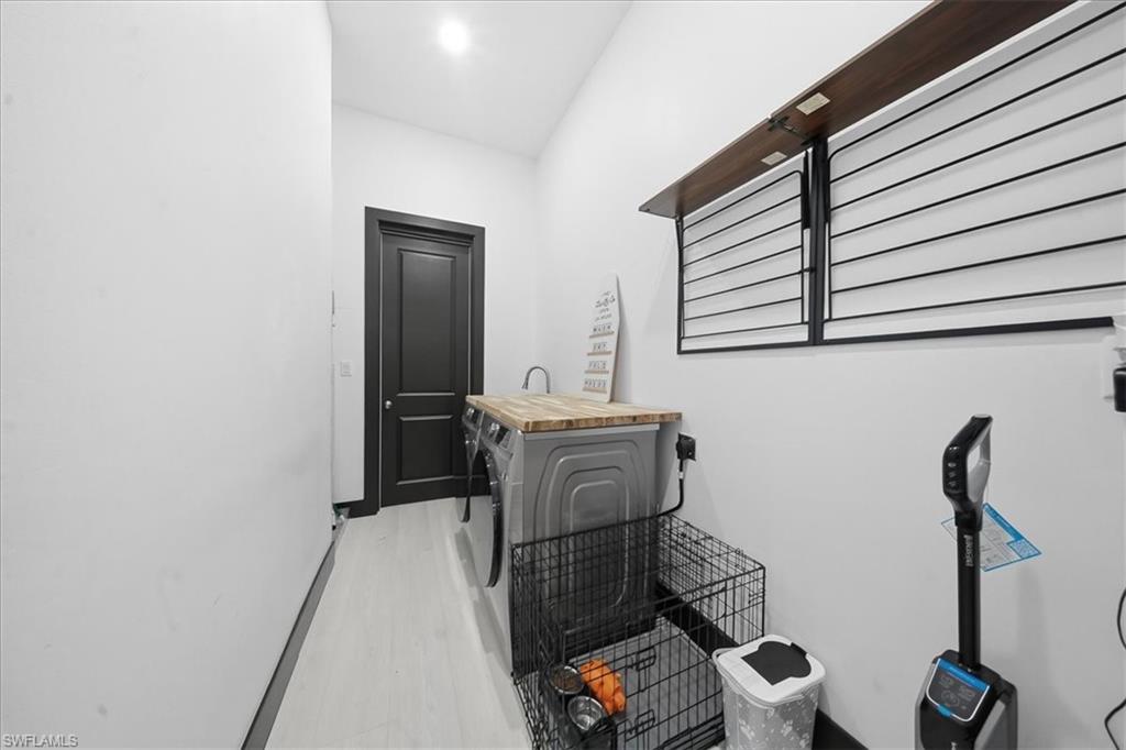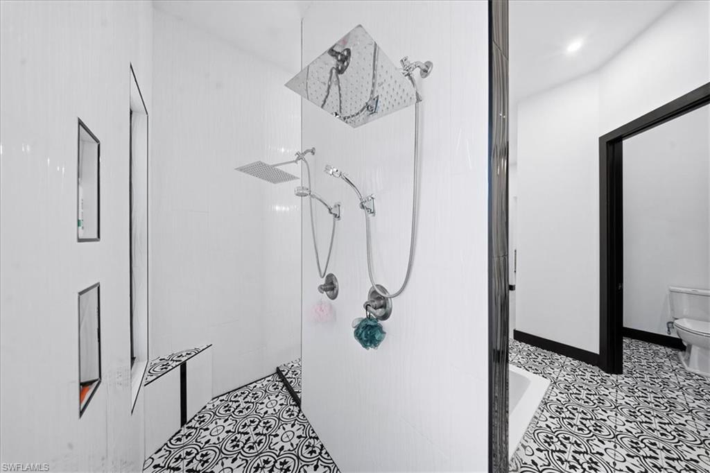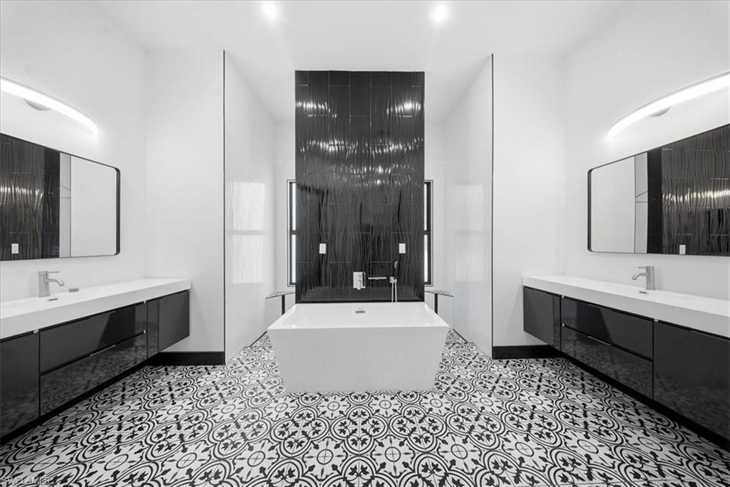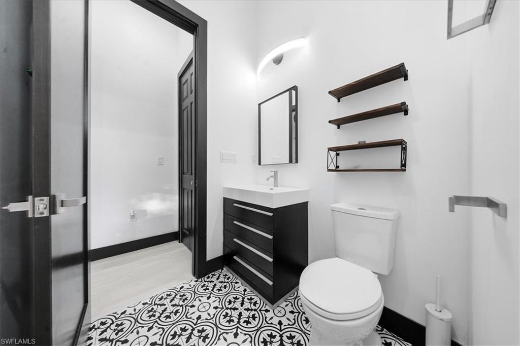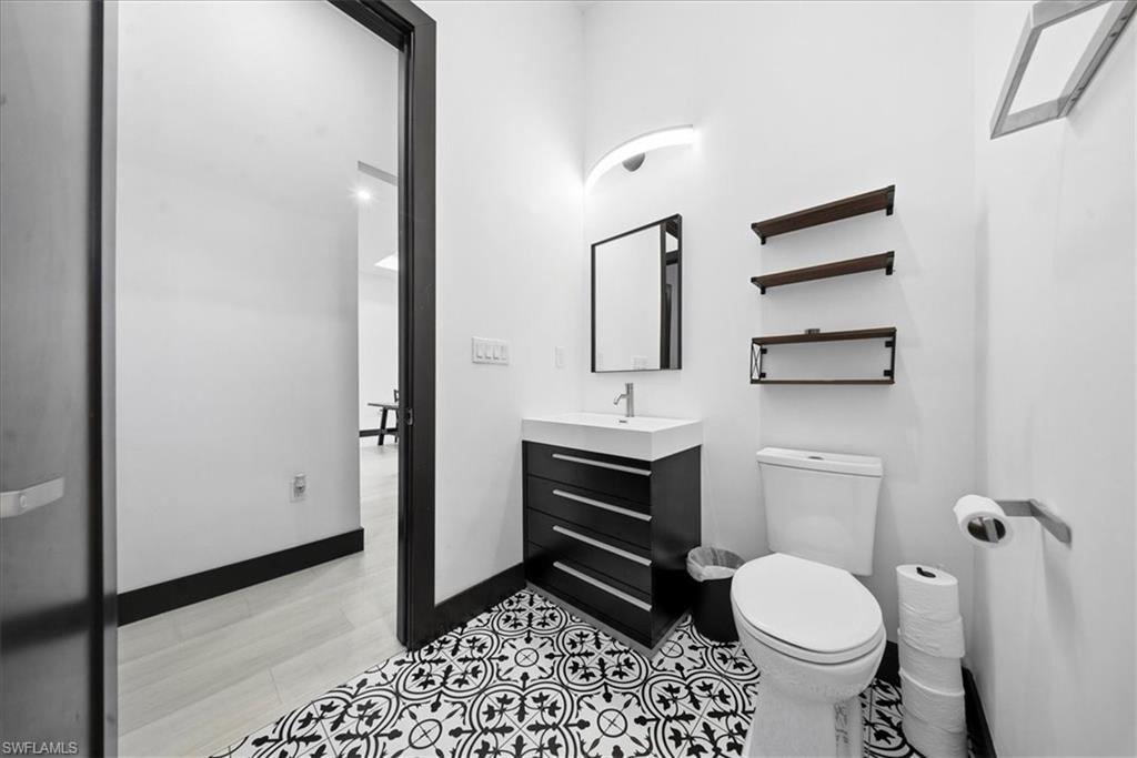Modern 3 bedroom + den, 3 bath pool home on nearly half an acre in Bonita Springs, just minutes from Barefoot Beach, shopping and dining. A long paver drive and contemporary elevation with metal roof lead into a light-filled open layout with high ceilings and wide-plank tile flooring. Sleek kitchen with oversized waterfall island, flat-panel cabinetry, smart stainless appliances and double wall ovens opens to the living and dining areas; oversized den with private bathroom works well as a media room or your own personal gym. Spa-style primary suite offers a striking bath with patterned tile, floating dual vanities, freestanding soaking tub and large shower. Outside, enjoy a private outdoor oasis with saltwater pool, raised spa, auto-fill/auto-drain system, travertine deck and covered lanai. Spray-foam attic insulation, smart features and generous yard space on all sides complete this move-in ready retreat.