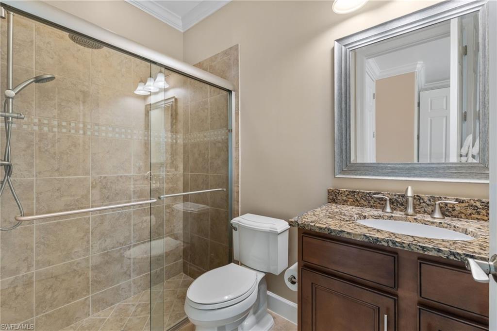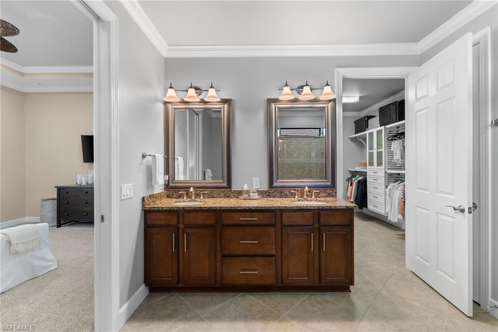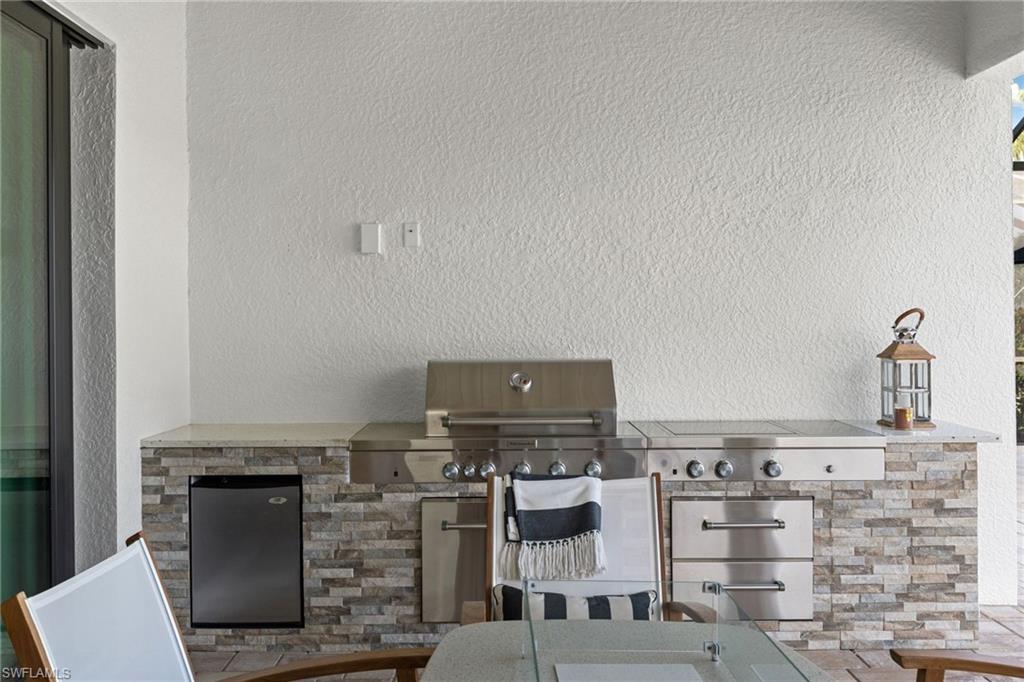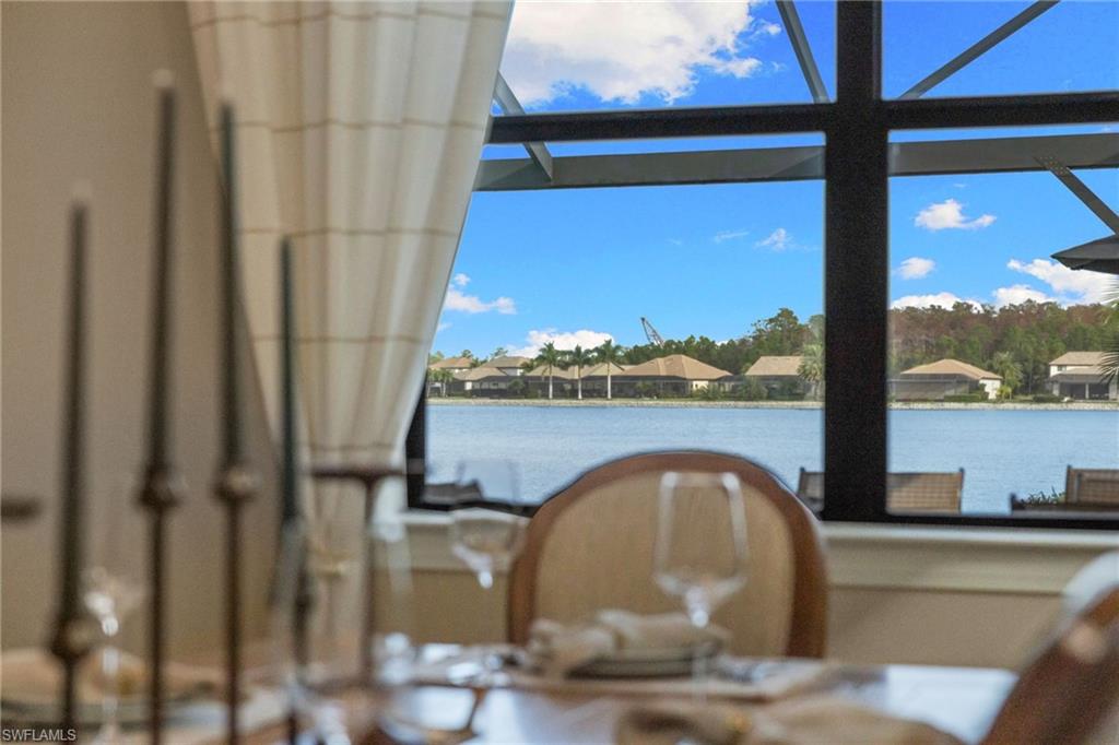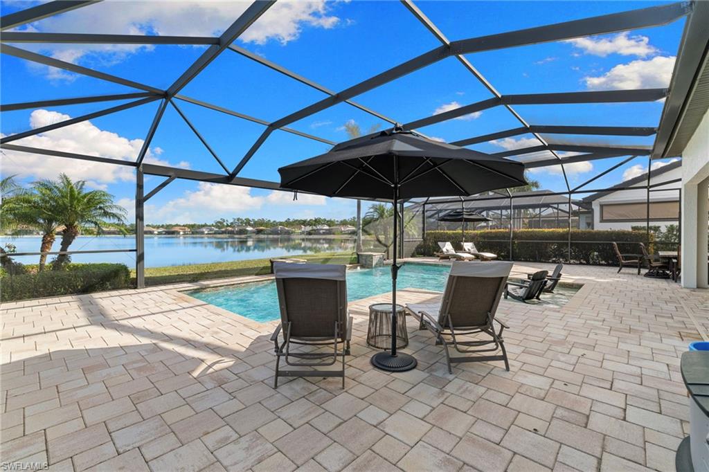 Rarely available Pinnacle model offering 3 bedrooms plus a den and 3 baths, positioned on a deep, oversized homesite found only on parcels along the main lake, showcasing one of the most desirable long-water views in the community. This impeccably upgraded home features hurricane impact glass, zero-corner pocketing sliders that disappear to create a seamless indoor–outdoor living experience, and a large custom pool with dual sheer-descent waterfalls and a sun shelf. The gourmet kitchen is outfitted with a Level 5 KitchenAid stainless steel appliance package, a custom stone-and-glass backsplash, and a large functional island perfect for everyday living and entertaining. Interior enhancements include custom closets, plantation shutters and designer window treatments, 5¼-inch baseboards, 8-foot door casings, a private den with glass French doors ideal for a home office, coffered ceilings with crown molding, and beautifully finished bathrooms, two of which feature glass-enclosed showers. An elevated exterior with bay windows and stone detailing enhances the architectural presence. The outdoor living space is exceptional, highlighted by a tongue-and-groove lanai ceiling, picture-window screen cage framing sweeping lake vistas, a summer kitchen, added paver pathways, an epoxy-finished garage floor, and low-voltage uplighting that showcases stunning curb appeal day and night. Located in the man-gated community of Corkscrew Shores, residents enjoy a resort-style environment without CDD fees, offering a lakeside pool and spa, modern fitness facilities, movement and wellness rooms, a wide range of sports courts, walking paths, a community fishing pier, and a boat launch designed for electric-powered watercraft and paddle sports, along with the on-site Captain’s Club restaurant and sports bar.