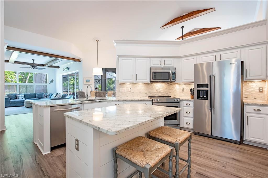 Enjoy gated community living with this completely reimagined residence in the desirable Autumn Woods community. Offering three bedrooms plus a den, two baths, and 2,265 square feet of living space, this beautifully updated home seamlessly blends modern elegance with an unbeatable North Naples location. Recent improvements include a new roof (2021), a powerful 4-ton AC (2024), a new hot water heater (2025), updated flooring throughout, fresh interior and exterior paint, refined carpentry throughout, decorative fireplace, Bahama/Plantation shutters and custom storage cabinets in the 2 car garage (new motor 2025). You will enjoy the renovated kitchen and baths, vaulted ceilings, decorative stone entryway, impressive outdoor spaces, new paver driveway/front entry, tastefully remodeled swimming Pool and Spa, expansive sun exposed pool deck for entertaining, thoughtful landscaping and beautiful lake view. Set within a community renowned for its top-rated Collier County schools, Autumn Woods boasts two pools, tennis and pickleball courts, clubhouse fitness center, and 26 acres of pristine preserves with scenic walking trails. Conveniently located just two miles from the white sand beaches and moments from Naples’ finest shopping and dining, this exceptional home offers a rare opportunity to experience quality, location, and lifestyle at its finest.