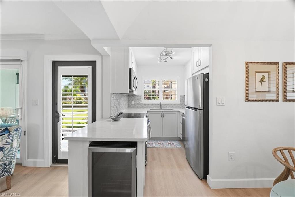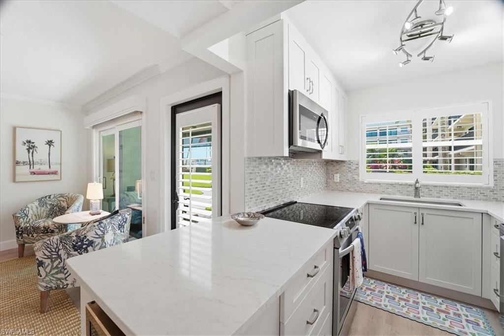 Discover the perfect blend of bayside tranquility and beachside elegance at Coquina Club, an exceptional Moorings address just one block from beautiful Vedado Beach and a peaceful stroll to Venetian Village without noise, crowds, or parking hassles. This updated first-floor end residence offers a versatile three-bedroom layout filled with natural light flooding in from the 2 additional windows on the west side of the home.The gourmet kitchen features stainless steel appliances, white shaker cabinetry, and plantation shutters. Coquina Club’s amenities elevate everyday living: a beautifully maintained saltwater pool with new pavers and patio furniture, refreshed landscaping, and renovated community spaces. Boat docks are available for an unheard-of $500 per year, and kayak slips for $150, with storage for kayaks, paddleboards, bikes, beach gear, and tools, plus a car wash area. Exceptional on-site management sets this community apart. Residents enjoy a warm, social atmosphere with activities ranging from book club and yoga to mahjong, bocce, weekly cocktail gatherings, and seasonal events. With beautifully maintained grounds, new exterior screens and railings, and quick access by boat to the Gulf, Coquina Club offers a lifestyle that’s both refined and delightfully low-maintenance—Naples coastal living at its best.
