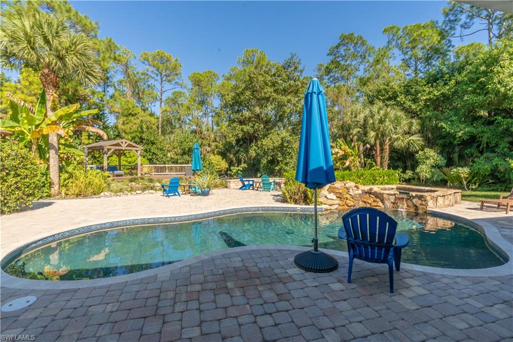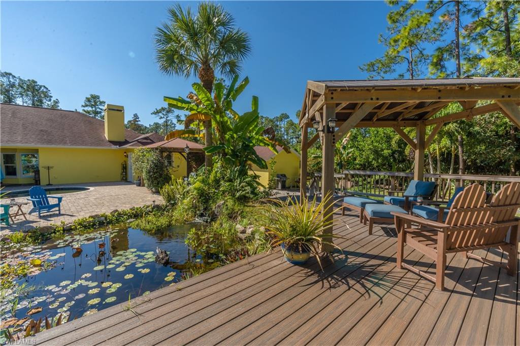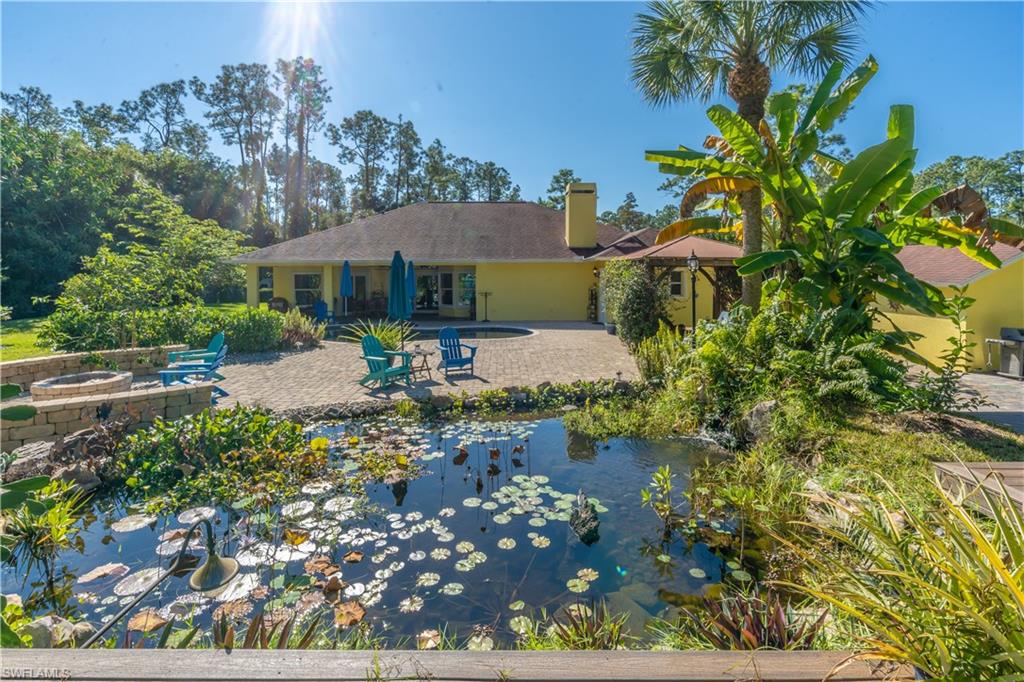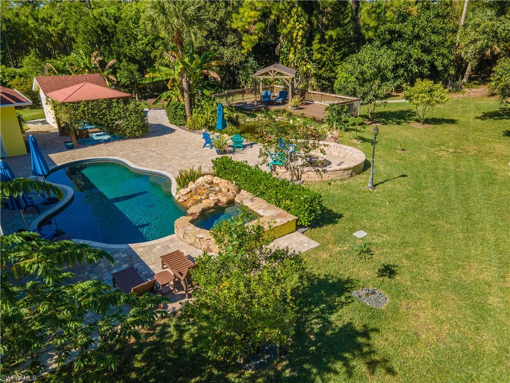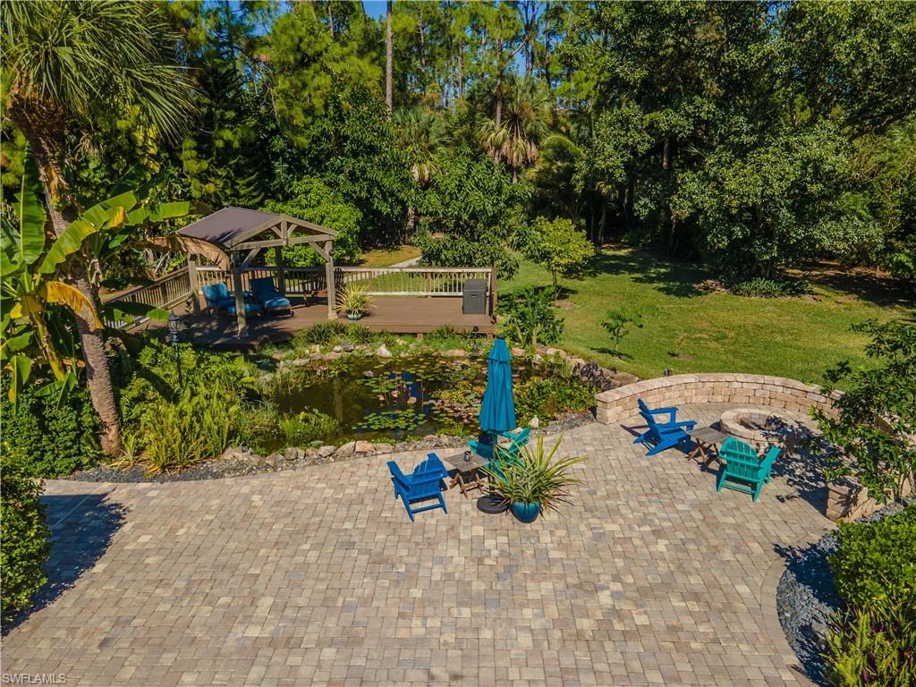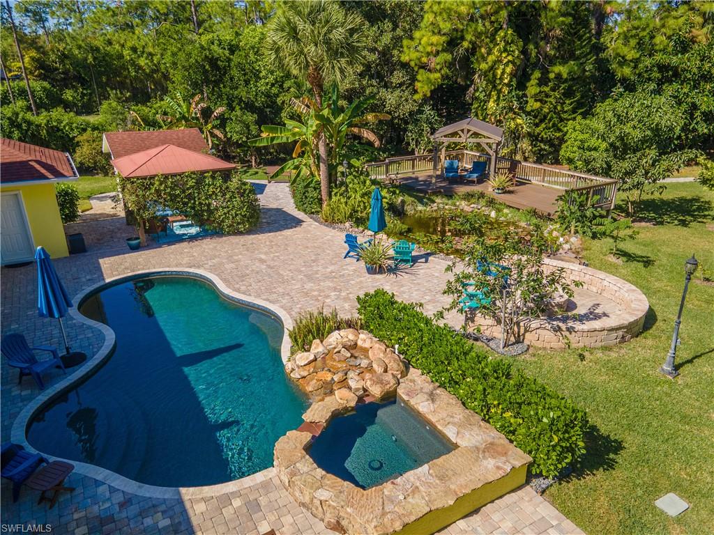 Welcome To Your Private Resort in Naples!!! Imagine waking up in a home where every detail has been curated for comfort, beauty, and independence. This estate blends modern upgrades with natural serenity: engineered wood floors, crown molding, hurricane-rated windows, and a chef’s kitchen with granite island, beverage center, and wine rack. Each of the three bedrooms is ensuite, with the master suite opening directly to the lanai and pool. Step outside to your own tropical resort. Over 4,000 sq. ft. of brick lanai and deck surround a heated Pebble Tec pool and spa. Two gazebos overlook a natural pond and waterfall stocked with tilapia, bass, and bluegill, while lotus flowers and water lilies float across the surface. Evenings are magical by the outdoor firepit, surrounded by bougainvillea, jasmine, and fruit trees including mango, avocado, fig, and mulberry. This property is more than beautiful — it’s resilient. A 21,000-kilowatt solar system with 13,000-kilowatt battery backup, whole-house reverse osmosis, propane storage, and EV charger provide true off-grid capability. Trails, a food forest, wildlife pond, and air rifle range make the back half of the property an adventure all its own. Here, you’re not just buying a home — you’re investing in a lifestyle of peace, natural beauty, and self-sufficiency, all within minutes of Naples’ finest shopping, dining, and beaches.