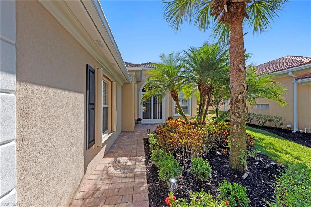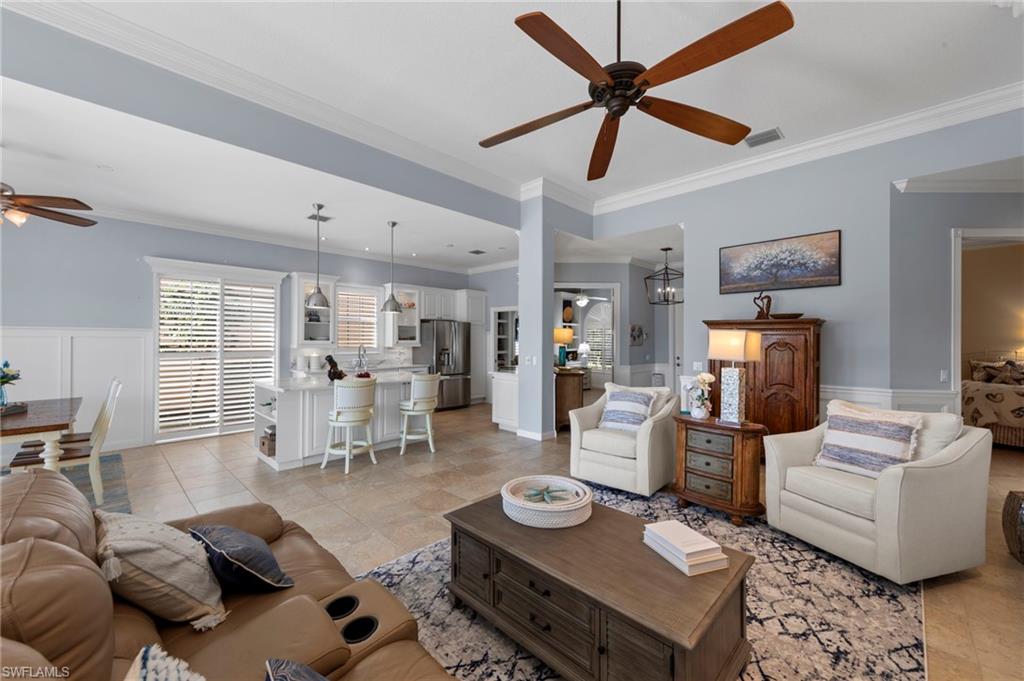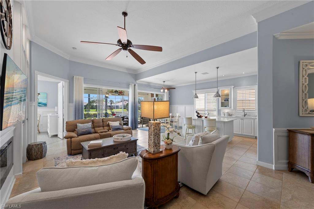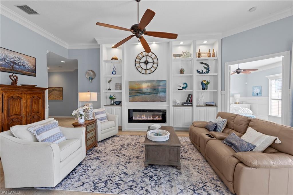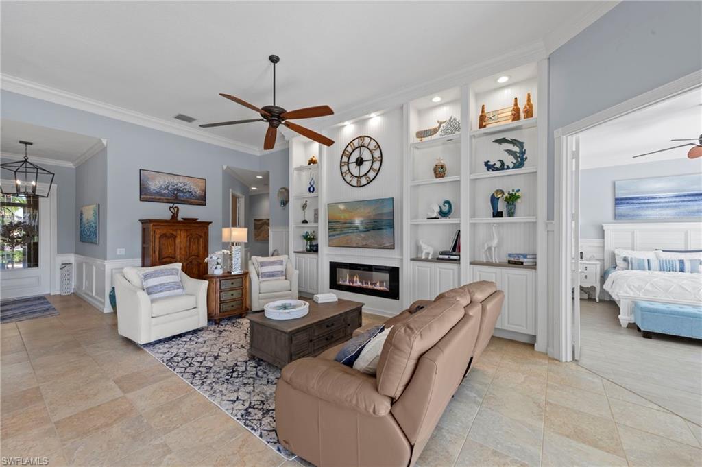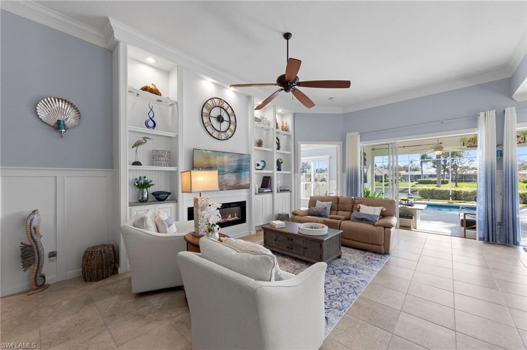 This is the home you’ve been waiting for. Perfectly positioned on a premium, east-facing lot, this exceptional Oakmont offers a private pool, a serene backyard setting, and sweeping water views. Three Bedrooms plus a den. From the spacious covered lanai enjoy a beautiful sunrise over morning coffee or afternoon cocktails around the fire pit wrapping up another glorious day. Thoughtfully maintained and lightly used, the home features a NEW ROOF and BRAND NEW AIR CONDITIONER, along with upgraded easy finger touch hurricane shutters & power hurricane curtains to quickly seal up your home. The interior has been tastefully updated with newer fans and lighting, $70,000 custom woodwork in every room, plantation shutters, and a striking custom wall cabinet with fireplace. The beautifully remodeled kitchen is a standout, featuring quartz countertops, quality cabinetry, upgraded appliances, and an oversized custom island ideal for gatherings. renovated guest bathroom adds to the home’s move-in-ready appeal. Designed for comfort and versatility, the expanded great room and open floor plan fill the home with natural light throughout the day. The layout includes three bedrooms plus a den, offering flexible space for a home office or guests. Select quality furnishings may be negotiable. Located in the highly sought-after community of Village Walk, residents enjoy resort-style amenities including multiple pools, a fitness center, bocce, pickleball, tennis, two on-site restaurants, a gas station, car wash, and miles of scenic walking paths. Cable, internet, and fiber optics are included in the HOA fees. Combining quality upgrades, a prime setting, and outstanding amenities, this home represents one of the most compelling opportunities in the community.