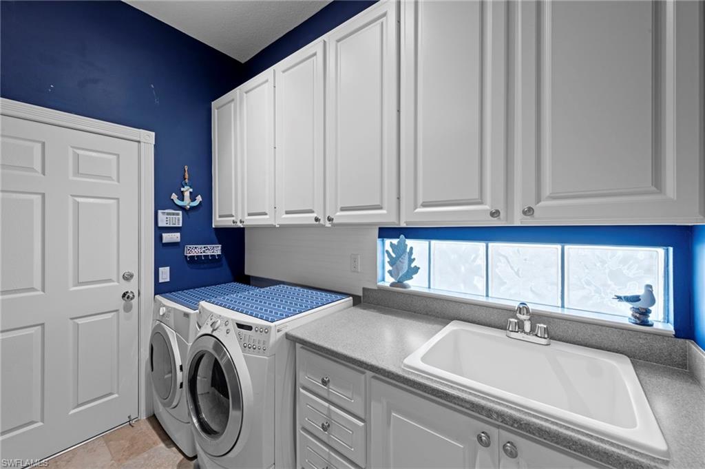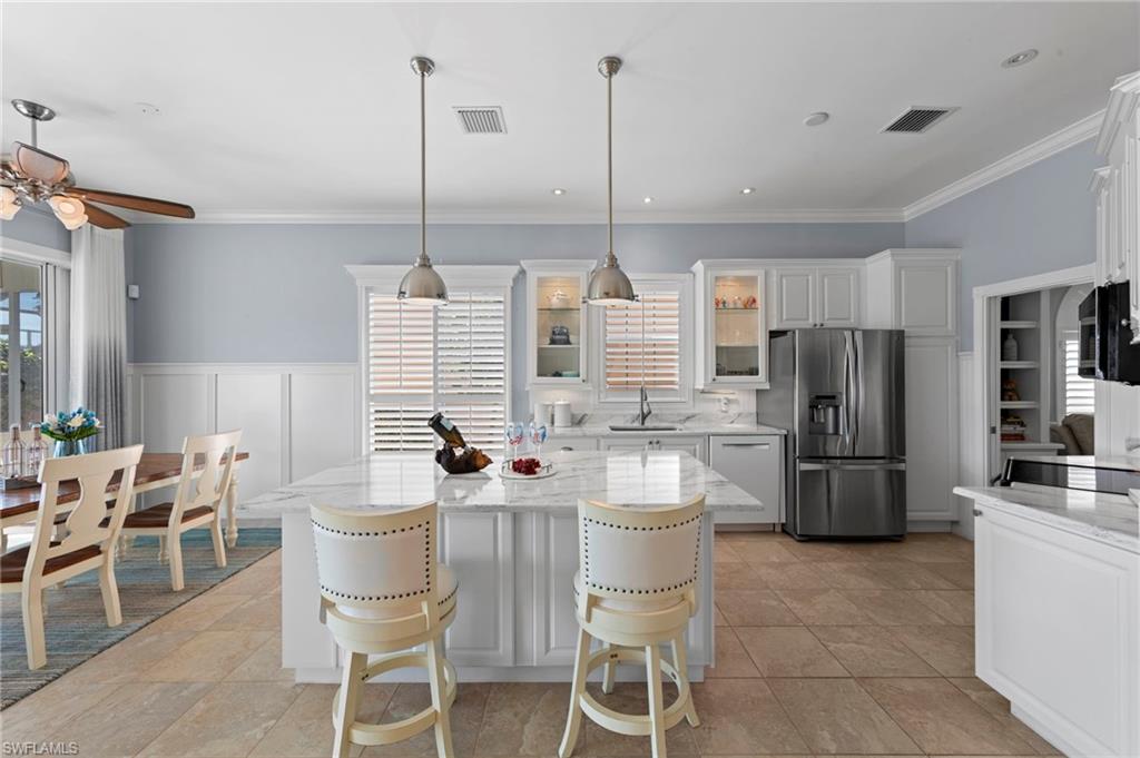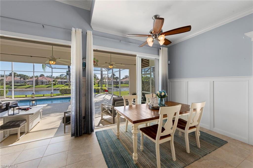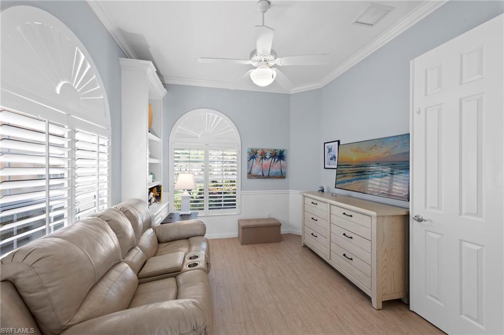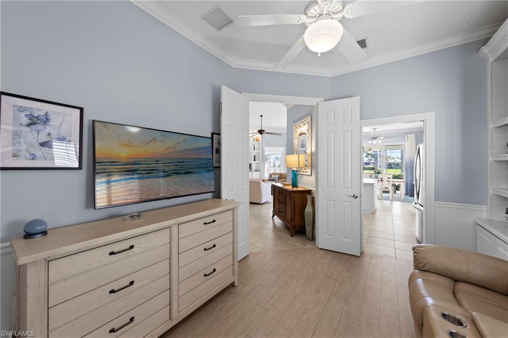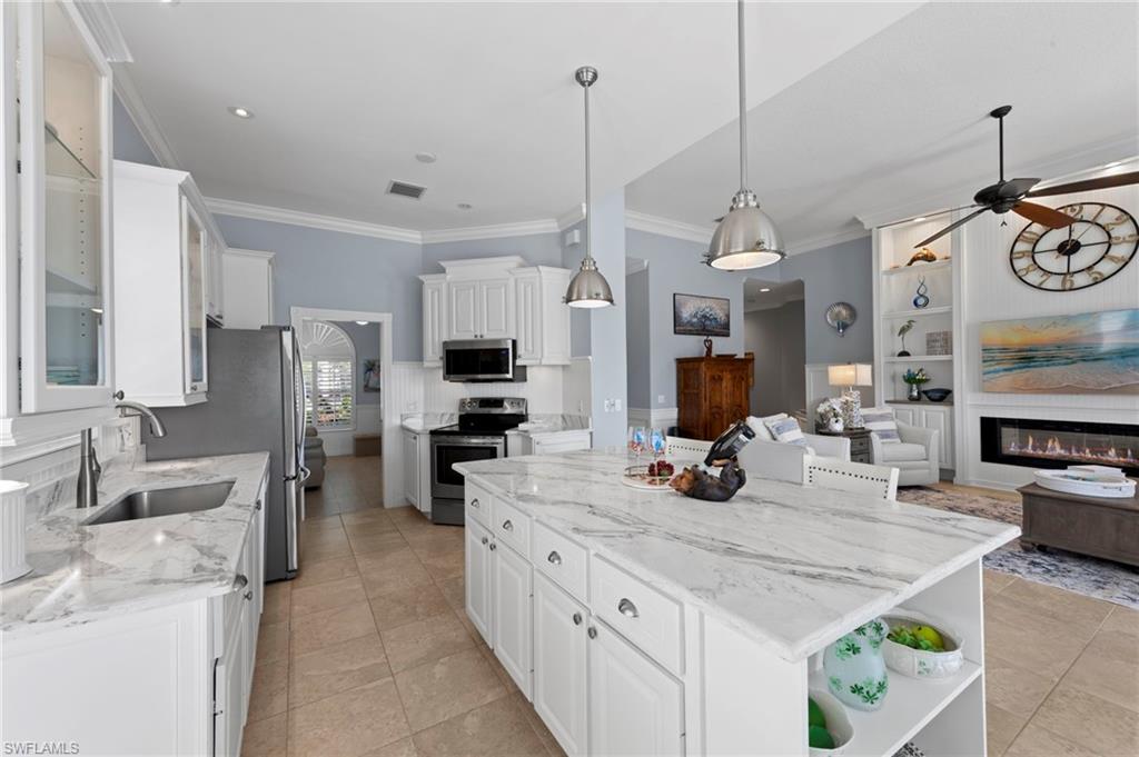 This is the home you’ve been waiting for. Perfectly positioned on a premium, east-facing lot, this exceptional Oakmont offers a private pool, a serene backyard setting, and sweeping water views. Three Bedrooms plus a den. From the spacious covered lanai enjoy a beautiful sunrise over morning coffee or afternoon cocktails around the fire pit wrapping up another glorious day. Thoughtfully maintained and lightly used, the home features a NEW ROOF and BRAND NEW AIR CONDITIONER, along with upgraded easy finger touch hurricane shutters & power hurricane curtains to quickly seal up your home. The interior has been tastefully updated with newer fans and lighting, $70,000 custom woodwork in every room, plantation shutters, and a striking custom wall cabinet with fireplace. The beautifully remodeled kitchen is a standout, featuring quartz countertops, quality cabinetry, upgraded appliances, and an oversized custom island ideal for gatherings. renovated guest bathroom adds to the home’s move-in-ready appeal. Designed for comfort and versatility, the expanded great room and open floor plan fill the home with natural light throughout the day. The layout includes three bedrooms plus a den, offering flexible space for a home office or guests. Select quality furnishings may be negotiable. Located in the highly sought-after community of Village Walk, residents enjoy resort-style amenities including multiple pools, a fitness center, bocce, pickleball, tennis, two on-site restaurants, a gas station, car wash, and miles of scenic walking paths. Cable, internet, and fiber optics are included in the HOA fees. Combining quality upgrades, a prime setting, and outstanding amenities, this home represents one of the most compelling opportunities in the community.