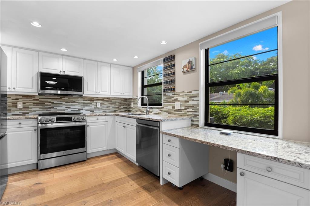 Located in the heart of beautiful Olde Naples, this elegantly updated 2BR/2BA residence in Oxford Court blends timeless charm with an extensive suite of modern luxury upgrades. Set within an intimate and impeccably maintained community, this first-floor condo offers rare peace of mind—having never experienced flood damage, even during recent major hurricanes. Its combination of location, condition, and resilience makes it an exceptional offering in today’s market. Inside, a light-filled interior showcases a spacious living room opening to a beautifully extended 29-foot recently updated lanai cage with anti midge screening (2024) overlooking the lushly landscaped pool area. A separate dining room and bright white kitchen create a warm, inviting flow ideal for entertaining or everyday enjoyment. Beautifully automated blinds(lithium battery) throughout enhance the refined coastal aesthetic. The expansive primary suite serves as a private retreat with a walk-in closet, dedicated dressing area, and en suite bath. The generous second bedroom easily accommodates a king-size bed—perfect for guests. Additional conveniences include an in-unit washer/dryer, covered parking, and a private storage locker. From 2023–2025, the home has undergone significant luxury enhancements: all-new kitchen appliances (2024) with transferable warranties, new washer/dryer (2024), LED lighting, USB-A/C upgraded outlets, heated towel warmers, new fans, new toilets/bidets, and updated furnishings. Hurricane-rated windows, doors, and sliders (2017) provide year-round security and insurance benefits. Exterior and structural upgrades include a new roof (2020), pool resurfacing (2022), new pool equipment (2022/2024), and comprehensive building stucco repair & full exterior repainting (2023/2024) supported by a Structural Engineer Certificate. Residents enjoy premium services including twice-weekly pool care, landscaping, pest control, termite contract, water/trash, annual dryer vent cleaning, and fire-safety inspections—all included. Furniture Turnkey. Subject to upcoming lease. Complete upgrade list available from listing agent. Combining Olde Naples charm, modern luxury, top-tier maintenance, and proven storm resilience, this residence is an exceptional opportunity—ideal for full-time living, a seasonal retreat, or a premium rental investment just moments from world-class shopping, dining, beaches, and parks.