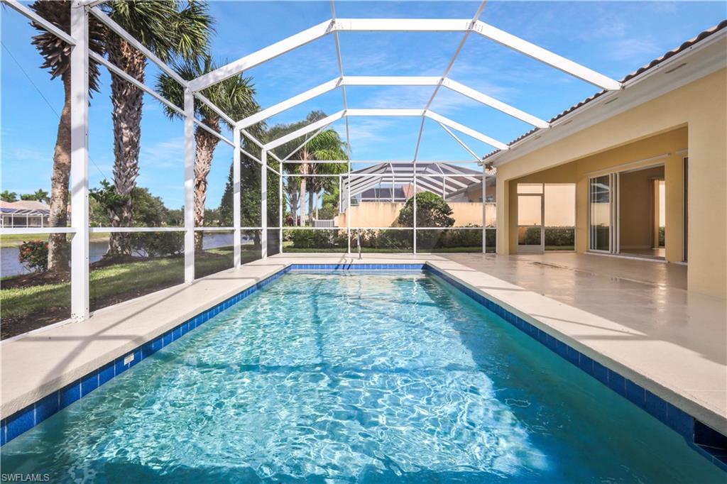 Welcome to paradise in this highly sought after DiVosta Built "Oakmont" model home. Features include, three spacious bedrooms, two bathrooms with split master suite hers and his units. There is also a versatile den or home office. From the minute you enter this charming home you look out though the double sliding glass doors to your backyard oasis. This opens up to a screened in lanai where you will enjoy the rectangular swimming pool and picturesque lake views. This home has been beautifully refreshed, with newly painted exterior and interiors. Upgrades include a brand new epoxied finished garage floor, a new microwave oven and a newly installed air conditioner system. The kitchen has solid surface counter tops and a generous amount of cabinets. The Master Suite offers a large walk-in closet and plenty of additional closets space for storage. Priced to sell and built to last. This Oakmont home was built with solid poured concrete construction. Rated one of the top communities, the resort style of Village Walk is just minutes away from sandy beaches, local shopping and an outstanding aria of quality restaurants. Village Walk also boosts of their fabulous " Town Center", which offers all residents an active social lifestyle. There are a multitude of amenities within the 24 hour secured guarded gated community, including a gas station, car wash, bagel shop, beauty shop, restaurant and facilities such as tennis, pickleball, basketball, bocce, playground, fitness center and a resort style pool and lap pool. All these amenities come alive with a social director on staff keeping residents engaged with clubs, games and many events. Village Walk is unique with its pretty butterfly gardens, miles of lakes, sidewalks, walkways over connecting bridges and wildlife galore. This pet friendly community is Florida living at its best, come and see for yourself.