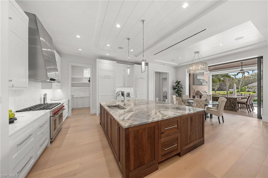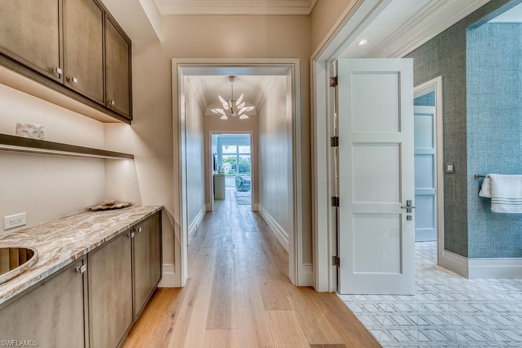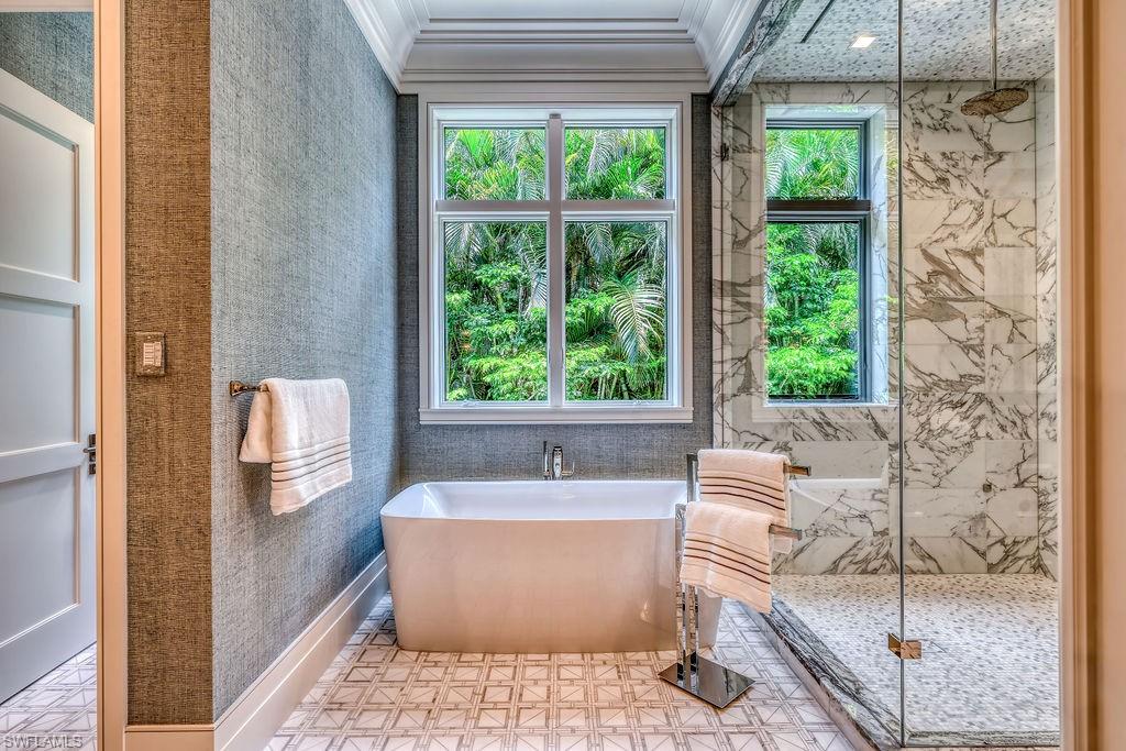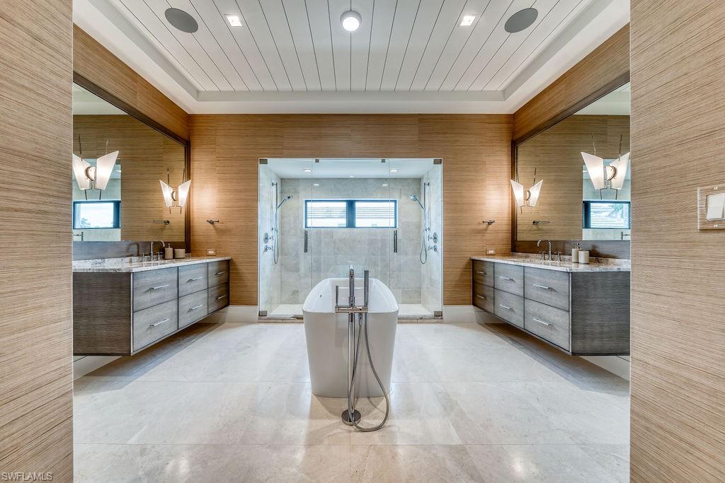 Key enhancements are underway to improve this already remarkable property!! Just beyond its stately front gates lies one of the most exciting New Construction opportunities on the market today. With 140 feet of water frontage this magnificent home built by A. Vernon Allen Builder can accommodate a large boat and provides no bridge access to the Gulf. Delivering a coastal-inspired aesthetic this home features a show-stopping 80-FOOT POOL AND SPA COMPLEX with a 3-sided infinity spill-over edge, linear fire features, sun shelf, Brazilian hardwood decking and an embedded firepit. Sliding glass doors fully pocket away for a seamless transition from the expansive outdoor area to a spacious interior which includes: 2 sumptuous primary suites (one upstairs and one downstairs), 4 guest suites, whole-home generator, thoughtfully placed wood accents, an elevator, built-in wine nook, Lutron lighting system with Control 4 automation, a steam shower and an extended lanai with an outdoor pool bath. This impressive property exudes quality and is enveloped by lush, tropical landscaping. With a cul-de-sac location providing extra privacy you'll feel as though you’ve entered your own secluded resort; a world unto itself.