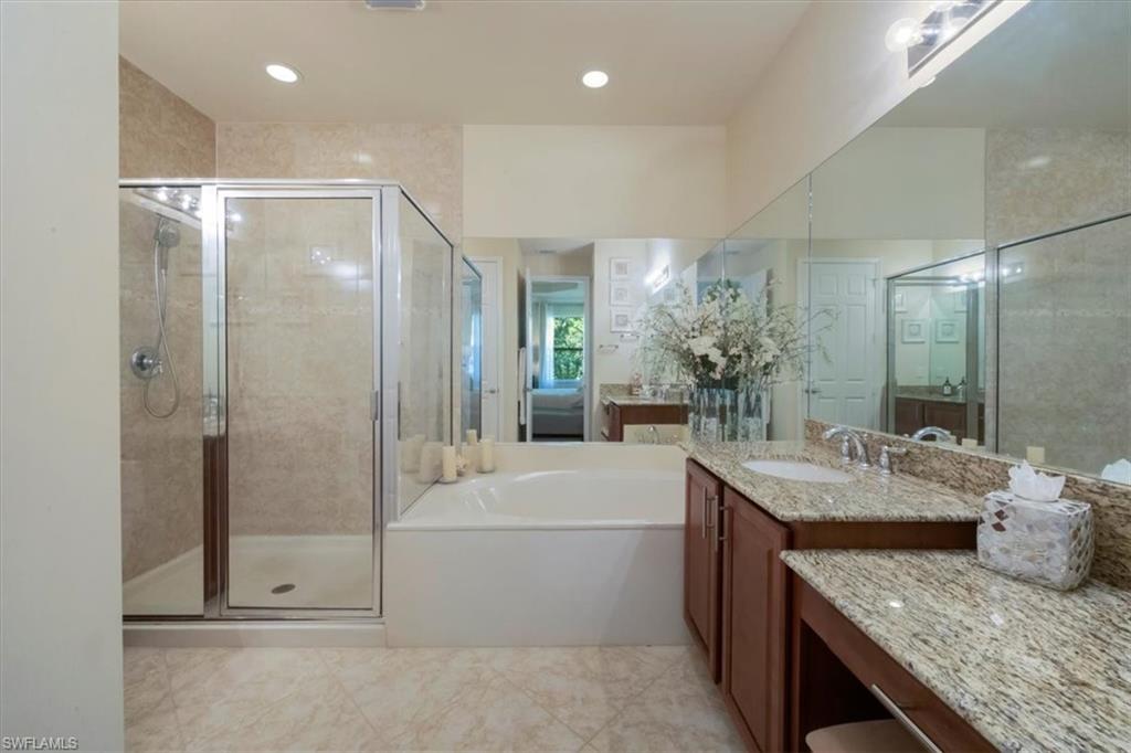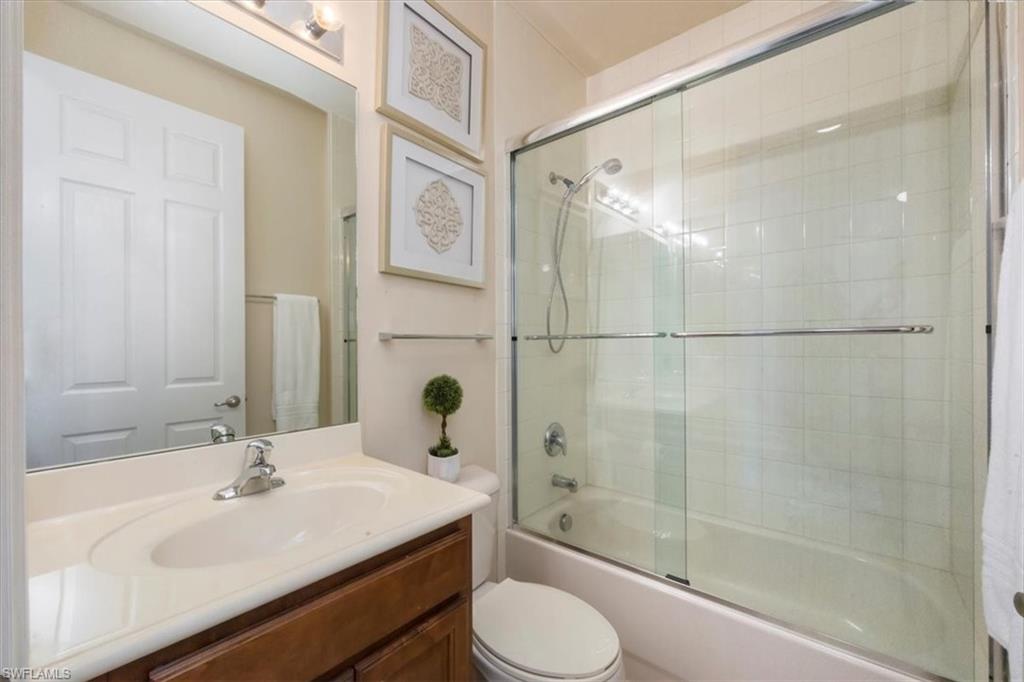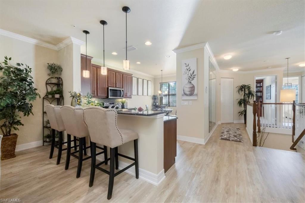 BRAND NEW luxury vinyl "wood look" flooring in the main areas of the condo, hot water heater, and disposal (November 2025). Welcome to this meticulously maintained 2nd-floor condo in the sought-after gated community of Marbella Lakes. Freshly painted and beautifully furnished with high-end decor (furniture package negotiable), this residence offers a spacious kitchen with warm wood-toned cabinets, a large pantry, stainless steel appliances, and a tiled backsplash. Enjoy versatile dining options with a breakfast bar, eat-in kitchen nook, and formal dining space. Upgrades include crown molding, updated lighting, and custom draperies and blinds. A guest suite doubles as a den with custom built-ins for a desk and storage. Relax on the private screened lanai with tiled floors. Community amenities feature a resort-style pool, splash pad, fitness center, clubhouse, three clay tennis courts, and four new pickleball courts. Conveniently located near shopping, dining, downtown Naples, and the Gulf of Mexico’s sunny beaches, just west of I-75—an ideal location for enjoying the Naples lifestyle.