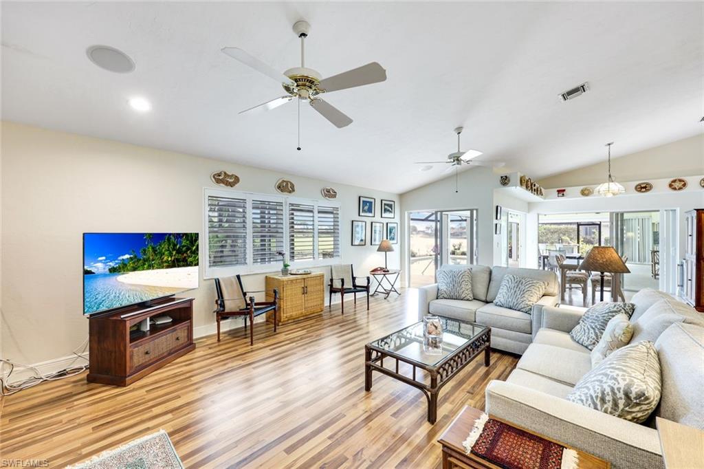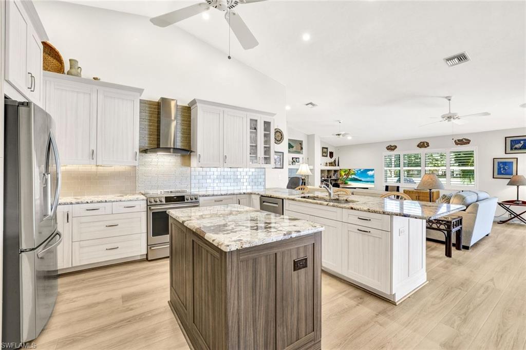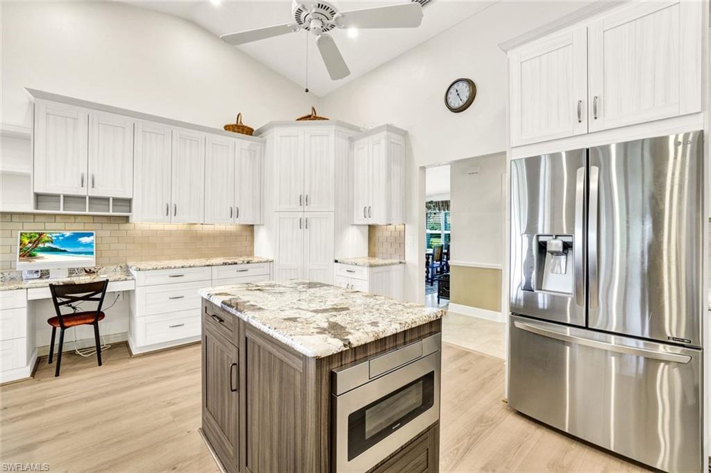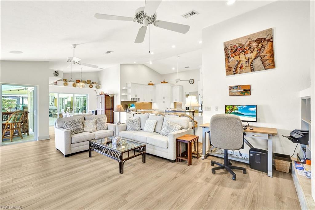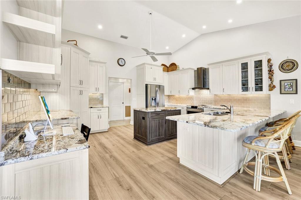 LOOK NO FURTHER…GORGEOUS 4BR/3BA POOL home, located in Spanish Wells Golf & Country Club is sure to impress! Adorned by lush landscaping and MINUTES to the Gulf, situated on an oversized lot with lake AND golf course views...THIS is what SWFL living is about! Home boasts a 500 gallon propane tank AND whole house generator (2024), newer AC units (2024 & 2022), newer tile roof (2021), TWO newer hot water heaters (2021), newer lanai screens including panoramic screen (2018), vaulted ceilings, stunning pool with HUGE lanai for entertaining, hurricane impact windows and doors, electric hurricane shutters on lanai and front entry AND SO MUCH MORE!!! Spend warm, leisurely days floating in your private pool while admiring the views. Relax by the wood-burning fireplace on those cool winter nights. Prepare your favorite meals while enjoying serene lake views in your COMPLETELY REMODELED kitchen with BRAND NEW luxury vinyl plank flooring. In the evenings, retire to your primary retreat, also overlooking the pool. Upgraded primary bathroom offers PLENTY of room for two. Additional guest bedrooms are privately tucked away from the main living areas. Home includes a 4th bedroom off the primary suite, currently being utilized as a den. Additional highlights include a two-car garage with fresh epoxy flooring plus a separate golf cart garage with private entry. THIS is the PERFECT home in the PERFECT location – MINUTES to Bonita Beach AND Downtown Bonita Springs. The burgeoning Downtown Bonita Springs boasts eclectic restaurants, coffee/wine bars, craft cocktail bars, craft breweries and a new music venue. The arts are alive in Bonita, with plenty of festivals, artist cottages, music in the downtown amphitheater - all just a short bike ride from this home. PLUS, just a short drive to 5th Avenue in Downtown Naples, RSW International Airport, shopping, grocery AND MORE. For an additional fee, you can purchase a social or golf membership to Spanish Wells Country Club. DO NOT miss YOUR opportunity to experience all that Bonita Springs has to offer, not only in a community, but especially in a home.