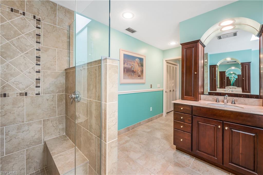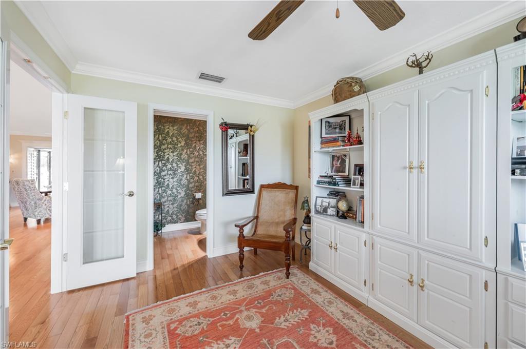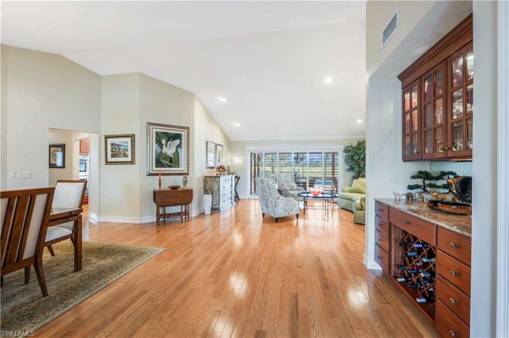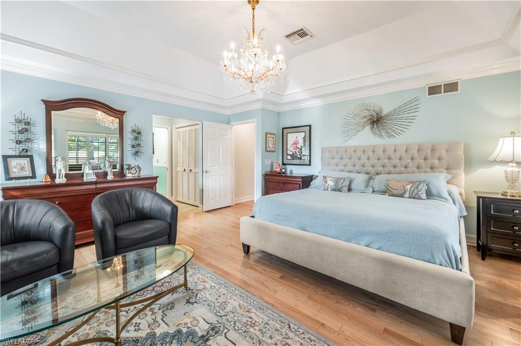 BIG WATERFRONT & Absolutely the best water & golf course views in the community. Custom modified floor plan to showcase endless water & golf course views, dramatic ceiling height, an expanded open granite kitchen with dual wall ovens, center island with a convenient height warming drawer, elevated dishwasher, built-in desk & rich wood cabinets; 3.5 baths (to include a pool bath), impact windows & limitless possibilities in approx. 2,900 sq. ft under air. The Photos are labeled to highlight all the features in this estate residence to include: ceilings to 16 feet, single & double crown molding, light neutral granite & marble throughout, built-in fireplace, built-in lighted bar, disappearing sliding doors, Plantation shutters throughout, frameless glass showers, brick paver pool deck, NEW high efficiency 142,000 BTU heater for pool & spa, NEW pool pump, NEW water heater, PLUS.......... only 6 houses from the golf club. Xfinity Cable & high speed internet are included in the HOA fees. This is a special home in the community that offers a close proximity to the club yet great privacy... Master bath is 21' x 12' including 2 closets. Covered lanai with storm shutters and a full bath is 32' x 12'. NEW pool heater, NEW pool filter, NEW main water heater. Best viewing options at dusk to enjoy the natural wildlife with an array of exotic Florida birds.