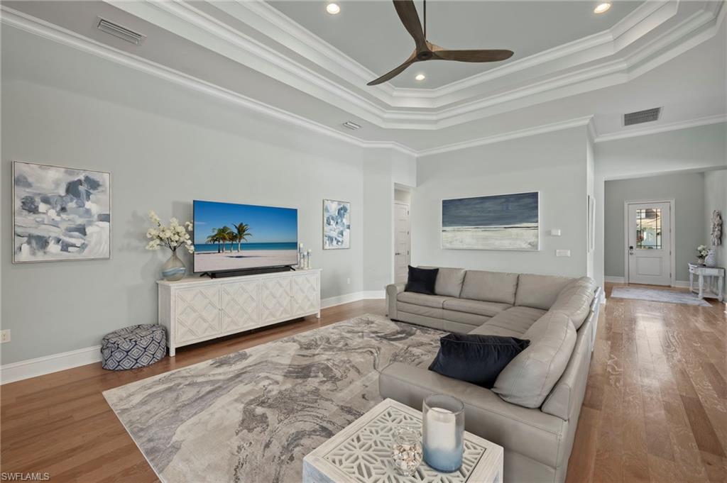 Do you like green space, grassy areas? This home has it. Located on a large corner lot with no next door neighbor to the right. (See the pictures) This spacious home is characterized by its open plan that flows from one living space to the next. Great room concept with a high double tray ceiling measuring 12 to 14 feet high. The kitchen features a large quartz island that merges with the great room. Lots of breakfast bar and entertaining space here. There is a neat pass through sliding window that opens to the outdoor kitchen and dining space. Having a formal dinner/event? You'll going to love the dining space that is accented by a wall of windows (check out the pics). Being in Florida, you're going to love the deluxe pool and spa that overlooks a pond and natural landscaping. The den is smartly located with French doors for privacy. 3 Well-sized bedrooms all having a full bath access. The master suite offers 2 walk-in closets, a step down shower and dual sinks. Hardwood floors throughout, quartz counter tops, top end white kitchen cabinetry and a huge green space corner lot. The Isles is situated on 2400 acres with much of it dedicated to Natural Habitats. Residents enjoy Luxury Amenities at the Isles Club which was modeled after the original Naples Beach Hotel of the late 1800's! The Overlook Bar and Grill is located on the water's edge. Pickleball and tennis and bocce ball courts, Kayaks and Paddle boards are provided. There is a lap and community pool and spa, sauna, modern full size gym, yoga and more! ICP is ideally located less than 5 miles from downtown 5th Ave and the beaches, combined with Low HOA fees make this one of the premiere locations in all of Naples.