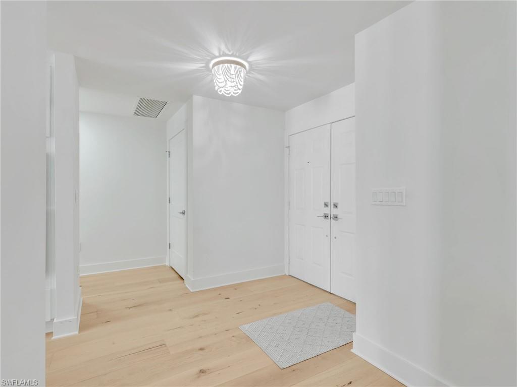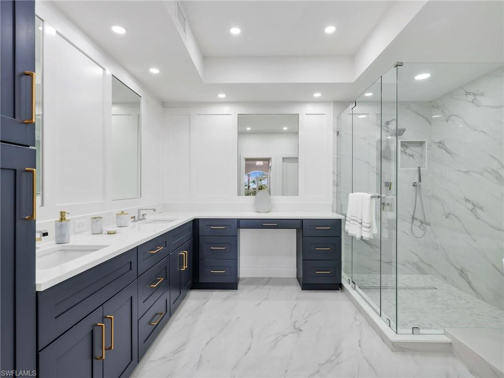 Discover an exceptional opportunity to enjoy Naples living in this fully renovated and beautifully designed residence located within the prestigious Audubon Country Club. Offering 2,578 square feet of interior space, 9 foot ceilings throughout, 3 generous sized bedrooms each with its own private balcony, a fully enclosed den, 3 and 1/2 bathrooms, and a 2-car garage with a dedicated golf cart bay and freshly painted floors, walls, and ceilings. The lanai has also been freshly painted and features new upgraded tile flooring. This bright and spacious home within the gated and patrolled community showcases a completely redesigned kitchen with custom full-overlay cabinetry, quartz countertops, premium appliances, under-cabinet lighting, and an oversized island with breakfast bar. The dining and living areas are enhanced by wide-plank white oak hardwood flooring throughout the entire home, elegant tray ceilings, new recessed lighting, and abundant natural light. The bedrooms and bathrooms have been fully upgraded with new two-panel doors and hardware, modern plumbing fixtures, porcelain tile, and a luxurious primary suite offering a walk-in closet, freestanding soaking tub, dual vanities, and a large glass-enclosed shower. Additional improvements include new AC venting and fans, updated electrical, a new hot water tank, and all new modern lighting fixtures. Enjoy a view of Hole #1 from the balconies, and access to exceptional community amenities including a completely renovated 35,000 sq. ft. Clubhouse with full-service dining options, newer clay tennis courts, bocce ball areas, pickleball courts, kayaking adventures, a state-of-the-art fitness center, poolside club and café, a scenic bayside boardwalk, and residents are able to immediately purchase a golf membership. Located just minutes from Gulf beaches and the new Paraiso Beach Club, which is currently offering a discounted initiation fee until completion, as well as a shuttle service within walking distance of this condo. This completely reimagined and move-in-ready home offers luxury, convenience, and the best of the Southwest Florida lifestyle from day one.