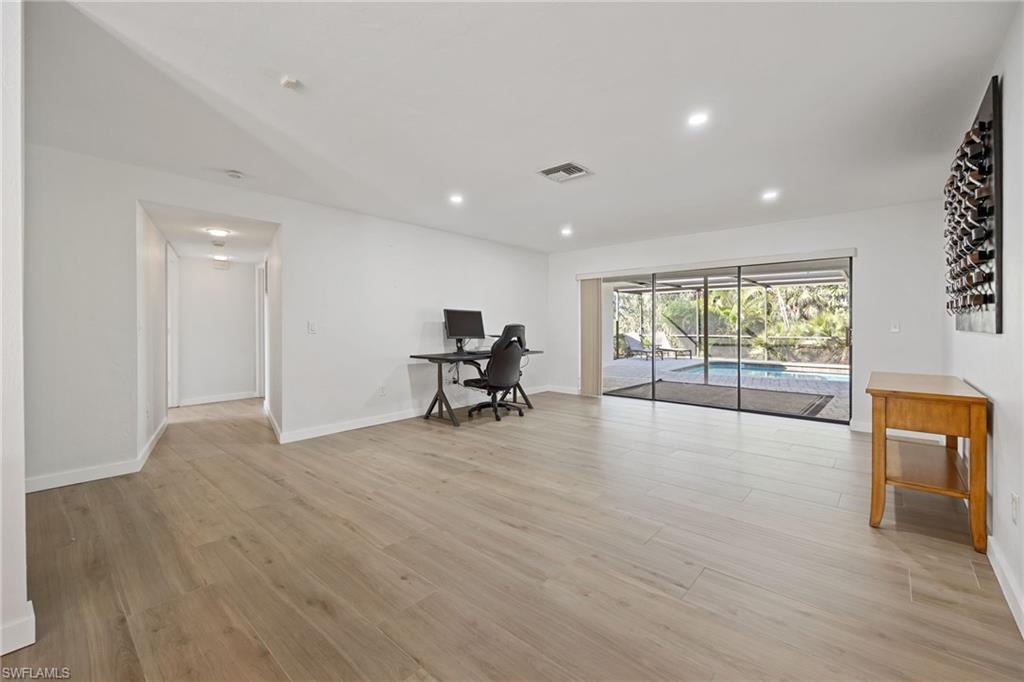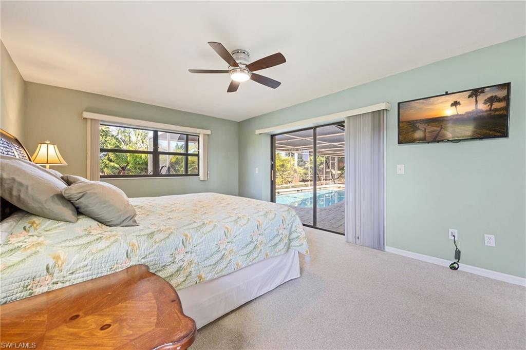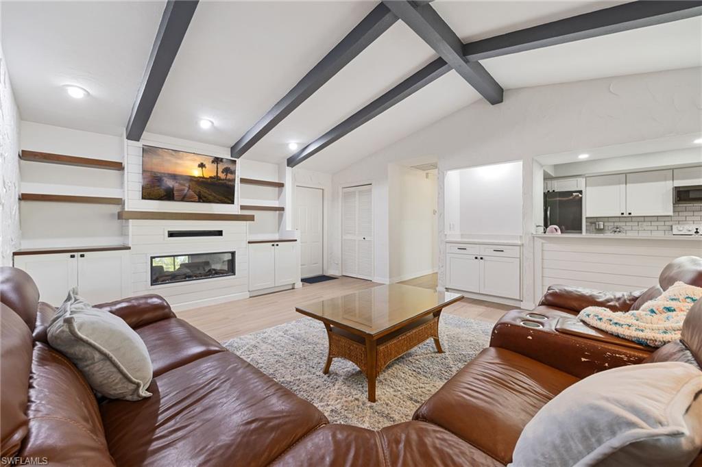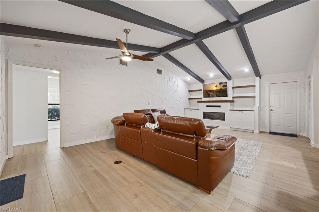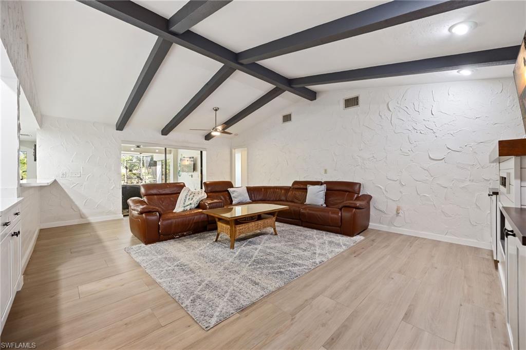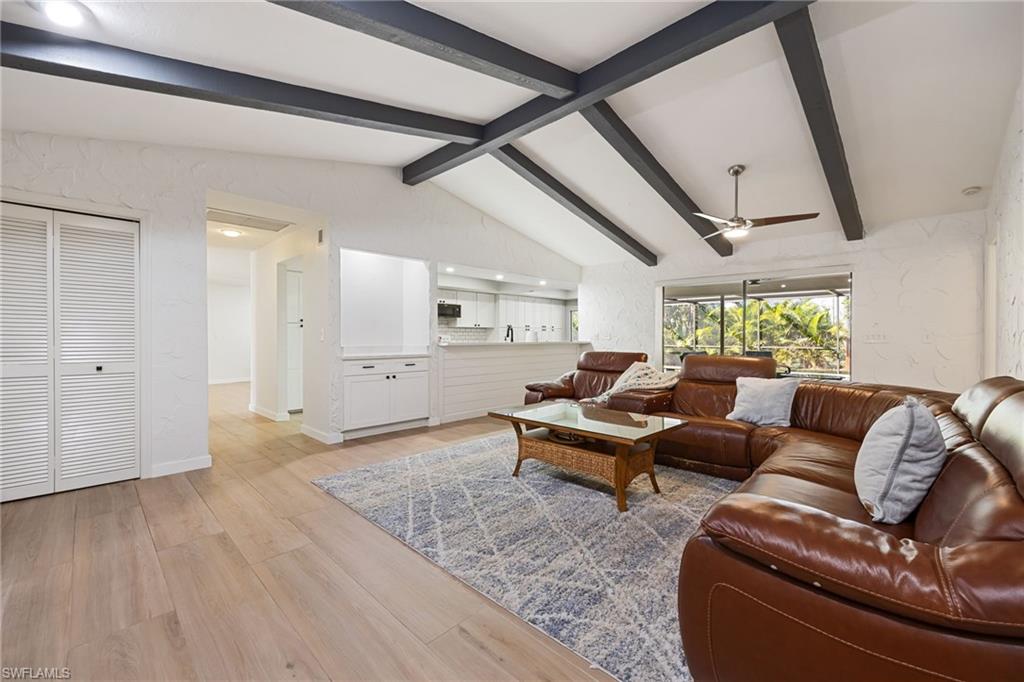 Updated golf course pool home with solar in gated Spanish Wells. This 4-bedroom + den, 3-bath, 3-car garage residence offers approx. 2,838 sq. ft. of living area with long golf and landscaped views. Since 2021 the owners have added a whole-house solar system (2022), new HVAC with ductwork (2022), a remodeled kitchen (2021), new tile flooring in the main living areas (2022), an updated electric fireplace feature wall (2022), epoxy-coated garage floor (2023), fresh interior paint, upgraded toilets, new carpet in a guest bedroom (2025), new rollers on sliding doors (2024), plus a new refrigerator (2025) and microwave (2021). Earlier updates include a 2018 roof, updated plumbing, resurfaced pool, and paver pool deck. Enjoy a screened, heated saltwater pool, spacious covered lanai, and plenty of room for entertaining. Spanish Wells offers optional membership with 27-hole golf, dining, tennis, pickleball, fitness center, and resort-style pool, along with 24-hour gated security. Convenient Bonita Springs location close to beaches, shopping, dining, and RSW. Home is offered unfurnished.