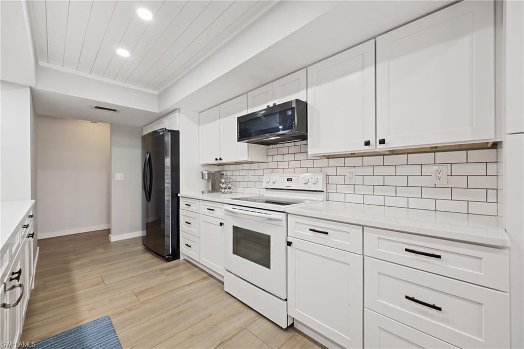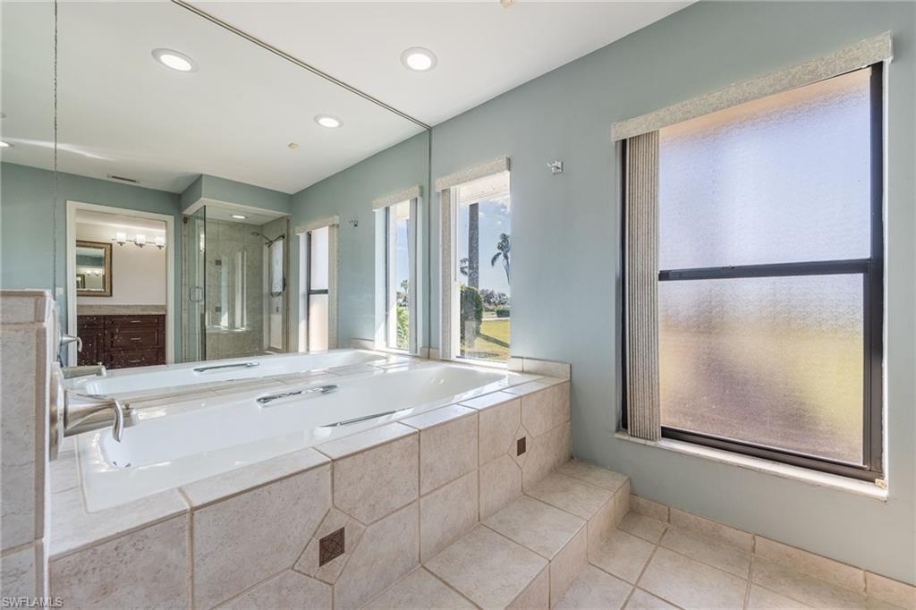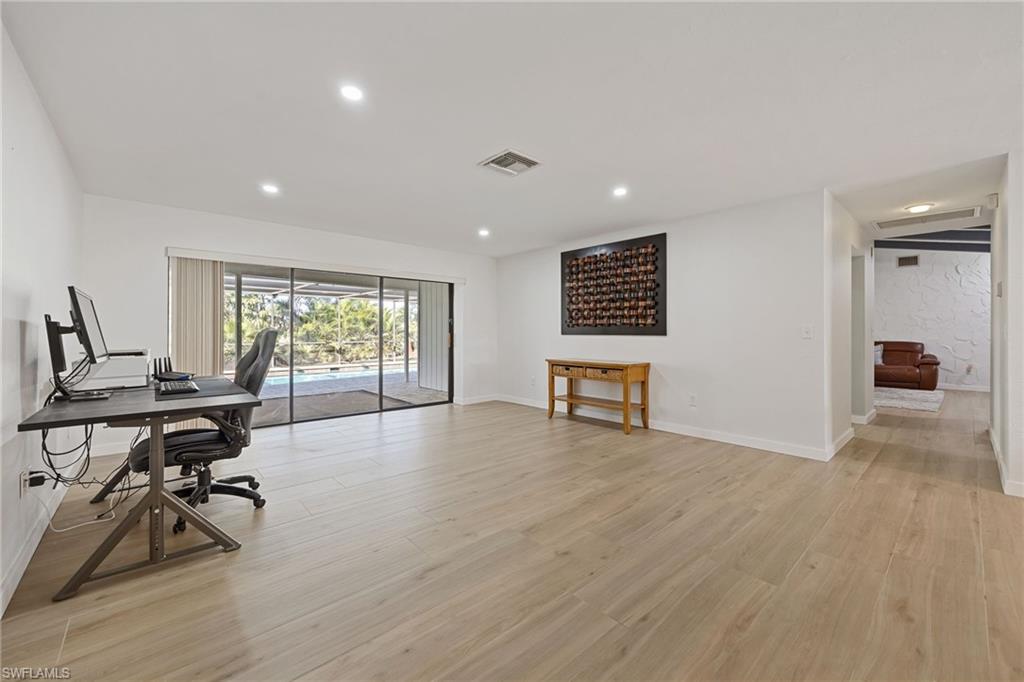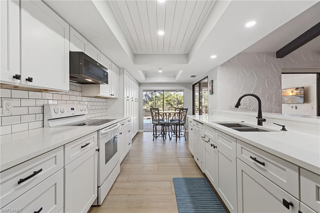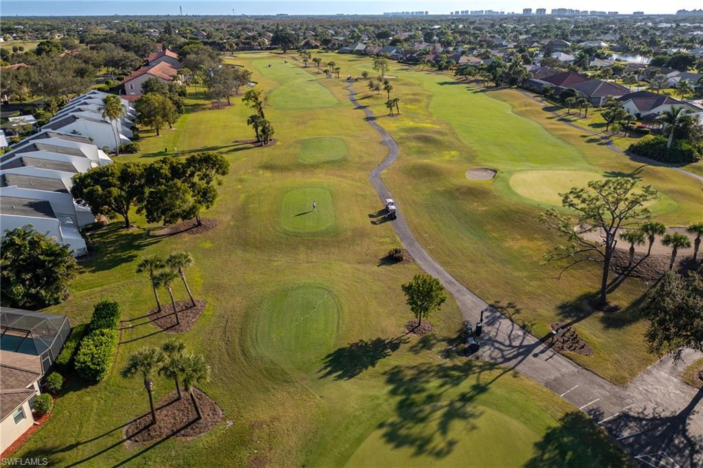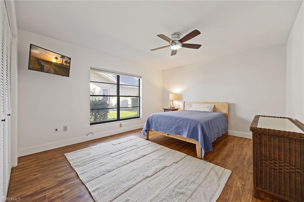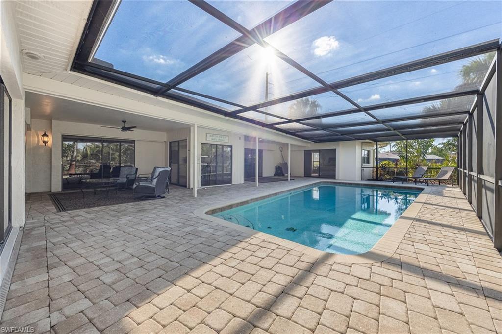Updated golf course pool home with solar in gated Spanish Wells. This 4-bedroom + den, 3-bath, 3-car garage residence offers approx. 2,838 sq. ft. of living area with long golf and landscaped views. Since 2021 the owners have added a whole-house solar system (2022), new HVAC with ductwork (2022), a remodeled kitchen (2021), new tile flooring in the main living areas (2022), an updated electric fireplace feature wall (2022), epoxy-coated garage floor (2023), fresh interior paint, upgraded toilets, new carpet in a guest bedroom (2025), new rollers on sliding doors (2024), plus a new refrigerator (2025) and microwave (2021). Earlier updates include a 2018 roof, updated plumbing, resurfaced pool, and paver pool deck. Enjoy a screened, heated saltwater pool, spacious covered lanai, and plenty of room for entertaining. Spanish Wells offers optional membership with 27-hole golf, dining, tennis, pickleball, fitness center, and resort-style pool, along with 24-hour gated security. Convenient Bonita Springs location close to beaches, shopping, dining, and RSW. Home is offered unfurnished.