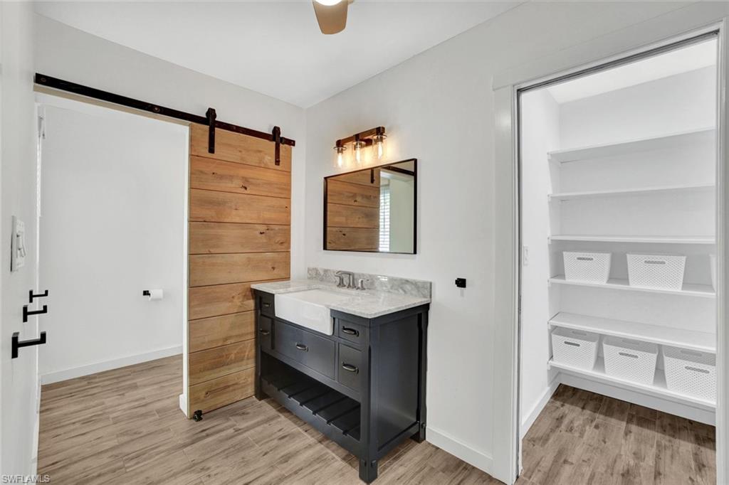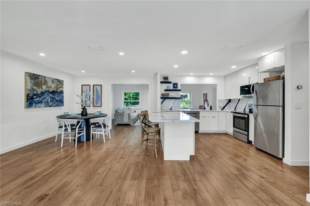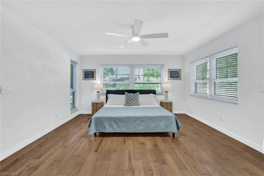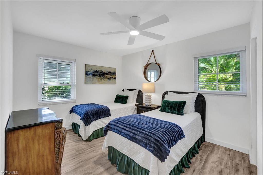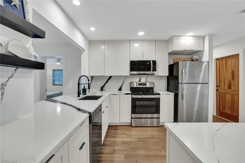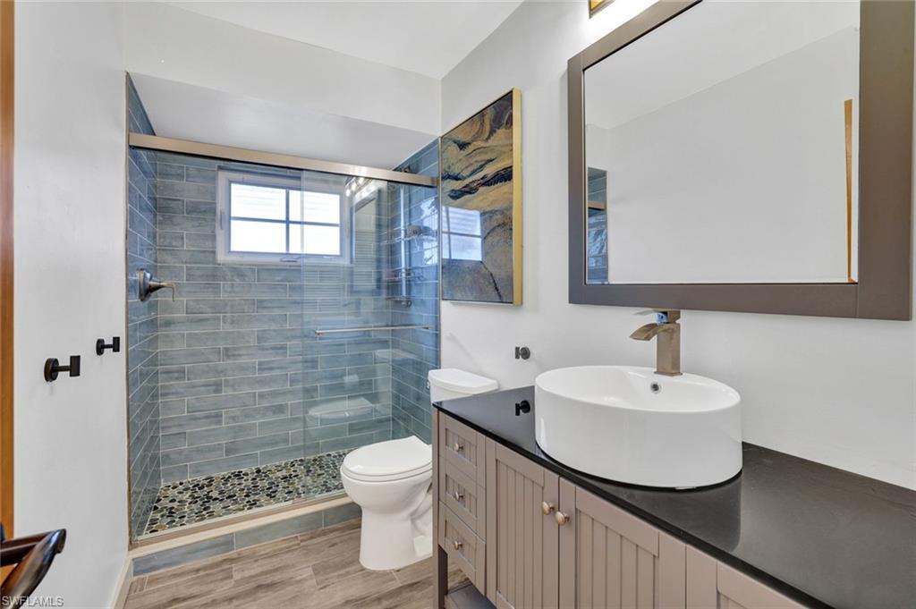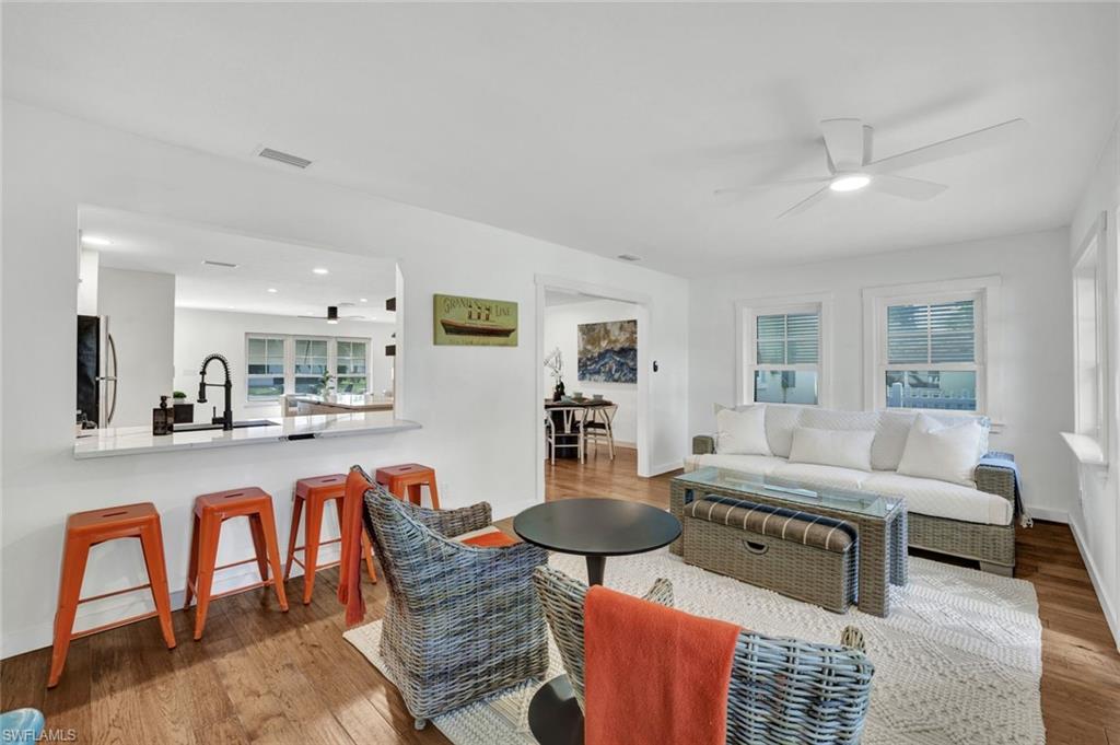 Fabulous opportunity to own a move-in-ready home in Bonita Shores, 1.2 miles from Bonita Beach. A community west of 41 in the NW corner of Collier County. You can also walk or ride bikes to Barefoot Beach or top-rated local restaurants and bars. This community has no HOA fees or rental restrictions, and the home has the ability to join the Bonita Shores Boat Ramp club for a small annual fee, providing gulf access and no bridges. Large, sprawling ranch with 3 bedrooms plus a den and a formal living room plus a bonus family room. This house checks off all the boxes. Currently furnished to sleep 10. Huge fenced-in backyard entertainment area and an outdoor enclosed 3rd shower (2 indoor and one outdoor). The beautifully remodeled kitchen boasts new cabinets and quartz countertops, bathrooms with tiled showers, wood-look ceramic tile floors, and a large 2-car garage. The family room has a pull-out queen sofa bed, and the office is fitted with a queen bed as well. This home would make a fantastic seasonal rental.