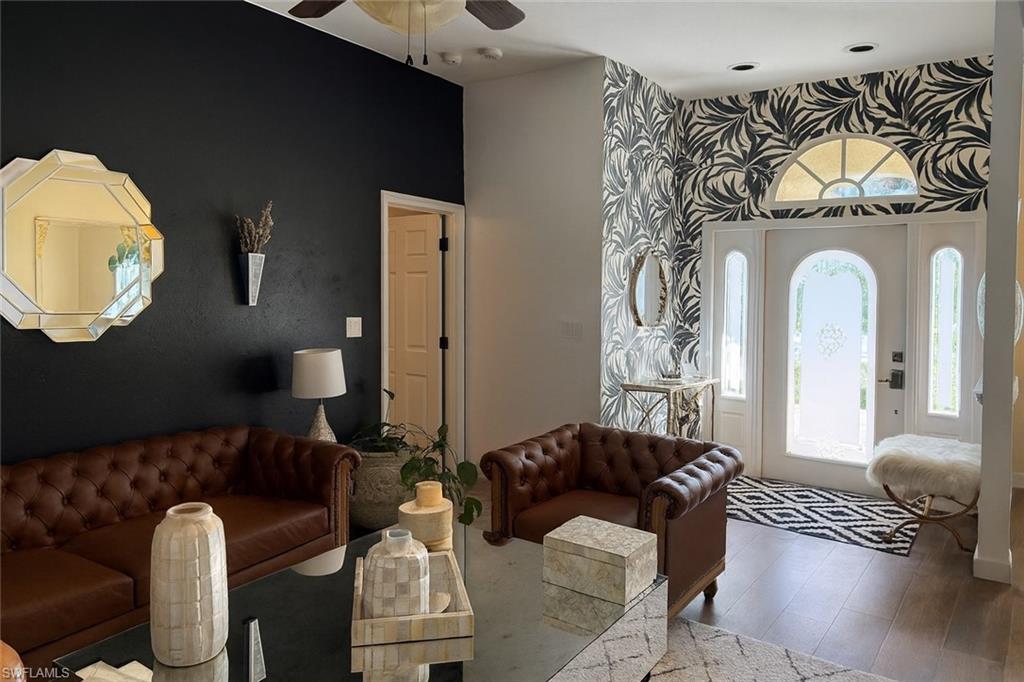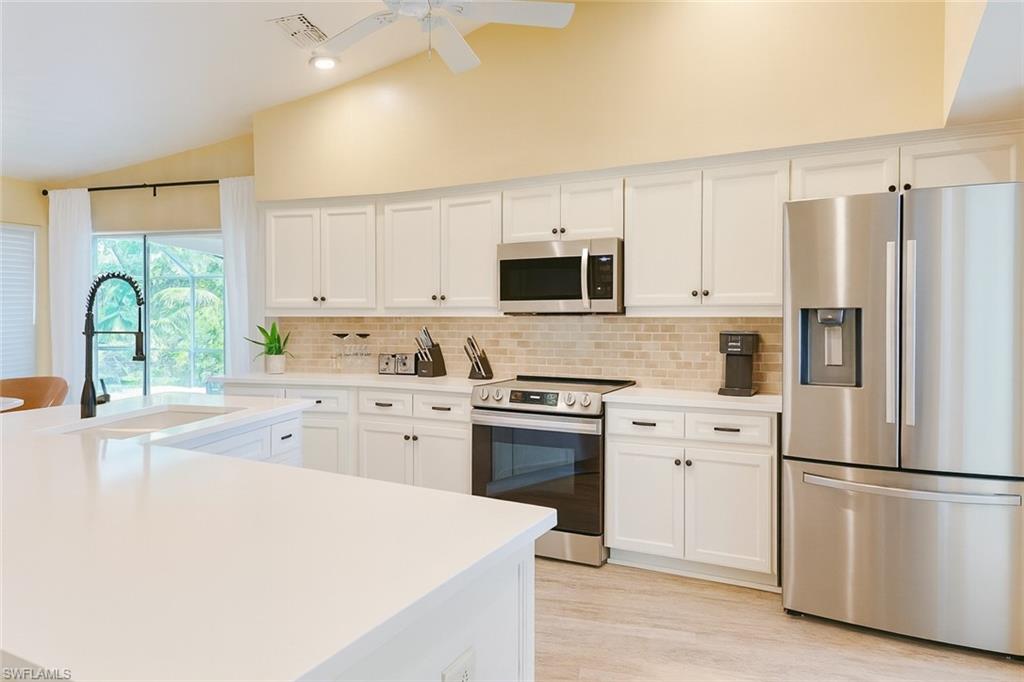 Step into this former builder's model that showcases a beautifully created interior and thoughtful upgrades throughout. Wide-plank luxury flooring, designer lighting, and stylish furnishings, creating immediate sense of warmth and quality as you enter. The home is being offered fully furnished, with pieces that complement the design and layout perfectly-truly move-in ready. The kitchen was remodeled prior to ownership and feature, soft-close cabinetry, quartz countertops, and matching stainless Samsung appliances. The primary suite includes double vanities, a walk-in shower, and a separate soaking tub. Unlike many homes in Fountain Lakes, this property offers 2.5 bathrooms for added convenience. One of the most appealing features is the oversized, exceptionally private lot, offering a peaceful outdoor setting ideal for relaxing or entertaining. Recent improvements over the past few years include an AC system and Samsung washer from 2021, refreshed front landscaping, and professionally painted/sealing of the lanai cage, pool deck, driveway, and walkway. The home also benefits from an updated pool filter and all new PVC plumbing throughout, providing long-term peace of mind. Meticulously maintained and beautifully appointed, this home blends comfort, privacy, and style in one exceptional packaged. A standout opportunity in Fountain Lakes.