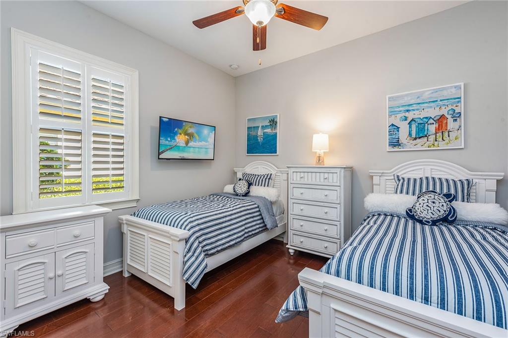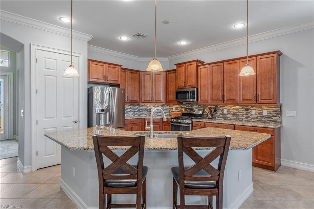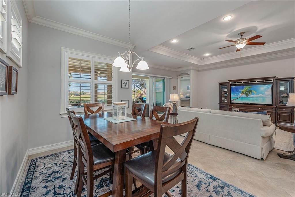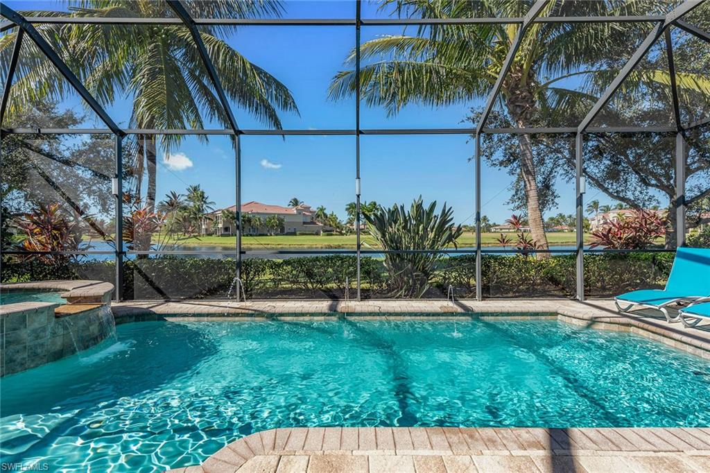 Experience serene lakeside living in this beautifully maintained residence in Amador at Fiddler’s Creek, offering western exposure, tranquil water views, and lush tropical landscaping. This single-family pool and spa home combines comfort, elegance, and modern upgrades throughout, featuring 3 bedrooms plus a den, 2 full baths, and a 2-car garage. Furnishings are available and negotiable. A wide brick paver driveway and inviting entry set the tone for the refined interior, where an open great room floor plan, crown molding, tray ceilings, plantation shutters, diagonal tile flooring, arched walkways, and recessed lighting add warmth and sophistication. The open kitchen is designed for both function and style, showcasing quality cabinetry, granite countertops, a mosaic tile backsplash, under-cabinet lighting, a pantry, pendant lighting over the island with breakfast bar, and stainless-steel appliances, including a gas range, French-door refrigerator, newer microwave, and dishwasher. A nearby formal dining space creates effortless flow for everyday living and entertaining. The great room features sliding glass doors that extend the living space outdoors to the expansive screened lanai. Enjoy a true Florida lifestyle on the lanai with a heated pool and spa with a waterfall feature, outdoor kitchen with built-in grill, and water views surrounded by tropical greenery. Impact windows provide peace of mind year-round. The owner’s suite offers hardwood flooring, two walk-in closets, and a well-appointed bath with a dual vanity, makeup counter, full-width mirror, walk-in shower with frameless glass enclosure, and a separate soaking tub. The den with French doors and hardwood floors serves perfectly as a home office or study. Two guest bedrooms share an adjacent bath featuring a walk-in shower and glass enclosure, ensuring comfort and privacy for visitors. The laundry room includes overhead cabinets, a utility sink, and a 2022 Samsung washer and dryer, while the garage is enhanced by a mini-split system for added comfort. Additional upgrades include a 2022 HVAC system, newer ADT security system, Ring doorbell camera, smart WiFi deadbolt, iAquaLink pool and spa automation, LED pool-deck lighting, new smoke and CO detectors, and FPL surge protection. Residents of Fiddler’s Creek enjoy an unparalleled resort experience with a world-class fitness center, active tennis and pickleball programs with 10 new pickleball courts, expansive updated resort-style pools, hot tub, sauna, steam room, and exceptional fine and casual dining options, including the recently renovated pool-side restaurant. Miles of scenic walking and biking sidewalks. Optional memberships-without a waiting list for golf-include the newly renovated championship golf course, the stunning brand-new golf clubhouse, a marina, and a private beach club. Ideally located minutes from pristine beaches, upscale shopping, and fine dining, this home offers the ultimate in FL luxury living.