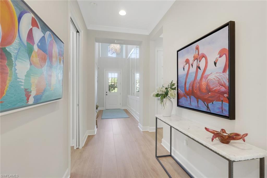 Step into a world of sophisticated elegance and unparalleled comfort within this exquisite residence. Spanning over 2,100 square feet, is a masterful blend of modern design and serene natural beauty, offering three sumptuous bedrooms and three full designer bathrooms. The inviting primary retreat offers a sitting area, two expansive walk-in closets, and spa-like bath. Every surface speaks of quality: the chef's kitchen is crowned with thick-cut, brilliant white quartz countertop island, a visual centerpiece that complements the high-end stainless steel appliances. The main living areas and bedrooms feature premium, wide-plank luxury laminate flooring, offering the warmth of wood with superior durability, while the bathrooms showcase meticulously installed, upgraded designer tile flooring. Natural light is beautifully filtered by custom, classic plantation shutters adorning every window and enhanced by the custom mirrored foyer. Outdoor living is transformed into a private resort experience. The oversized covered lanai provides an elegant transition to the magnificent, sun-drenched custom pool and spa, offering a tranquil spot for year-round entertaining. Situated on a coveted, extra-deep homesite, the property boasts an exceptionally expansive driveway and is buffered by incredible privacy. Beyond the pool deck, your personal sanctuary backs directly onto a protected nature preserve, creating an undisturbed, living panorama where local wildlife is frequently seen, offering an unmatched, peaceful backdrop to your luxurious life. Make it a seamless transition with negotiable high-end furnishings. Enjoy peace of mind with impact windows and doors. The Isles of Collier Preserve is a premier gated community that embodies the refined yet relaxed Naples lifestyle. Residents enjoy exceptional amenities, including a resort pool, separate lap pool, fitness center, pickleball and tennis courts, bocce, a waterfront restaurant, kayaking, and miles of scenic biking and walking trails. Ideally located just four miles from iconic 5th Avenue South, it offers effortless access to fine dining, boutique shopping, vibrant entertainment, and Naples’ renowned white-sand beaches.