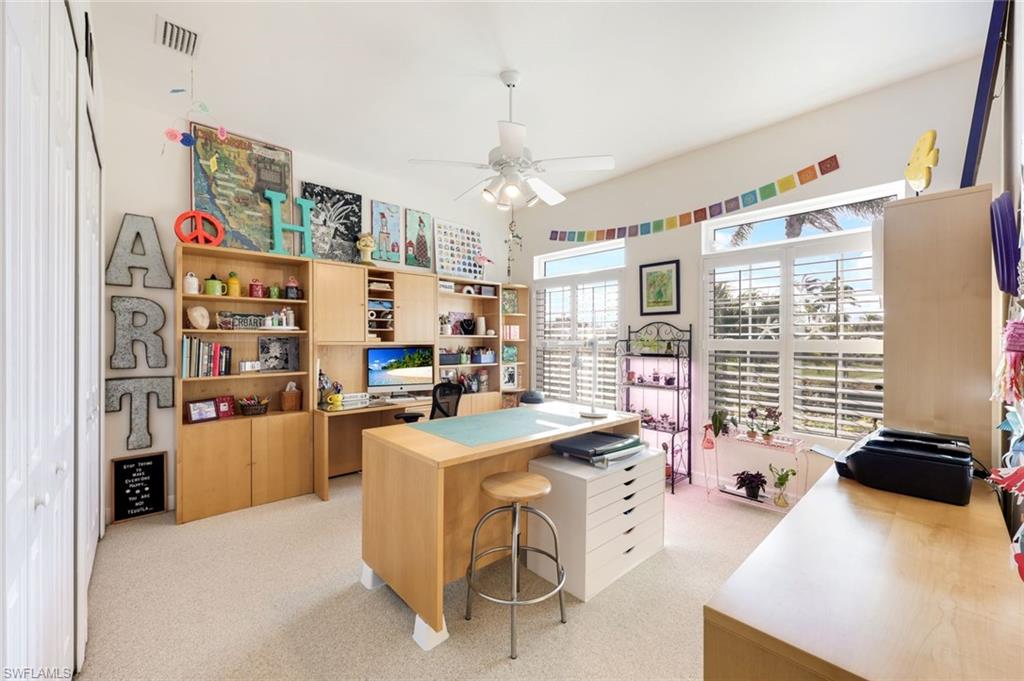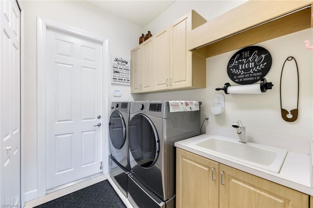 HIGHLY DESIRABLE four Bedroom, two bathroom POOL + SPA home in the gated Spanish Wells Golf & Country Club, offering just under 2,500 sq ft of thoughtfully designed living space. This home is rich with character and custom features, showcasing a fabulous open floor plan where the kitchen, dining, and living areas flow seamlessly together, complemented by new kitchen appliances, a smart thermostat, hurricane windows and sliders, and updated window treatments throughout. Enjoy an expansive screened-in lanai ideal for entertaining family and friends, featuring a saltwater pool and spa with updated pool equipment, tranquil water views, and a beautifully landscaped outdoor setting. Additional improvements include updated shower enclosures, new washer and dryer, a smart irrigation system, and an updated garage door opener for added convenience. The private primary suite overlooks the pool and includes an en suite bath with ample space, while guest bedrooms are thoughtfully tucked away from the main living areas. Perfectly located in Bonita Springs just minutes from beautiful beaches, shopping, dining, and entertainment, with optional golf or social membership available at Spanish Wells Country Club, this move-in-ready home offers the ideal Florida lifestyle.