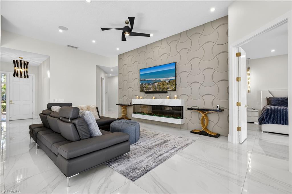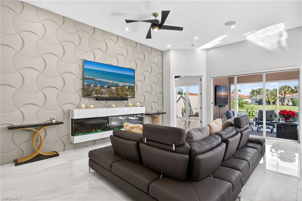 Experience luxury reimagined in this completely remodeled waterfront Oakmont, one of Village Walk’s most desirable and functional floor plans. Rebuilt throughout with designer finishes, this residence lives like new construction and offers a level of quality rarely found in the community. The moment you step inside, the home’s sophistication becomes immediately clear. A custom leather-paneled feature wall showcases a stunning floating 100-inch linear fireplace, while oversized 4’ x 4’ porcelain tiles create a seamless, contemporary aesthetic throughout the main living areas. The kitchen is the true masterpiece of the home. Designed with both artistry and function in mind, it features GE Café appliances including dishwasher drawers, a wall oven, convection oven, and a custom hood, all paired with sleek custom cabinetry. Every countertop is finished with elegant 3-inch mitered-edge stone, but the showstopper is the waterfall island. Thoughtfully engineered with integrated illumination not just beneath the stone but along the waterfall sides as well, the island emits a striking glow that transforms the kitchen into a sculptural centerpiece. This elevated design creates an unforgettable visual impact and sets the tone for sophisticated entertaining. The primary suite has been reimagined as a serene retreat with designer built-in glass cabinets, custom closets, and a completely updated bathroom featuring a redesigned layout, upgraded fixtures, and a beautifully tiled shower with glass enclosure. A newly added powder room in the hallway enhances convenience for guests—an upgrade rarely found in the Oakmont floor plan. Additional improvements include all-new plumbing lines inside the walls, a new heating and air-conditioning system, all-new electrical fixtures, custom cabinetry in the kitchen and laundry room, new tile in the lanai, new custom window treatments, new baseboards and casing, solid-core interior doors, and a new smart garage door opener with integrated camera technology. The outdoor living area features a beautifully updated, newly tiled lanai that provides the perfect backdrop for morning coffee, evening relaxation, or hosting friends and family. Village Walk is an award-winning North Naples community offering two resort-style pools, a lap pool, fitness center, pickleball, tennis, bocce, a restaurant, and miles of scenic walking paths. Ideally located just minutes from Vanderbilt Beach and Mercato, this home represents the pinnacle of modern coastal living. A rare opportunity to own a fully remodeled and exceptionally designed Oakmont—move-in ready, masterfully upgraded, and truly better than new.