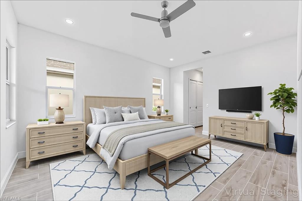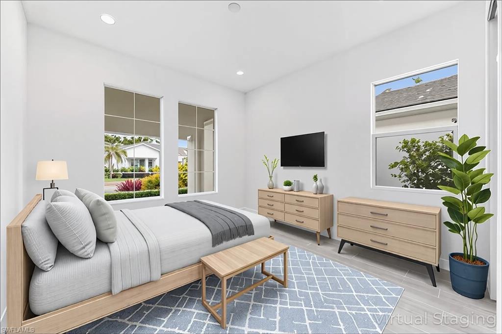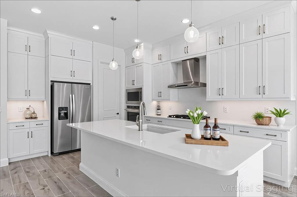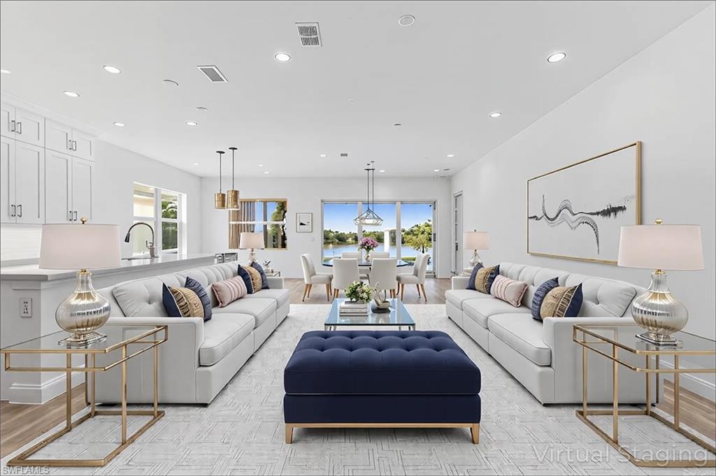 Brand New and Never Lived with the Best Water Views in the World Class Community of Azure and only steps away from the Clubhouse! This stunning never lived in Toll Brothers Sabel Antilles model home features 3 Bed 2 Baths and is still under warranty! All Impact rated windows and doors with an outdoor kitchen prep package. The gourmet kitchen is a chef's dream with a large island and natural gas cooking featuring 5-burner gas range, KitchenAid stainless steel appliances, artic white cabinets and quartz countertops. Tile flooring flows throughout the home exuding modern refinement. The primary suite offers serene lake views and a large walk in closet along with a spa-like bath with soaking tub and large shower. Enjoy your private oasis with a custom-designed pool and spa with the widest water views!! Perfect for entertaining or relaxing. Azure amenities include a state-of-the-art fitness center, resort-style swimming pool, tennis, pickleball courts, a gathering room with a catering kitchen, and a fire pit with lounge seating. Close to 5th Avenue, Naples beaches and Marco.Island. The home was used as the model sales center and the interior/exterior was completed in 2024.