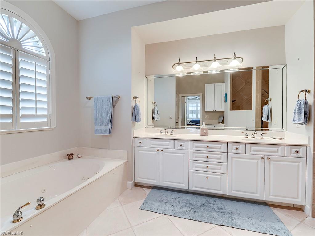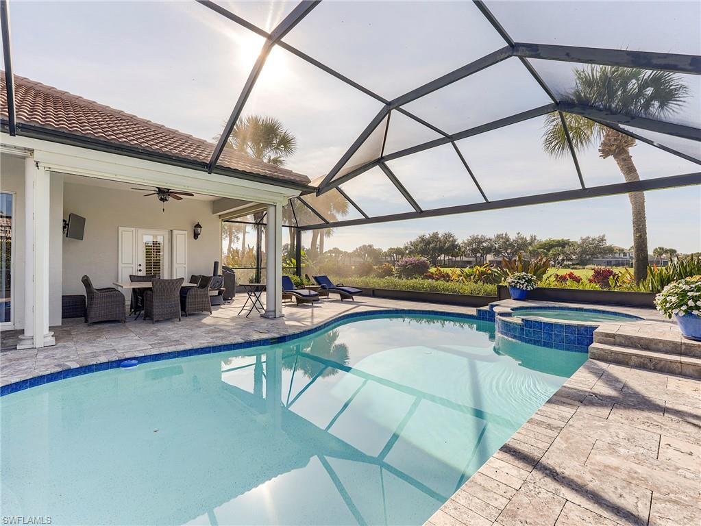 This attractive home sits on a beautifully landscaped lot in the Cedar Glen neighborhood of Shadow Wood. The panoramic lanai screen opens up to a southwest exposure of the 12th hole on SWCC South course, with wide golf course and lake view. The interior has been handsomely updated with laminate wood flooring throughout and granite countertops in the kitchen. Updated lighting and ceiling fans give the home a fresh, contemporary feel. Entertaining is effortless with an expanded family room open with a wide screen TV for theatre-like viewing. A spacious master suite offers walk-in his and her closets, a large bathroom space with double vanities, a walk-in shower, and a separate spa tub. Two guest bedrooms, with bath one being an in-suite, and an Office/Den easily serves as a 4th bedroom. Outdoor living beckons with the renovated pool and lanai area, complete with new travertine marble. Solar panels keep the pool temperature 80+ degrees, driving down energy costs. The Southwest exposure of the lanai includes breathtaking sunsets over the golf course, lake, and 12th green. Enjoy peace of mind with complete hurricane protection on all openings, including electric shutters. This beautifully updated home combines comfort, style, and security in one of Shadow Wood’s premier locations. Shadow Wood Country Club offers 54 holes of championship golf,2 clubhouses, 9 Har Tru tennis courts. Members have approved a $22.5 million lifestyle center which will include: Resort-style pool, Poolside restaurant and bar, 6 indoor Pickleball courts, and a grab-and-go cafe. Construction to start in 2025. The Commons Club has a state-of-the-art Fitness center, an additional restaurant, and access to our own beach club. Memberships available.