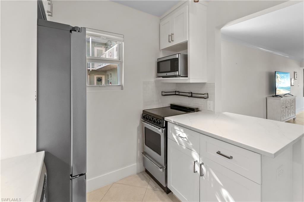 Lovely corner unit overlooking beautiful landscaping and yard! Newer kitchen and bathrooms, IN-UNIT laundry, new PVC pipes throughout condo, all new electric and electrical panel, new hot water heater, recently replaced compressor and coils in HVAC! Beautiful white kitchen, tile flooring throughout, enclosed flex room off the living room! This unit located at the end of a stunning courtyard with a little sitting area right outside the front door! Being offered turnkey furnished, just bring your personal items and start enjoying all of what Old Naples has to offer! Close proximity (1 block) to the City Dock, and 6 blocks to the beautiful sandy white beaches of the Gulf!