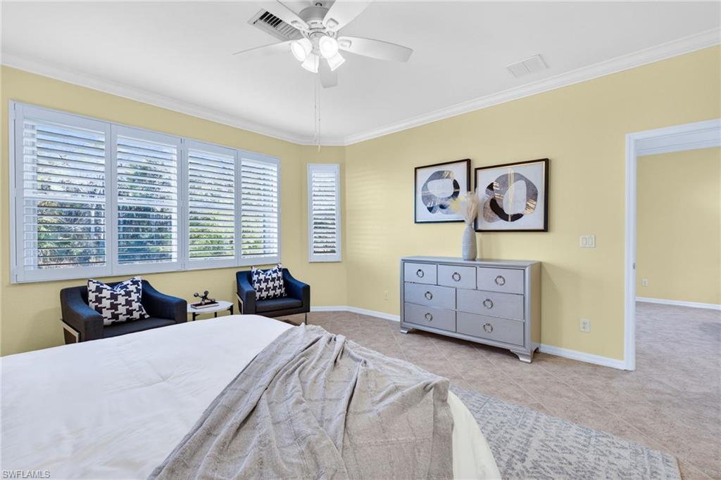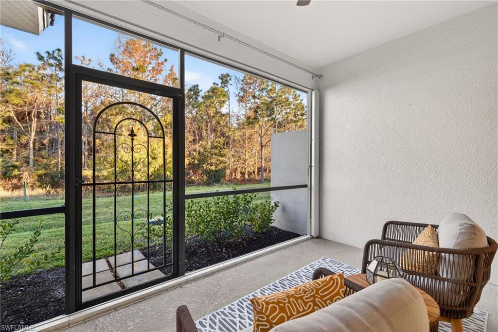 This beautifully maintained two bedroom plus den villa is one of the largest Villa floor plans in Bella Terra, and it sits in one of the best spots in the community, on a quiet cul-de-sac near the front of the gates, just a short walk to the clubhouse, pool, fitness center, pickleball and all the fun stuff, yet when you are at home, you feel completely tucked away thanks to the private preserve behind you. You get the convenience of being close to everything, while still enjoying a peaceful, tucked-away feel. Out back, the screened lanai looks out over a private preserve, not another row of homes. It is green, quiet, and full of that calm Florida backdrop people move here for. Morning coffee, evening wine, and everything in between just feels better with this kind of view. Inside, the home lives big and bright with plantation shutters, crown molding, and a flexible den that works beautifully as a home office, guest room, or cozy retreat. The kitchen features new appliances and the primary bathroom has a recently updated shower enclosure. The interior was freshly painted. The two-car garage is a standout, with upgraded flooring and custom cabinetry that stays, making it both functional and impressive. And because this is a villa, the HOA maintains the roof and exterior, giving you the ease of low-maintenance living with the feel of a single-family home. Bella Terra is loved for a reason. From water aerobics and yoga to pickleball, food truck nights, bingo, and walking trails, it is a community where people actually know their neighbors and enjoy being outside.