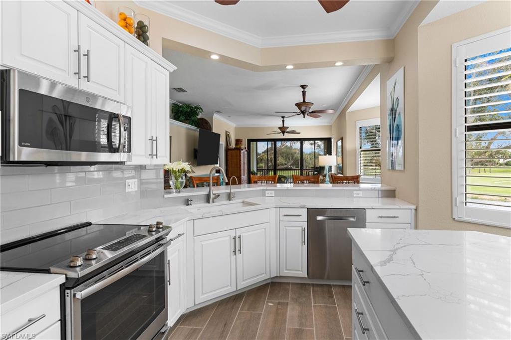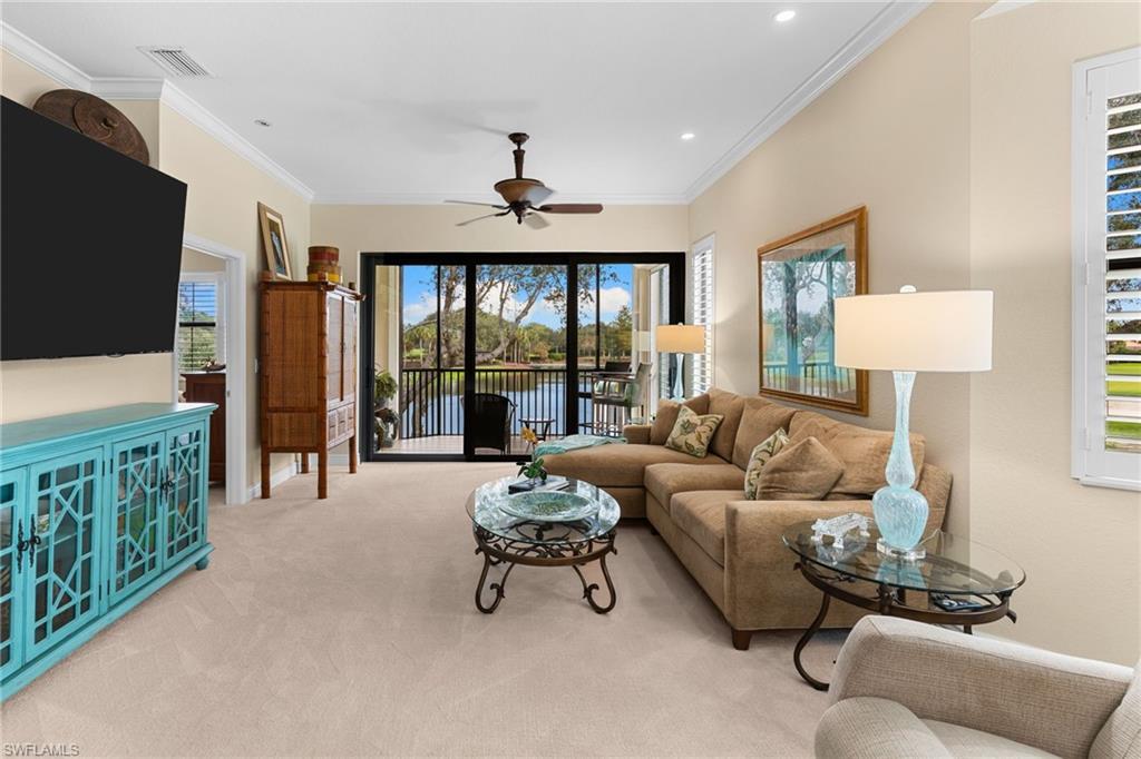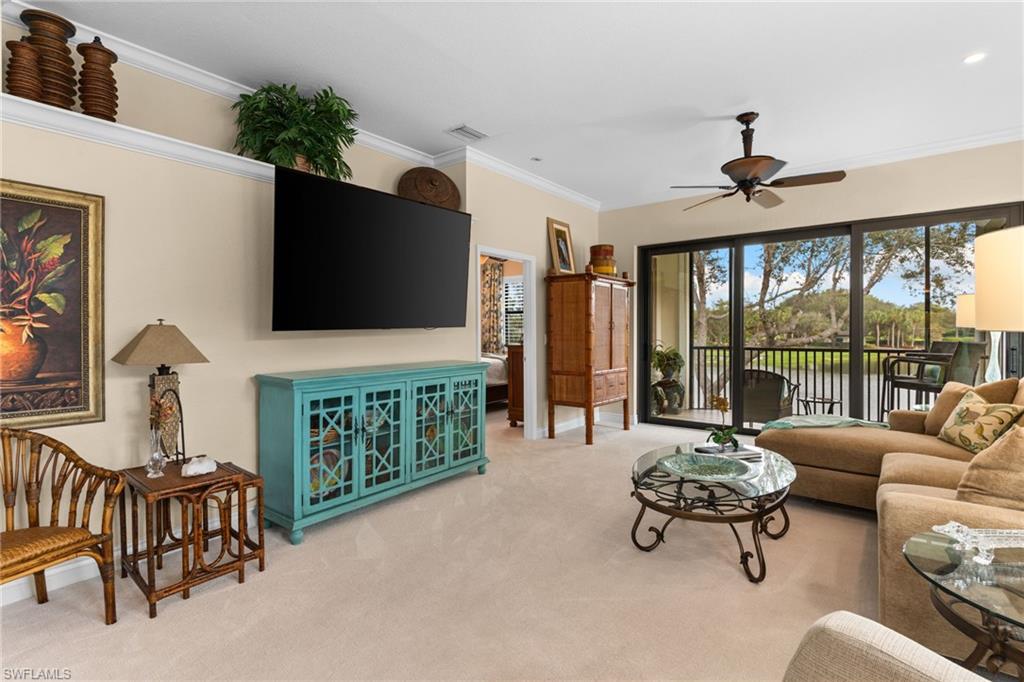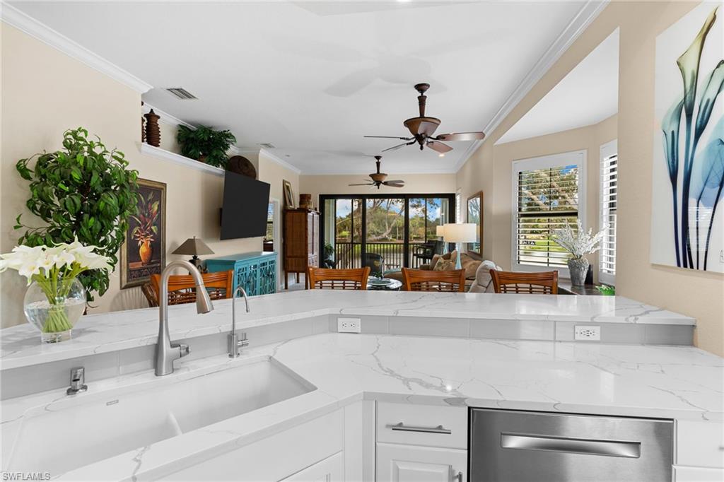 Welcome to this beautifully updated three-bedroom, three-bath residence in the prestigious gated enclave of Ravenna at Pelican Marsh. Offering 2,015 square feet of thoughtfully designed living space, this second-floor end unit showcases soaring volume ceilings, abundant natural light, and one of the most captivating panoramic views in the community—spanning tranquil lakes, rolling fairways, and majestic mature oak trees. The reimagined kitchen anchors the home with quartz countertops, newer appliances, refreshed cabinetry, and a generous breakfast bar designed for effortless entertaining. A cohesive coastal aesthetic continues throughout with updated bathrooms, new tile flooring and plush carpeting, plantation shutters, and refined finishes that feel both fresh and timeless. The open great room flows seamlessly to the screened lanai—an idyllic setting for morning coffee or evening sunsets—featuring new tile flooring, hurricane shutters, and uninterrupted views widely regarded as among Ravenna’s finest. The primary suite is a serene retreat with peaceful lake and golf course views, a spacious walk-in closet, and a fully renovated, spa-inspired bath. Two additional guest bedrooms, each with access to their own full bath, provide comfort and privacy for family and visitors. Notably, Ravenna has been fully upgraded to current hurricane standards, including impact-rated windows, sliding glass doors, front entry door, garage door, and a newer roof. Both the front and rear lanais have been completely rebuilt with bronze-finished metal framing, thoughtfully designed to complement the impact windows and create a cohesive, updated exterior aesthetic—offering peace of mind and long-term value. A rare two-car attached garage further enhances convenience and sets this residence apart within the community. Elevator ready (great for storage until an elevator is needed) Residents of Ravenna enjoy a private pool, clubhouse, and fitness room, along with full access to Pelican Marsh’s resort-style amenities, including tennis, pickleball, bocce, an impressive fitness center, 24-hour gated security, and miles of scenic walking and biking paths. Optional membership is available at the prestigious Pelican Marsh Golf Club. Ideally located just minutes from Mercato, Waterside Shops, and the pristine beaches of Vanderbilt Beach, this move-in-ready home offers refined coastal living in one of North Naples’ most sought-after communities.