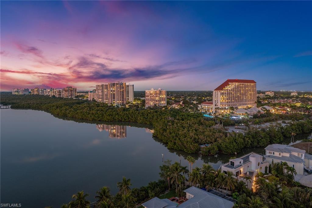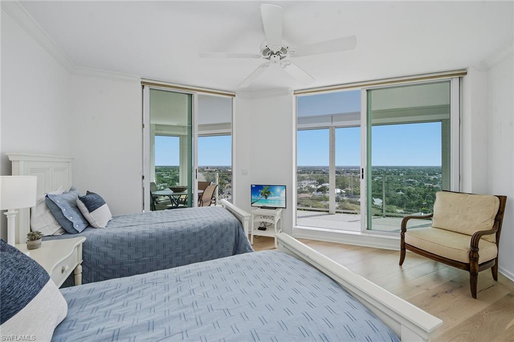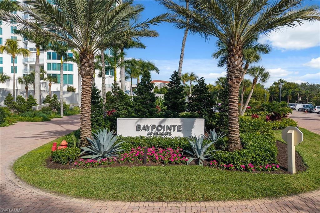 Experience breathtaking panoramic west-facing Gulf and Bay views, along with beautiful skyline vistas, from this stunning 16th-floor residence in the exclusive Baypointe at highly-regarded Naples Cay. Showcasing impressive views from every room and two expansive balconies, one facing the Gulf and Clam Bay, the other offering sweeping Venetian Bay and sparkling nighttime city views, this rarely available three-bedroom, three-full bath home delivers an unmatched luxury coastal resort lifestyle. A welcoming foyer with travertine flooring set on the diagonal and crown molding leads into the spacious living and dining area, where travertine continues, and floor-to-ceiling views frame the Gulf and Bay. A ceiling fan and large sliders that open directly to the west-facing balcony enhance the great room’s inviting ambiance. The kitchen is beautifully appointed with granite countertops, a full granite backsplash, under-cabinet lighting, an island, bamboo flooring, and a tray ceiling. Premium appliances include a built-in refrigerator, dishwasher, 36-inch electric cooktop, built-in microwave, and wall oven with convection. An adjacent custom-built-in dry bar features wine storage, glass display cabinets, and a granite countertop, complemented by a built-in desk for added convenience. An under-counter wine refrigerator and direct access to the lanai further enhance the kitchen’s functionality and flow. The primary suite is a tranquil retreat with plank wood flooring, crown molding, a ceiling fan, and direct access to spectacular water views. The en-suite bathroom features a granite vanity with a makeup counter and a full-width mirror, a jetted Jacuzzi bathtub, a walk-in shower tiled from floor to ceiling, and a spacious walk-in closet with built-ins. Both guest bedrooms offer plank wood flooring, crown molding, ceiling fans, and balcony access, one with an en-suite bath featuring a floor-to-ceiling tiled tub-shower combo with glass enclosure, the other is adjacent to a beautifully appointed bathroom with a walk-in shower and glass enclosure, also accessible from the hallway. The laundry room offers bamboo flooring, built-in cabinetry, a utility sink, a top-load washer, and a front-load dryer. Additional features include electric aluminum roll-down shutters covering both balconies for storm protection, along with a covered garage parking space beneath the building and access to two community EV chargers. Perfectly positioned between Park Shore and Pelican Bay, Naples Cay offers private beach access, kayaks, and canoes available to residents from a private dock, moments from dining, shopping, and cultural attractions of Venetian Village, Waterside Shops, and Artis—Naples. Enjoy a library, social room, fitness room, tennis courts, and a pool and terrace undergoing a full renovation, with completion expected in mid-February 2026, promising an elevated coastal resort experience within this private, guard-gated beachfront community.
