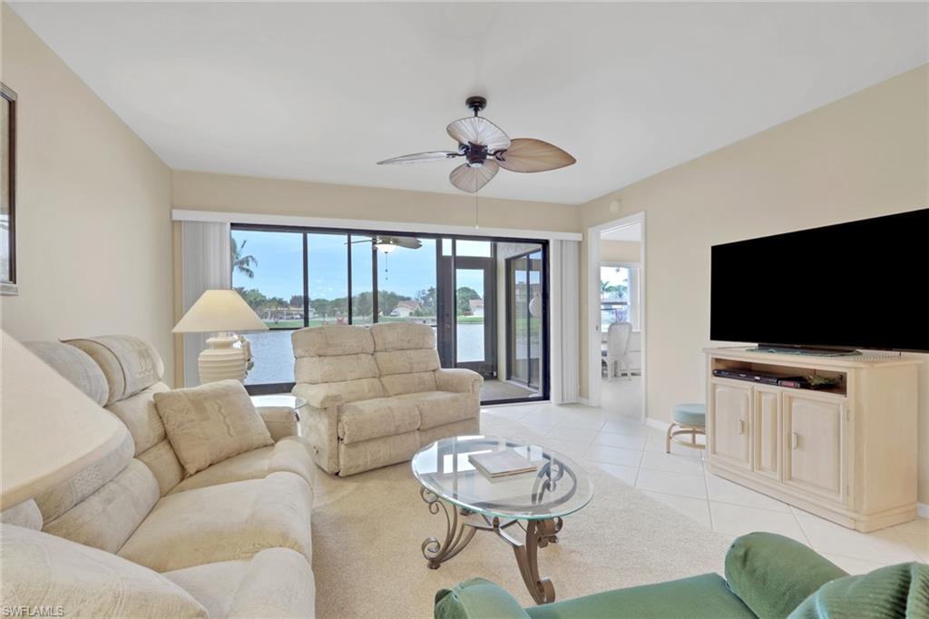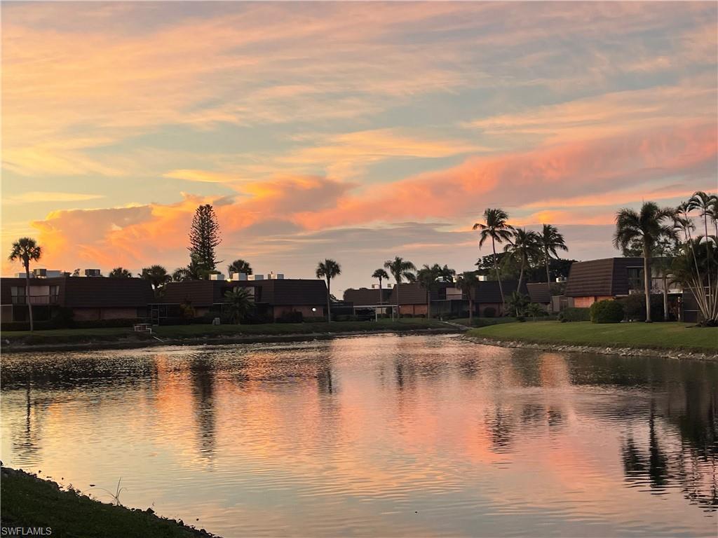 This well-appointed first-floor condo has stunning lake views from the expansive lanai and almost every room. The lanai was enclosed with glass sliders and adds nearly 100 additional square feet of living space. Offered as a turnkey property, it includes all essentials for a comfortable start in your new home. The spacious owner's suite features direct lanai access and picturesque lake vistas. The kitchen has been beautifully updated with granite countertops, backsplash, ceiling updates and new sink and fixtures. The bathrooms and bar have also been updated with granite countertops and fixtures. The HVAC unit was installed in 2023. A new patio was installed in 2023. The ensuite bathroom is equipped with a step-in shower, dual sinks, and a walk-in closet. Additional features include a pantry and a sizeable breakfast nook, perfect for a den or home office and in-residence laundry closet. Fountains V, set in a serene neighborhood, offers well-maintained grounds, two community pools, and a variety of social activities, all with reasonable association fees that cover cable and water. Its prime location features access to many conveniences including the Hibiscus Golf Course, close proximity to US 41 and the Shoppes at Hammock Cove within a mile, and it's only five miles from downtown Naples, renowned for its pristine beaches, gourmet dining, and sophisticated shopping.