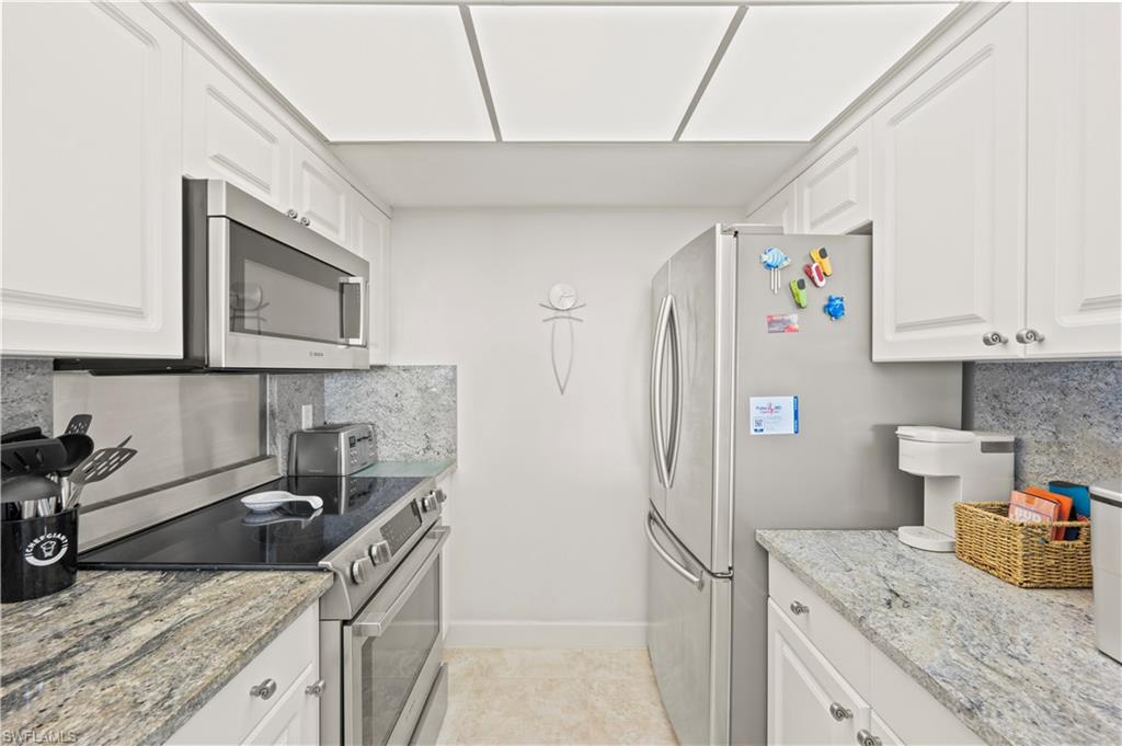 Imagine waking up to the sound of gentle waves lapping at the shore, just steps from your door. This charming 5th-floor condo in Casa Bonita II sits right on the soft sands of Little Hickory Island Beach in Bonita Springs, offering that true beachfront escape you've been dreaming of. Hop off the elevator, and you're on the sugar-white sand beach in moments. When you feel like kicking back inside or on your lanai with a cool Gulf breeze, those soothing waves set the perfect vibe. And don't get us started on the sunsets—they're the kind that make you pause and appreciate the magic of paradise every evening. Inside, this unit has been tastefully updated to feel fresh and inviting. The kitchen shines with stainless steel appliances, sleek granite countertops, and a full-height backsplash that ties it all together. Both bathrooms are nicely refreshed, featuring a roomy oversized shower in the master. In-unit laundry keeps things simple, and the building has seen some great upgrades to amenities and exterior. Plus, it's turnkey furnished, so you can move right in and start living the good life. This unit also offers added peace of mind with an impact-resistant front door and window, along with electric shutters on the lanai for storm protection. Elevated on the 5th floor, it has remained unaffected by any surge during past storms. Nestled in the heart of coastal Bonita Springs, this location puts you close to everything you need and all the fun. Head north to wander the peaceful trails of Lovers Key State Park, then hit the energetic scene at Fort Myers Beach or explore downtown Fort Myers. Southbound, you've got Bonita Beach and the upscale charm of Naples. Shopping, dining, arts, outdoor adventures, and nightlife? All within a quick 30-minute drive in either direction. It's the ideal central location for beach lovers who want convenience without the hassle. Priced right and ready for your occupancy, this little piece of heaven is calling—grab your suitcase and come claim your tropical haven in Southwest Florida!