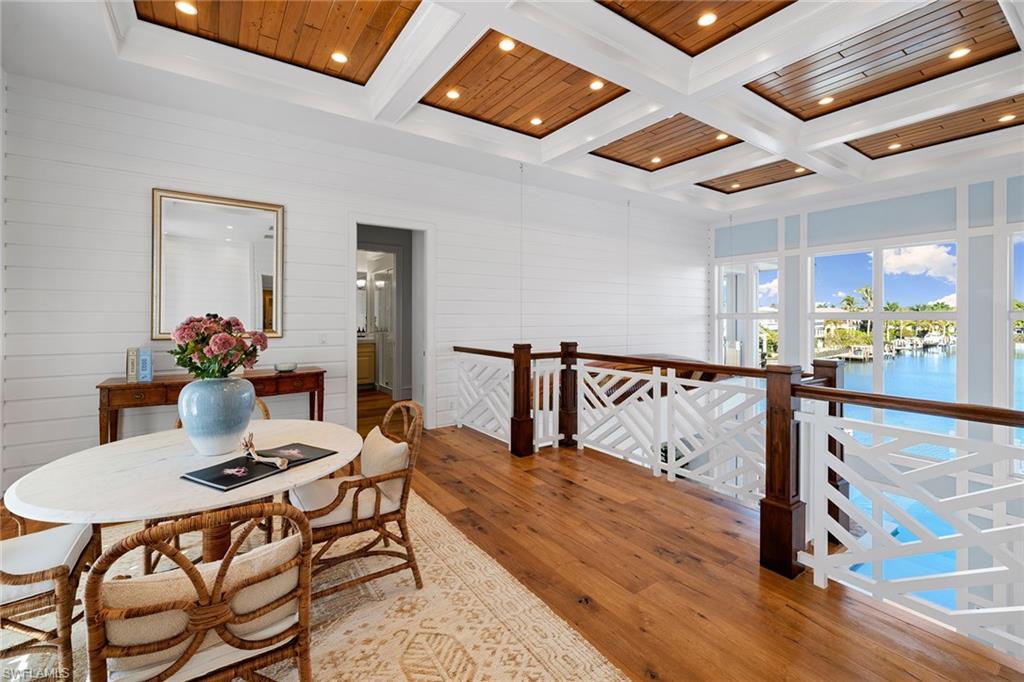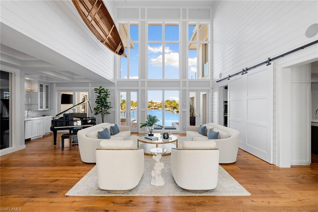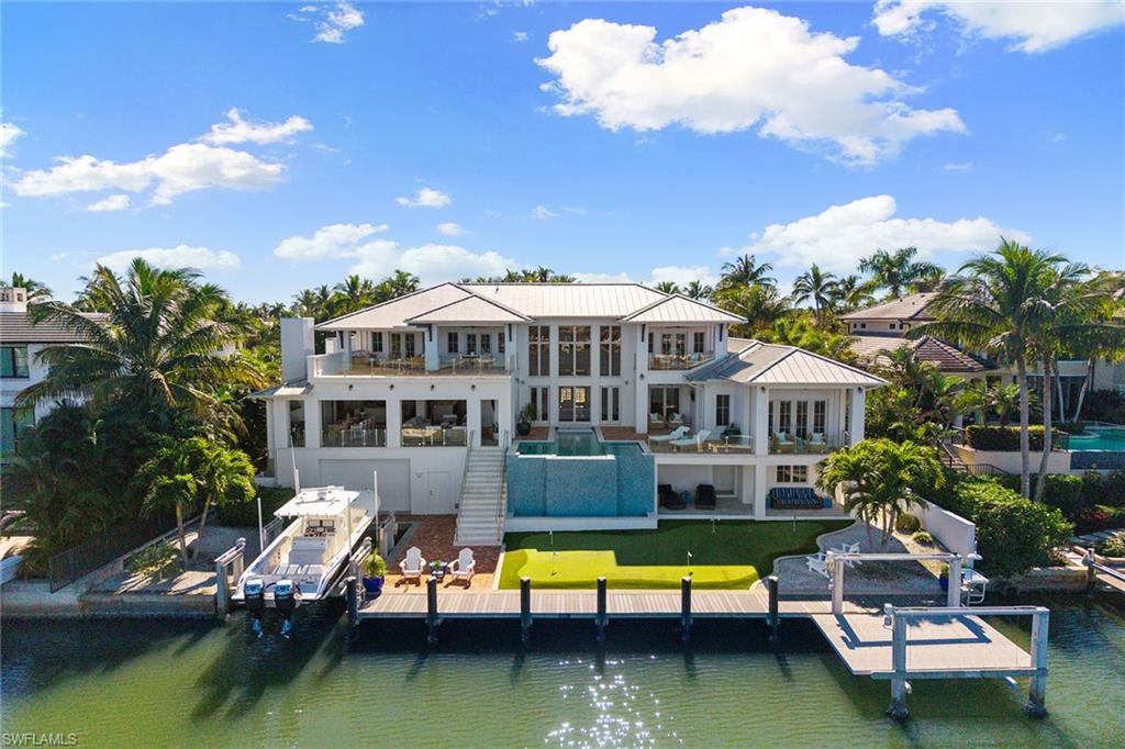 Views, Views, Views! An unparalleled expression of coastal grandeur, this extraordinary waterfront estate showcases luxury living in the heart of Aqualane Shores, one of Old Naples prestigious neighborhoods, just minutes to the Gulf of Mexico, a short distance to the beach and downtown’s historic Third Avenue South. Positioned along one of the community’s widest canals, this architectural masterpiece captures the essence of Old Naples elite lifestyle, where timeless design, masterful craftsmanship and effortless elegance converge. A boater’s and car collector’s dream, the 6,130-square-foot residence seamlessly blends old Florida charm with refined sophistication, highlighted by exquisite millwork, rich hardwood flooring, shiplap accents and tranquil water views throughout the home. Designed for grand entertaining and intimate gatherings, the open-concept layout features a dramatic two-story great room, a gourmet kitchen with dual islands, and a spacious family room flowing naturally to a covered lanai with outdoor kitchen, pizza oven and fireplace. The primary suite, on the main level, affords the utmost privacy and elegance, featuring dual dressing areas and an adjoining study that easily transitions into an additional guest suite when desired. A separate guest residence, reached by private elevator, offers a full kitchen and living area, ideal for extended stays or hosting with complete independence. Among the home’s many refined appointments are a temperature-controlled 500-plus bottle wine room, a stylish wet bar, a secure safe room and an impressive 12-car garage designed for the connoisseur of fine automobiles. Outside, the resort-inspired grounds unfold with a waterfront vanishing-edge pool, spa, putting green and a private boat slip with a 34,000-pound lift offering seamless, bridge-free navigation from your backyard to the open Gulf of Mexico, where turquoise waters and endless horizons await, completing this extraordinary tropical retreat.