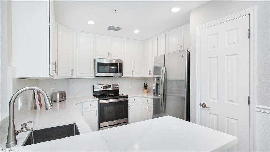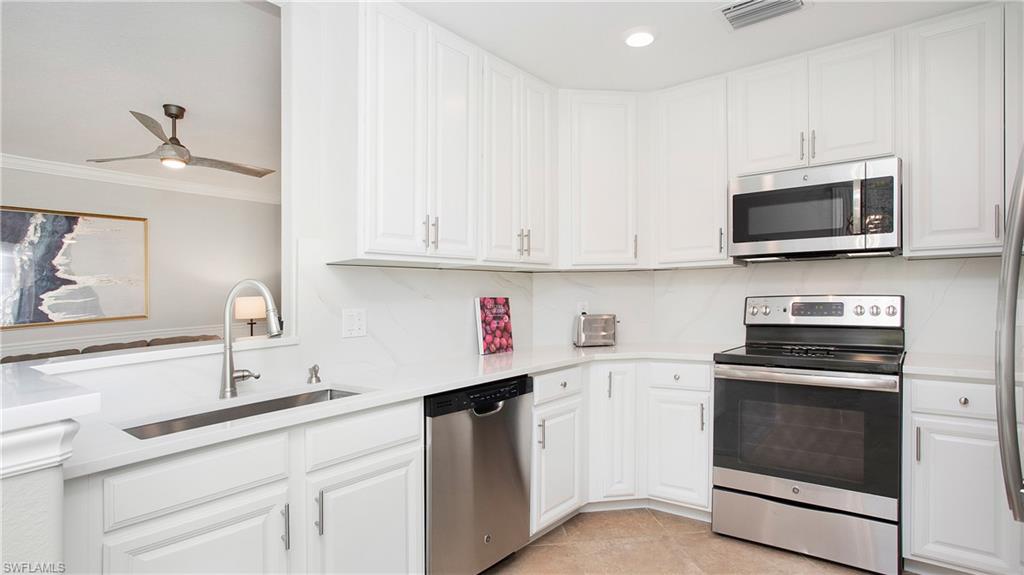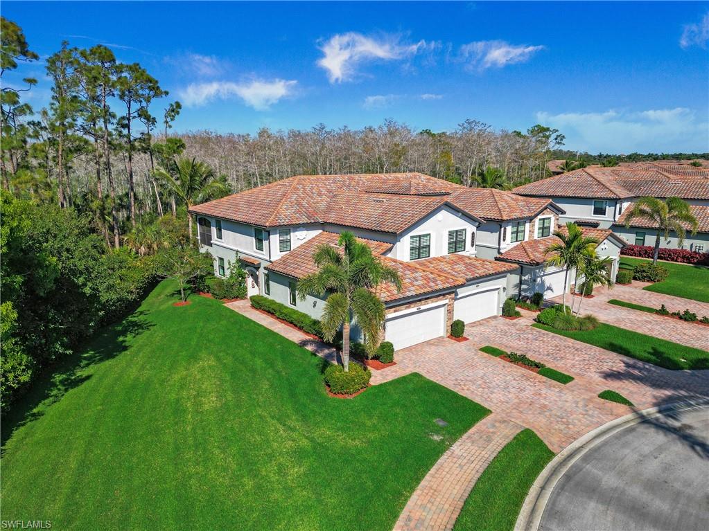 Private first-floor coach home located at the end of a cul-de-sac in Treviso Bay. This 3-bedroom, 2-bath residence features a split-bedroom floor plan and several interior updates. The kitchen includes white cabinetry, quartz countertops, a matching quartz backsplash, and stainless steel sink and faucet. The main living area opens to a screened lanai with views of the preserve and landscaped areas. The primary bedroom offers two walk-in closets with custom organizer systems and an updated bathroom with a glass shower enclosure. Additional features include luxury vinyl flooring in all bedrooms, wainscoting and crown molding in select areas, and neutral interior paint. Treviso Bay's resort-style amenities include a fitness center, spa, community pool, satellite pools, bocce, pickleball, tennis, clubhouse with dining, and the Arthur Hills–designed TPC golf course (seasonal access for non-members from May 1 to October 31). The community also offers mature landscaping and gated access. Conveniently located approximately 10–15 minutes from 5th Avenue South and 3rd Street South. Furniture is negotiable.
