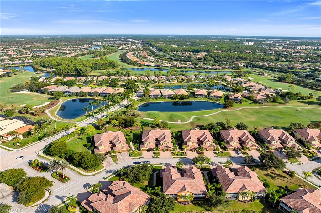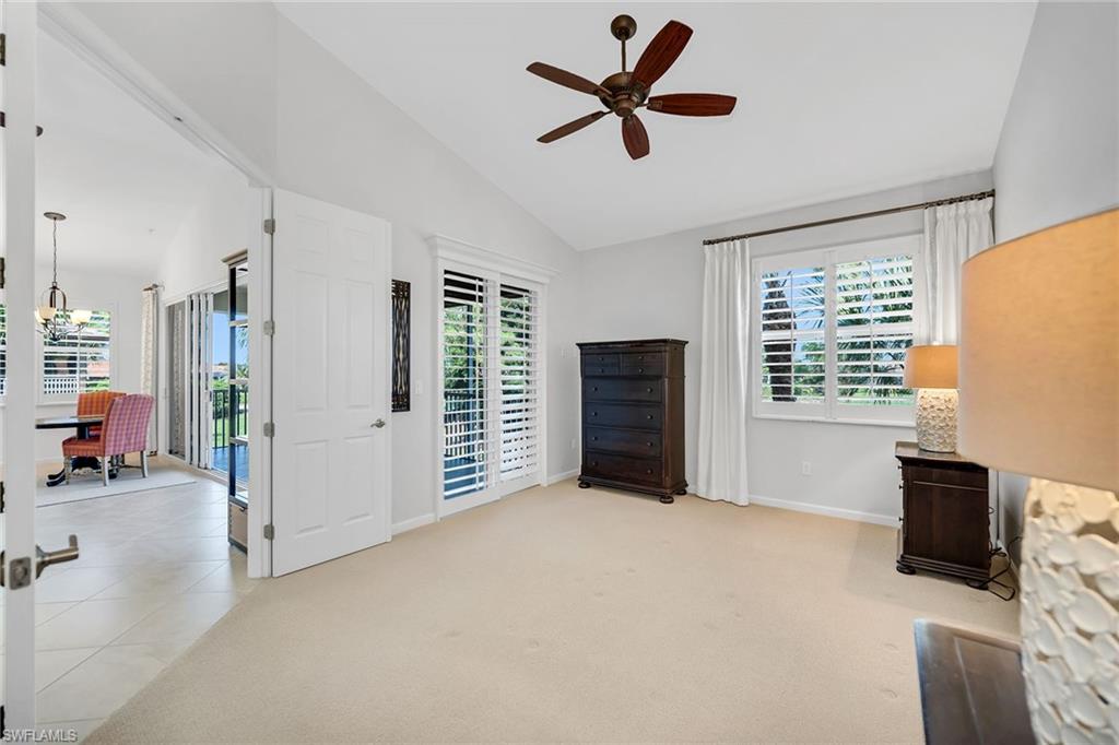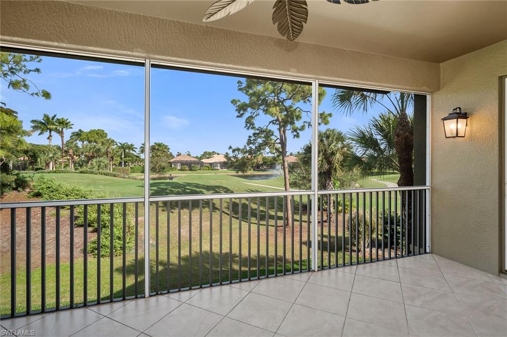Enjoy peaceful private views of the Classics Golf Course and lake from this beautifully furnished second-floor Osprey-floor-plan residence in Alden Woods at Lely Resort. Ideally positioned along the 9th hole, the home offers stunning golf course scenery, a spacious layout and deeded Players Club membership. Impact doors and windows provide peace of mind, while the screened lanai, with tile flooring, ceiling fan and a large covered outdoor living space, creates the ideal backdrop for relaxing and entertaining. Inside, the bright and inviting interior features diagonal tile flooring throughout the main living areas, vaulted ceilings and white plantation shutters that enhance the coastal aesthetic. The kitchen is stylish and functional, offering granite countertops with full matching backsplash, recessed and under-cabinet lighting, a pantry, a breakfast bar and stainless steel appliances, including a range, microwave, dishwasher and a newer refrigerator with icemaker. A casual dining area sits just off the kitchen, complemented by an adjacent formal dining room with a tray ceiling. The living room showcases architectural display niches and sliding glass doors that open wide to the lanai, ideally framing the relaxing golf and fountain views. The owner’s suite is a welcoming retreat with a double-door entry, lanai access, a large walk-in closet, and an en-suite bath featuring a dual granite vanity with a full-width mirror, an accessible shower with floor-to-ceiling tile and a glass enclosure, and a separate soaking tub. Two guest bedrooms provide comfort and flexibility, one with an accent wall and ledge, the other with its double-door entry, both conveniently near a full bath with a shower-tub combo. Additional features include a laundry room with overhead cabinetry, a Speed Queen top-load washer and a Speed Queen front-load dryer, as well as an attached one-car garage. Alden Woods offers a community pool and clubhouse just moments away, and the property carries no CDD fees. Enjoy full access to the renowned Players Club & Spa, where resort-style living includes lagoon-style pools, an expanded tiki bar, a full-service spa and salon, a state-of-the-art fitness center, tennis, pickleball, bocce and multiple dining options, from casual poolside fare to refined culinary experiences. Lely Resort also features three championship golf courses, with two public courses (Mustang and Flamingo) and one private course (The Classics), offering membership opportunities. All this is just minutes from downtown Naples, Marco Island, award-winning beaches, fine dining and shopping.