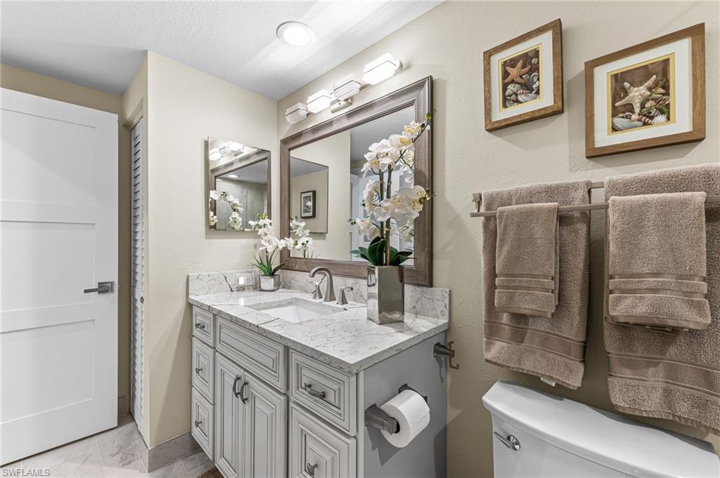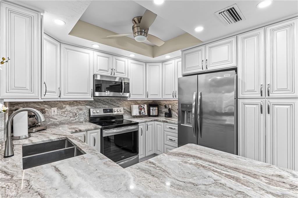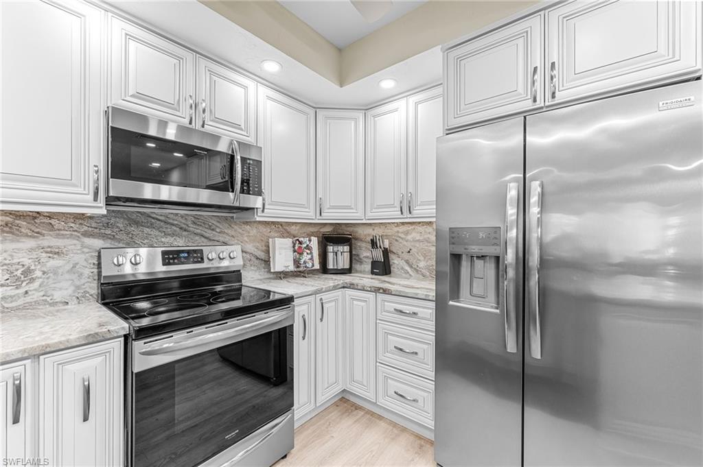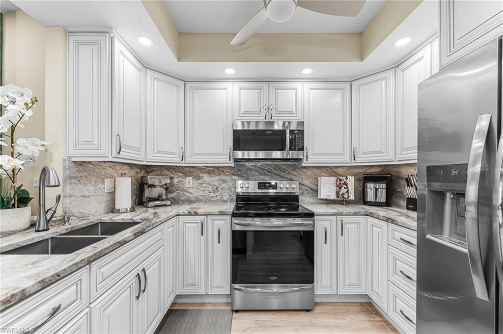 This fully renovated, move-in-ready condo is exactly what you’ve been waiting for. Step inside this bright and inviting unit and immediately notice the new laminate flooring throughout, 9-inch baseboards, crown molding, and recessed lighting that create a clean, modern feel. The living room is anchored by a recessed, wall-mounted electric fireplace—remote-controlled with multi-color flame settings—making it both a stunning focal point and a cozy feature. The home is being offered fully furnished with high-quality pieces from Ashley, City, and Kane’s. The leather sofa includes four electric recliners, providing comfort and convenience from day one. The beautifully renovated kitchen is both stylish and functional. Granite countertops and a matching backsplash provide a sleek, timeless look, while the white soft-close cabinetry includes two lazy Susan corner cabinets and two slide-out rack drawers. A built-in pantry with pull-out shelving offers ample storage. The kitchen is equipped with a new sink, touch-sensor faucet, garbage disposal, and new Frigidaire Gallery appliances. The spacious primary suite features large, sun-filled windows and a generous walk-in closet. The primary bathroom is truly a showstopper, renovated from top to bottom with marble countertops, built-in lighting, defogging mirrors, and a glass-enclosed shower. A dedicated bathroom vent and fan were also added for extra comfort. The guest bedroom is generously sized and includes its own walk-in closet and crown molding. The guest bathroom has also been updated with a new vanity and a beautifully finished shower with a glass door. Step outside to the screened-in patio—spacious, clean, and the perfect place to relax while enjoying sunset views. The community offers beautifully maintained grounds, a serene pond, and surrounding sidewalks ideal for evening walks. Each unit includes one designated covered carport parking space. Additional updates include a new water heater (2024), an AC system replaced in 2018 and regularly maintained, and a tile roof replaced in 2019. Located in the highly desirable Tuscany community, this condo is just a short walk to a Publix plaza and a community park, with quick access to the hospital and interstate. Don’t miss this incredible opportunity—schedule your private showing today!