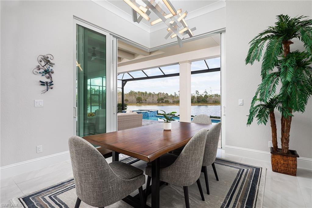 Spectacular new Stock Homes Madison model on one of the best lots in Naples Reserve, offering panoramic lake views across from the natural beauty of the Picayune Strand State Forest. This pristine home offers the finest finish details and architectural detail including coffered ceiling detail, impact windows & doors, 14-16-foot ceilings, 10-foot sliders, sparkling tile flooring, shiplap walls, decorative shutters and more. State-of-the-art cook’s kitchen offers 42-inch white shaker cabinetry, massive island with quartz countertops, wine refrigerator, lovely hood over six-burner gas stove and more. The sprawling outdoor space is dramatic with picture frame cage enhancing soothing lake views, massive covered area, large lap saltwater pool and spa with waterfall, sun shelf and pool bath. Beautiful primary suite with triple trey ceilings and spa-like bath with large walk-in shower. Immaculate three-car garage, tankless water heater and large laundry room with ample cabinet space complete the package. Private boat docks are available in Naples Reserve. Naples Reserve is a sought-after newer community offering robust social and sports activities, restaurant and tiki bar, pickleball, tennis, marina, massive resort-style pool, fabulous clubhouse and fitness center.