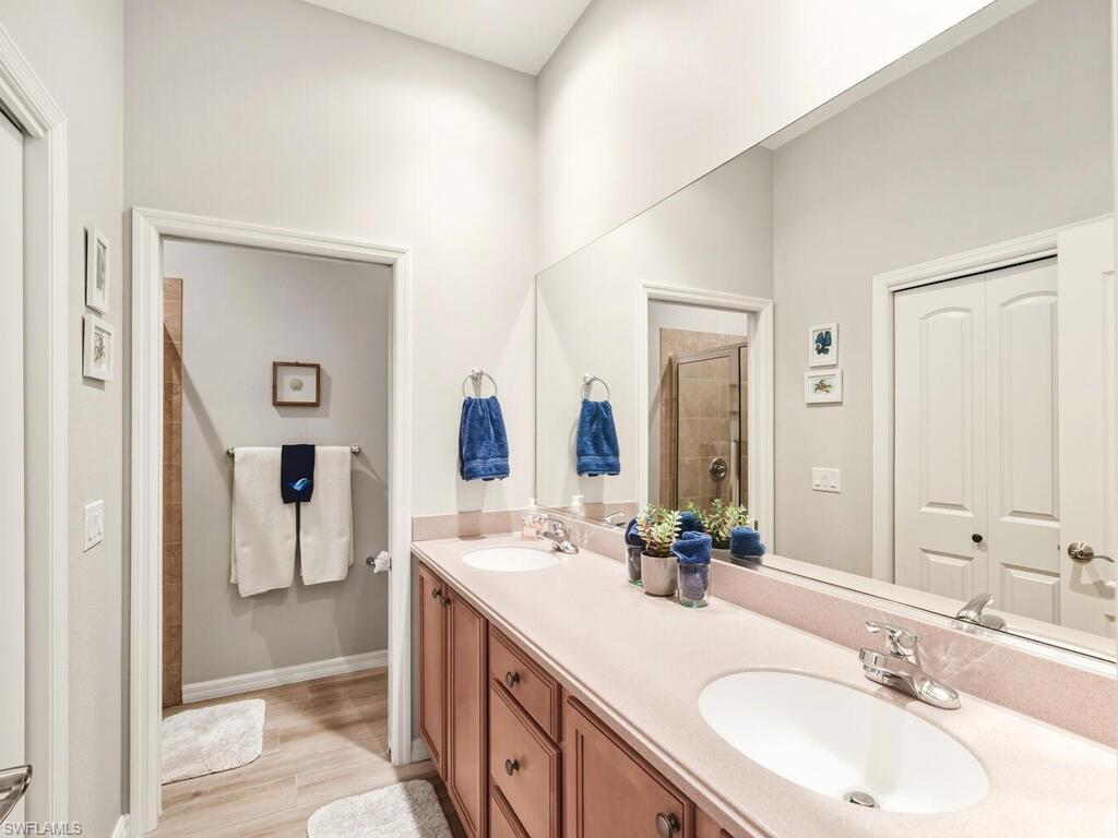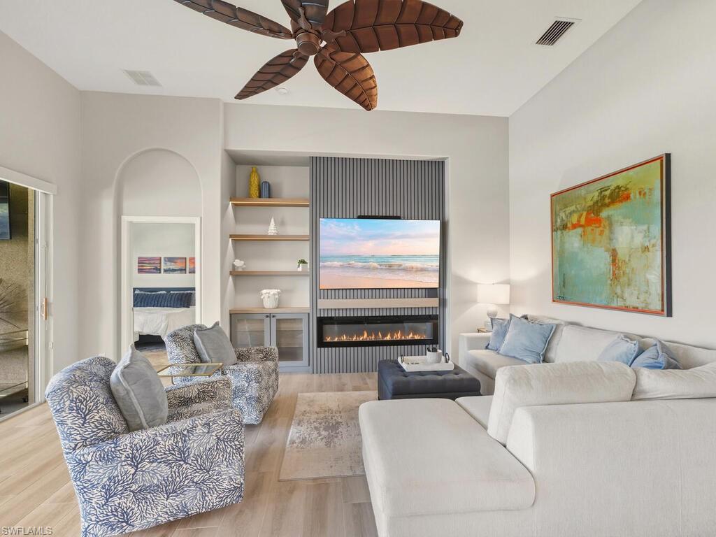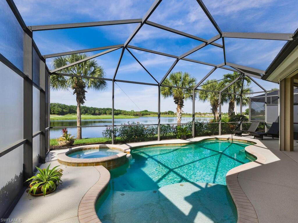 Spectacular lake & golf course view! This renovated home in Porto Romano offers open-concept living with plank tile flooring, luxury outdoor space & access to world-class amenities at Miromar Lakes Beach & Golf Club! Inside this 3 bedroom 2.5 bath single family home, you will find a comfortable layout with refined finishes & room to adapt. The primary suite opens directly to the screened lanai allowing effortless access to the saltwater pool & spa any time of day! The primary bath offers dual sinks, soaking tub & walk-in shower. One guest room can be closed off as a private suite - ideal for guests. The third bedroom is currently a home office but can easily convert to accommodate guests. The open kitchen flows into the dining area & living room, all with expansive views of the lake & golf course. The kitchen has been fully renovated with beautiful counters & plenty of cabinetry featuring pull-out drawers & a large island that doubles as a breakfast bar with extra storage underneath. With a gas range, built-in microwave & dishwasher, stainless refrigerator with 2 drawers, it is a Chef's dream. The spacious dining area is perfect for intimate dinners or entertaining friends & family. Custom built-in's in the living area feature lighted display shelving, an electric fireplace & mounted TV. The beautiful view of the lake & golf course can be enjoyed from the kitchen, dining - living room & primary suite. The outdoor living area is fabulous with a gas-heated pool & spa for year-around enjoyment, outdoor kitchen that includes a built-in gas grill, beverage fridge, TV area & space to entertain. The half-bath adds convenience. Hurricane glass & electric hurricane screens on the lanai offer peace of mind. Home also has whole house water purification system! Residents will love the privacy & friendly neighborhood of Porto Romano! Facing northwest for beautiful sunsets, this home offers low-maintenance luxury near top anchors Miromar Outlets, Gulf Coast Town Center & RSW - minutes away. Beaches & additional shopping, dining & entertainment venues are within close proximity. Miromar Lakes Beach & Golf Club offer over 700 acres freshwater lakes for your boating & waters sports, miles of sand beach with cabanas, clubhouse with indoor/outdoor dining & bars, private dining room, courtyard, library, billiard table & card room, Blue Water Beach Grill for open-air waterfront dining, resort-style pool & spa, full-service fitness center & spa, tennis, pickleball, putting green, marinas & fishing pier. Golf memberships are optional for the Arthur-Hills-designed course. Don't miss this rare opportunity for luxury resort-style living in this beautiful home waiting for you to call it home!