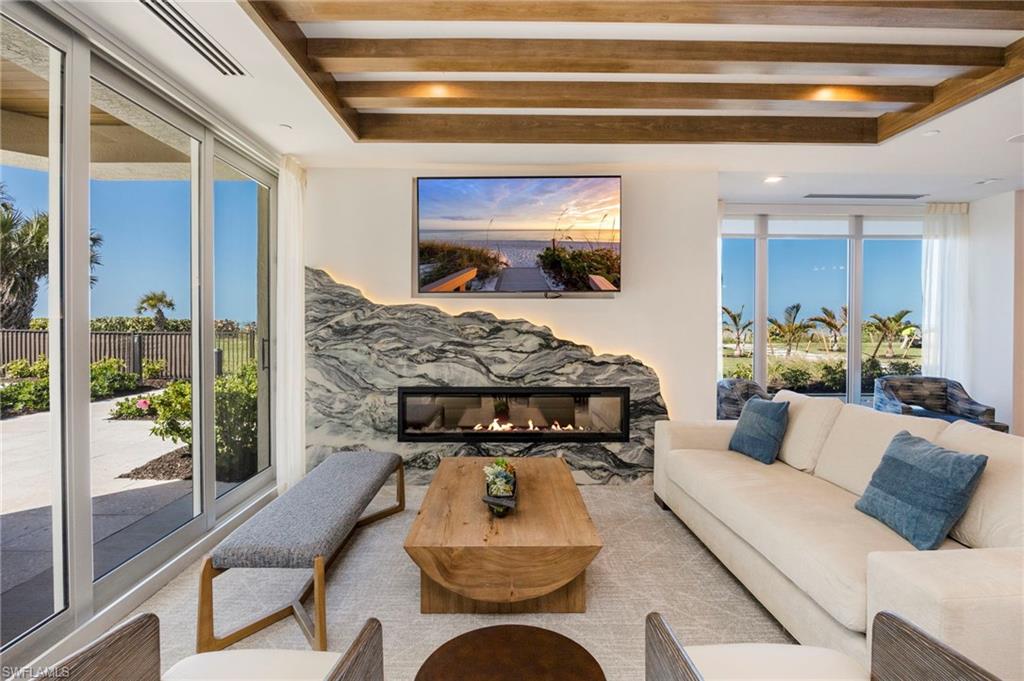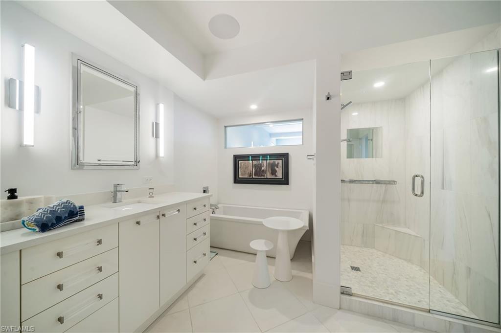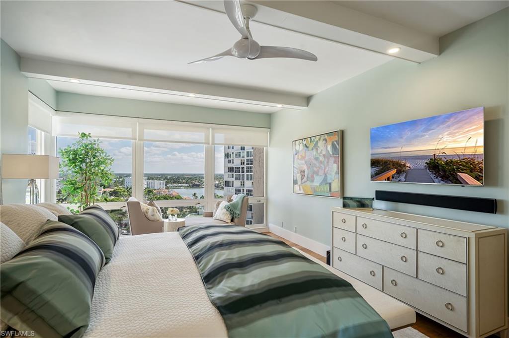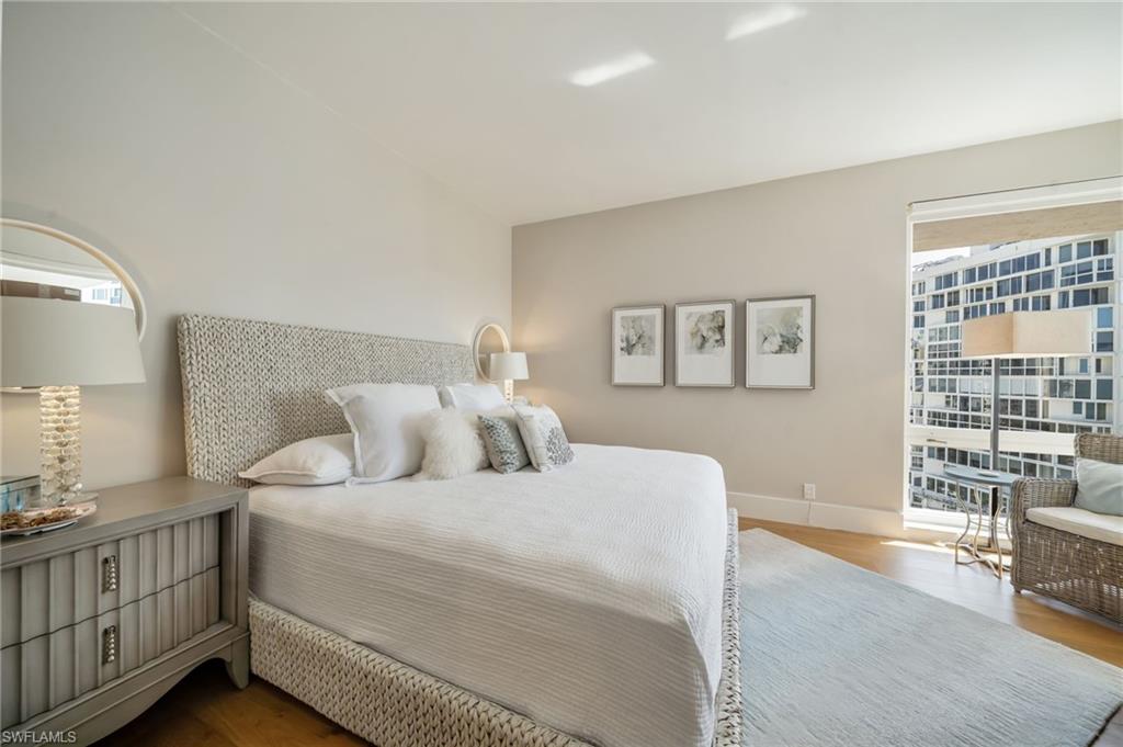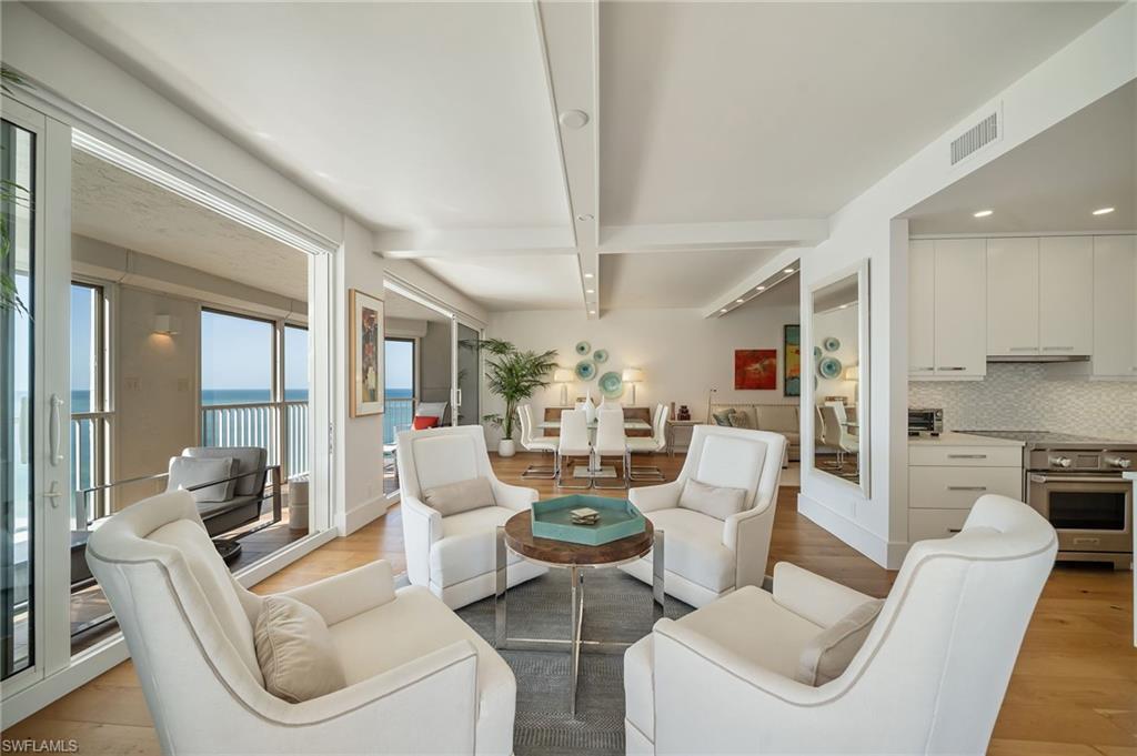 La Mer in Park Shore is reserved for those who appreciate uncompromising quality and refined design, and this impeccably reimagined 14th-floor residence stands apart following an extensive, no-expense-spared renovation where contemporary elegance meets bespoke luxury. A striking custom bar welcomes you with a wood plank accent wall, floating shelves, wine cooler, and added double storage closet. Wide-plank hardwood flooring, 9’+ ceilings with custom soffit lighting and designer fixtures elevate the main living spaces. The open-concept kitchen is a true showpiece with soft-close custom white cabinetry, quartz countertops, Sub-Zero and Wolf appliance package, mosaic tile backsplash and an oversized island with breakfast bar, seamlessly flows into a nook/den with sweeping views of Gulf Shore Boulevard North, Venetian Bay and the pristine shoreline of the Gulf. The expansive great room provides multiple conversation areas, which are filled with natural light. The newer impact sliders open to a wraparound screened lanai, where wood-look tile extends from interior to exterior for effortless indoor-outdoor living and unforgettable Naples sunsets. There are even electric storm shutters around the screened lanai so when leaving Naples there is extra peace of mind for your belongings on your balcony. The serene owner’s suite features a sitting area, walls of glass windows, two custom walk-in closets, hardwood flooring and a spa-inspired bath with soaking tub, walk-in shower, seamless glass shower enclosure and neutral tile selections. The guest suite offers a walk-in closet and luxurious full bath with oversized shower and luxury tile selections. Complementing the residence, La Mer has just completed a $13.9 million, fully paid building renovation delivering significant new improvements, including upgraded electrical systems with enhanced storm power protection, a redesigned garage and amenity deck, a resort-style rooftop terrace, fully renovated lobby, fitness center, convenient beach chair “grab and go” location, social spaces, and pool area. The amenity deck now has the following extras for the building: 1 tennis court, 2 pickleball courts, 2 bocce courts, 1 sports court with basketball and shuffleboard, a yoga area and putting green. The rooftop amenities include an observation deck, multi levels of lounge areas and even a rooftop guest suite. Hardscape finishes along the building are highlighted with new pavers, lighting, landscaping, EV charging stations. The modernized amenities that now rival the finest high-rise residences along Park Shore—all with 24/7 gated security. This premier beachfront condominium is just minutes from Venetian Village, Waterside Shops and Olde Naples.