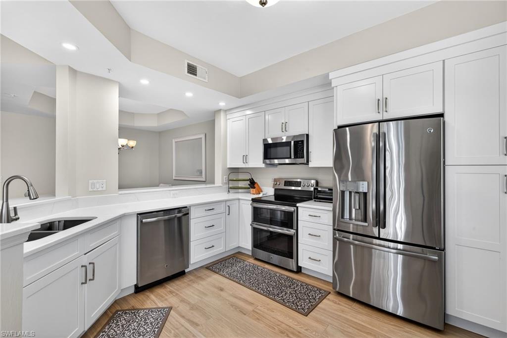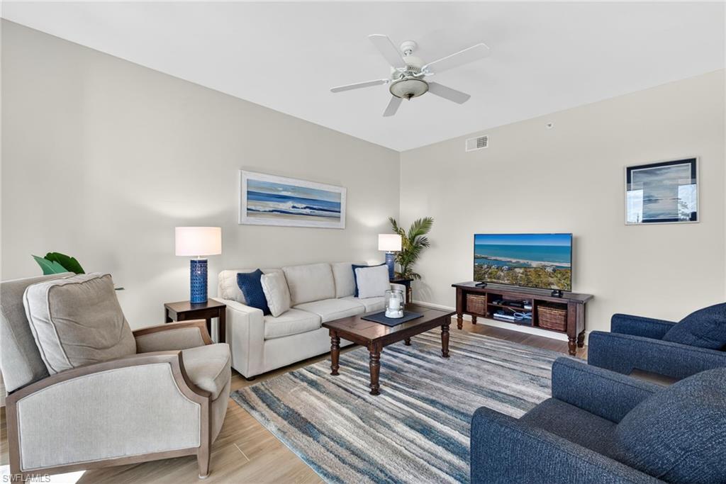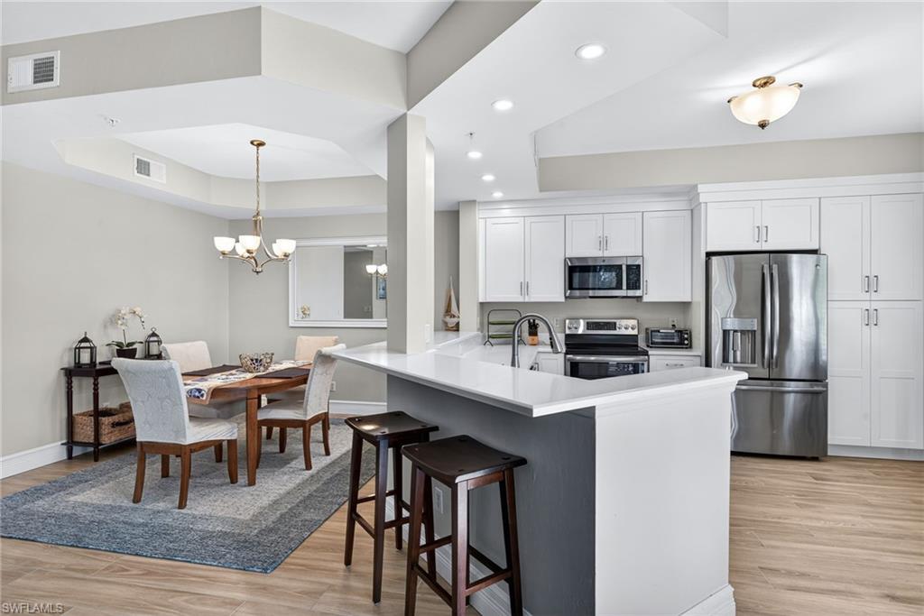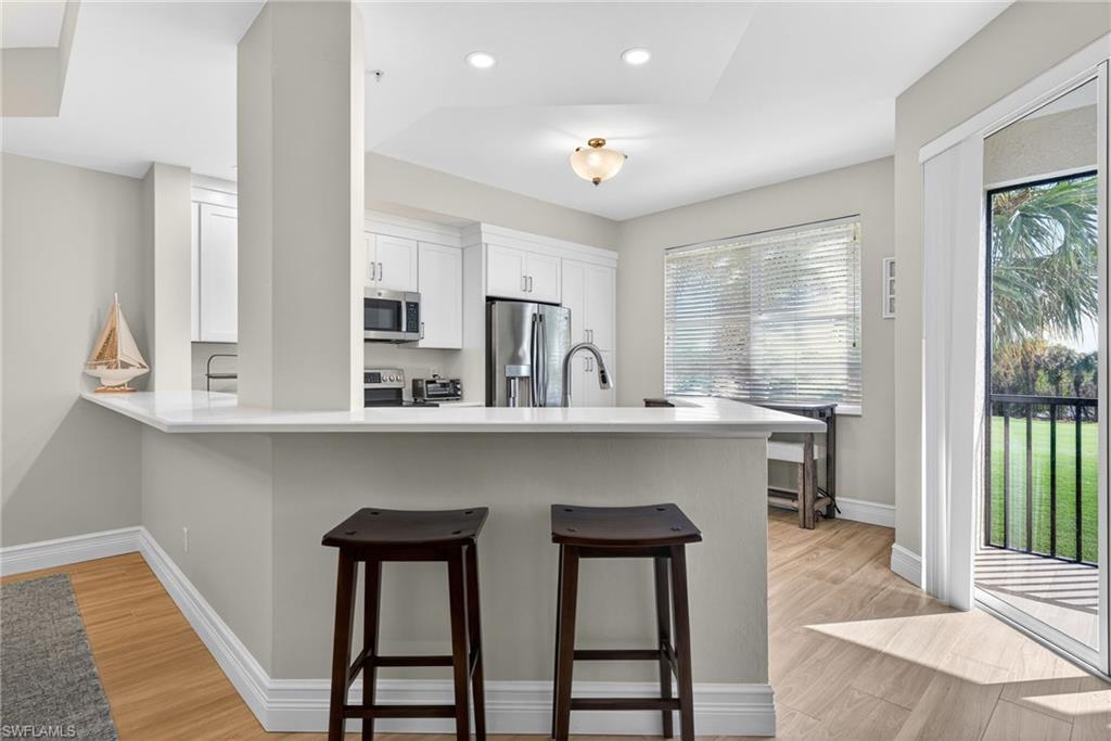 Beautifully updated 2-bedroom, 2-bath condo in Pelican Sound, southwest Florida's premier bundled golf community. This home features a renovated kitchen with GE stainless steel appliances, double oven, quartz countertops, and soft-close cabinetry. Enjoy ceramic wood-look tile flooring throughout the living areas and baths, complemented by stylish furnishings and coastal decor. Relax on the tiled lanai with expansive golf course and preserve views and desirable southeastern exposure. Additional highlights include new A/C (2021) for peace of mind. This move-in-ready home combines modern upgrades with serene surroundings—and is being sold turnkey furnished. Just unpack and live the resort lifestyle! If you are looking for an active lifestyle look no further: 27 holes of Championship golf, 14 pickleball, 8 tennis and 6 bocce courts. State of the art fitness center that is professionally staffed. Pelican Sound is nestled up to the Estero River with access to the Gulf. The community offers dry boat storage, kayaks, canoes and paddle boarding, along with a shuttle boat to Lovers Key State Beach Park. Minutes from RSW International airport and surrounded by fabulous shopping and restaurants. Start Living The Dream!