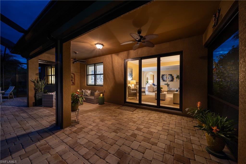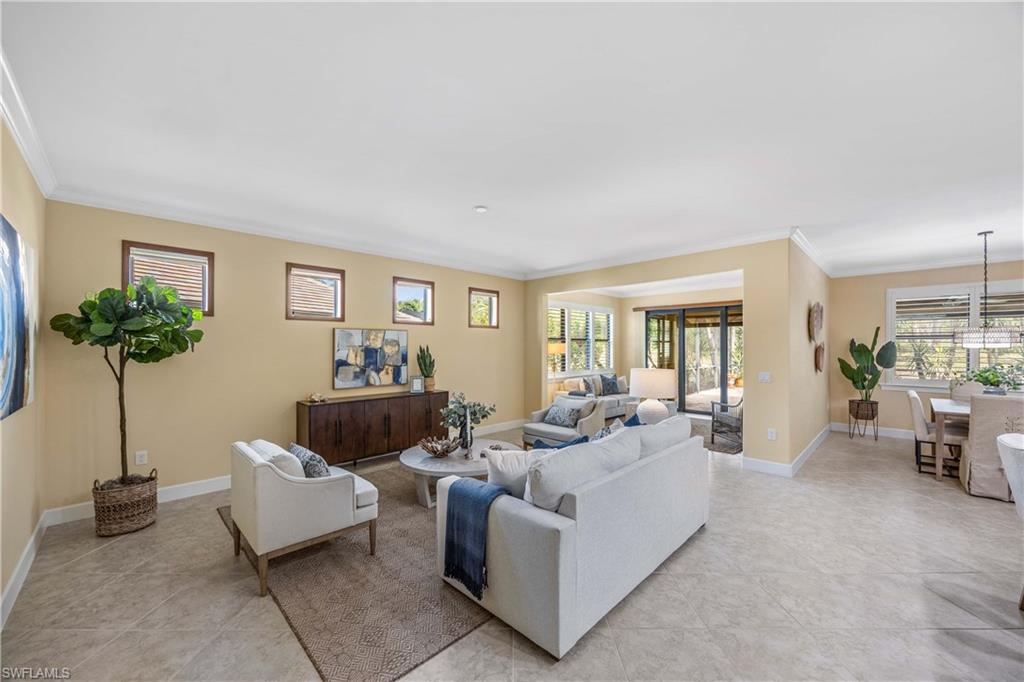 This impeccably maintained residence offers an exceptional living experience. The open floor plan features three spacious bedrooms, a versatile den or flex room, and two full bathrooms. Elegant details include crown molding, tray ceilings, plantation shutters, Hunter Douglas blinds, and updated flooring. The added sunroom provides a tranquil space for relaxation or entertaining. The custom designed kitchen equipped with under-cabinet lighting, granite countertops, a wall oven with microwave, gas cooktop, matching range hood, soft-close drawers with pull outs, and a walk-in pantry for more than ample storge. This property sits on an oversized, private lot with tropical landscaping, a newly screened lanai, and a large pool. Storm screens and impact glass windows and doors ensure year-round comfort and security. Additional upgrades include a whole-house gas GENERATOR, a four-year-old HVAC system with UV lighting and HEPA filter, a new hot water heater, and an insulated garage door with new main spring. The freshly painted exterior and professionally inspected and cleaned roof complete with new roof vents enhance curb appeal and reliability. Residents enjoy access to resort-style amenities, including a clubhouse with a full-service restaurant and bar, event room, library, heated zero-entry pool with waterfall, spa, beach cabanas, and fire pit. The fitness center, movement studio, pickleball and tennis courts, bocce ball, walking and biking trails, nature boardwalk, community garden, and dog parks promote an active lifestyle. The community is set within over 800 acres of natural preserves and 80 acres of lakes, offering a luxurious and tranquil environment with convenient access to downtown Naples in about 15 minutes and Marco Island beaches.