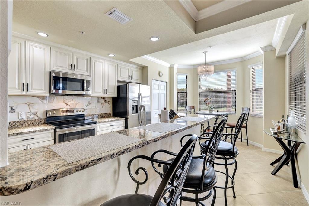 Welcome to Treviso Bay, where luxury, resort living, and Naples elegance come together. From the moment you cross the private bridge and pass the 24-hour manned gate, you’ll feel the sense of arrival that defines this sought-after, master-planned community. Lush palm trees, tranquil fountains, and impeccably maintained grounds create a true sanctuary just minutes from Fifth Avenue, downtown Naples, and the area’s world-class beaches. Treviso Bay offers an exceptional amenity collection, including seven resort-style pools, a 40,000-square-foot clubhouse, a state-of-the-art fitness center with classes, full locker rooms with sauna and showers, and a full-service spa and salon. The stunning main pool and bar, La Brezza, serves lunch and dinner, making every day feel like a vacation. Residents also enjoy pickleball courts, BBQ areas, restrooms, food trucks, on-site property management, 24-hour roaming security, and convenient shuttle service to the clubhouse and main pool. This two-bedroom, two-bath residence is located in the first building of Trevi Court, directly across from the Trevi Pool and eight pickleball courts. The building is a four-story elevator building, constructed approximately ten years ago, offering modern design and convenience. Situated on the second floor, this Bellini model features a thoughtful layout with bedrooms positioned at the front of the residence and the main living areas oriented toward Long Lake views and spectacular sunset skies. The home features tile flooring throughout, with solid-surface laminate flooring installed in the bedrooms in 2023 for easy maintenance. The kitchen was completely updated in March 2025, featuring tall cream-colored cabinetry and appliances in excellent condition, as the home has been gently used. A brand-new Nest thermostat provides smart climate control while you’re away. Additional highlights include a dedicated covered parking space conveniently located directly in front of the building. Treviso Bay offers an ideal full-time or seasonal lifestyle in one of Naples’ most desirable communities.
