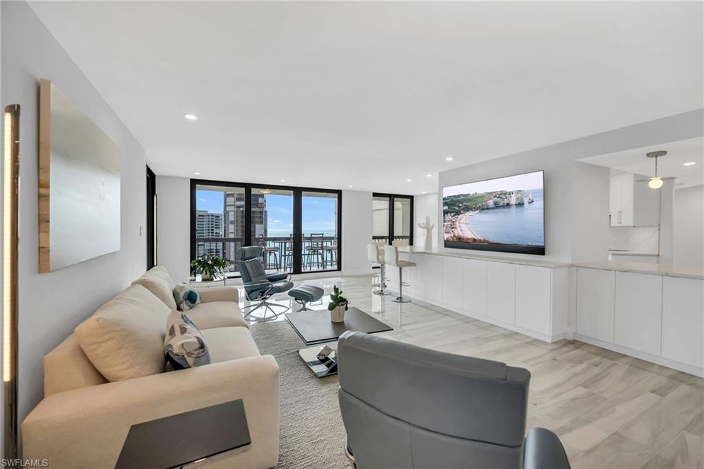 Enjoy southwestern Gulf views and spectacular sunsets from this beautifully renovated residence in the prestigious Esplanade Club. Ideally positioned on a high floor, this furnished condominium offers a light, coastal-elegant interior designed for both comfort and style. The recently updated residence features impact-resistant glass throughout, providing peace of mind along with improved energy efficiency and sound reduction. Thoughtfully renovated with clean lines and timeless finishes, the open living and dining areas flow seamlessly to the private balcony, where expansive Gulf vistas create the perfect backdrop for entertaining or relaxing at day’s end. The well-appointed kitchen and baths complement the refined coastal aesthetic, while the primary suite and guest bedroom offer serene water views of their own, plus generous closet space. Esplanade Club is a sought-after, amenity-rich beachfront community on Gulf Shore Boulevard North, offering residents a resort-style lifestyle with direct beach access, pool and spa, outdoor fireplace and bar, observation deck, fitness center, social room, tennis, pickleball, 24-hour security with doorman, and covered parking. Located just across from Venetian Village, as well as the world-class shopping, dining, and cultural offerings of downtown Naples, Waterside Shops, Mercato and Artis Naples. A rare opportunity to own a move-in-ready, furnished Gulf-view residence in one of Naples’ most desirable beachfront addresses.