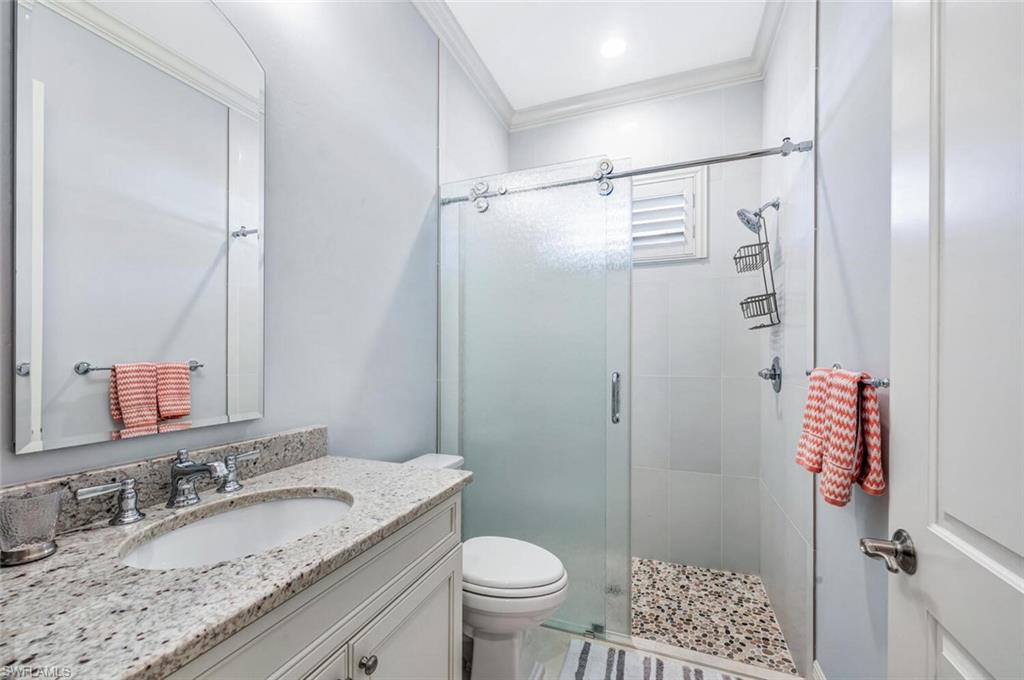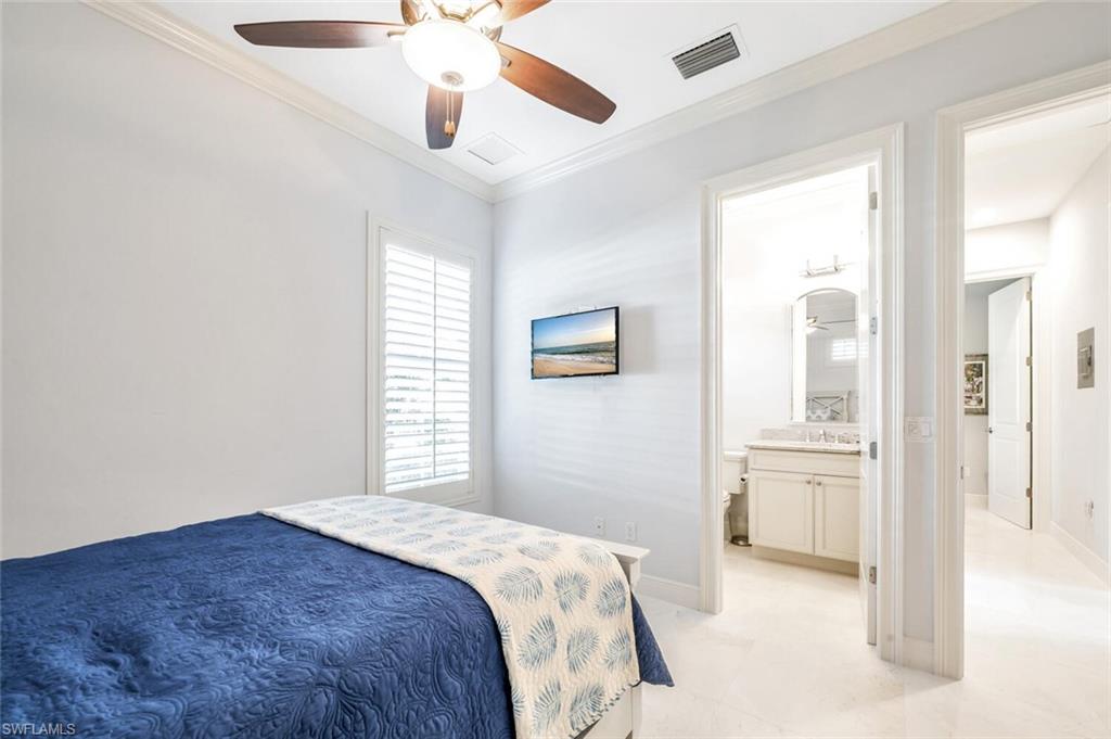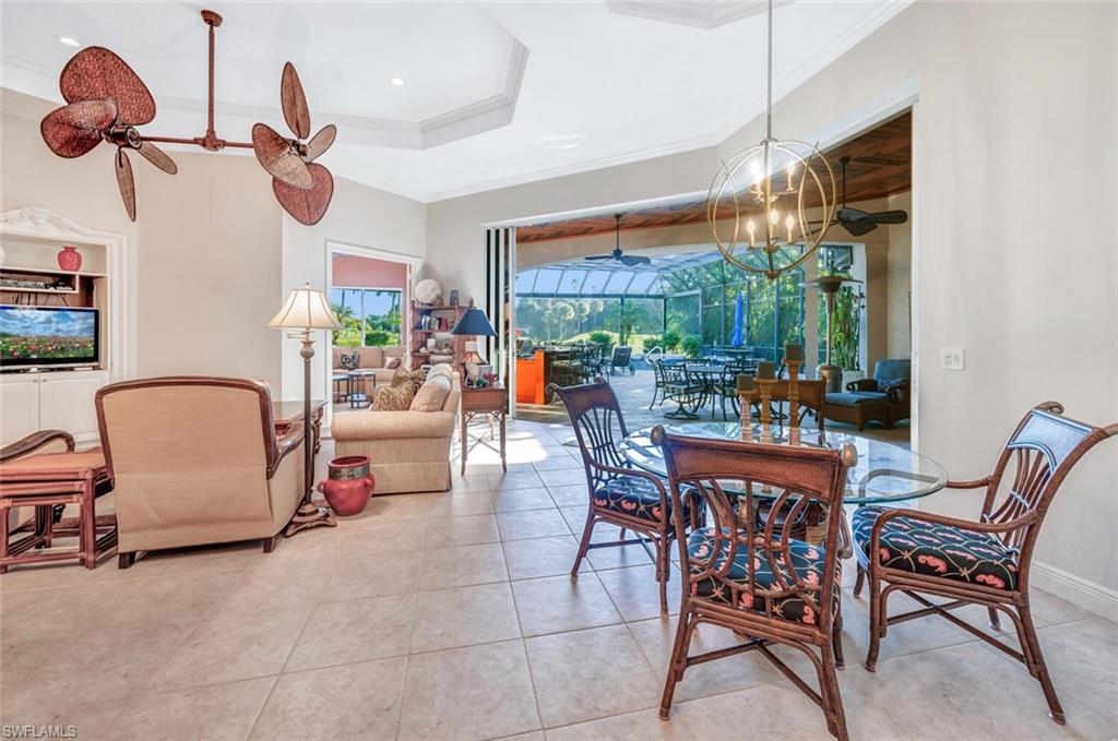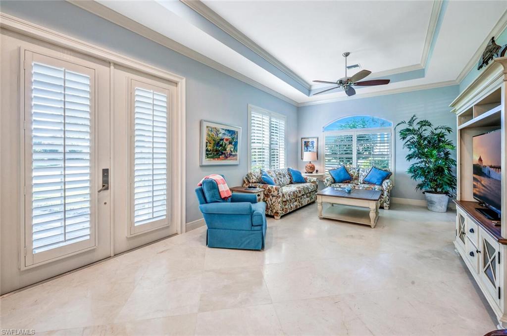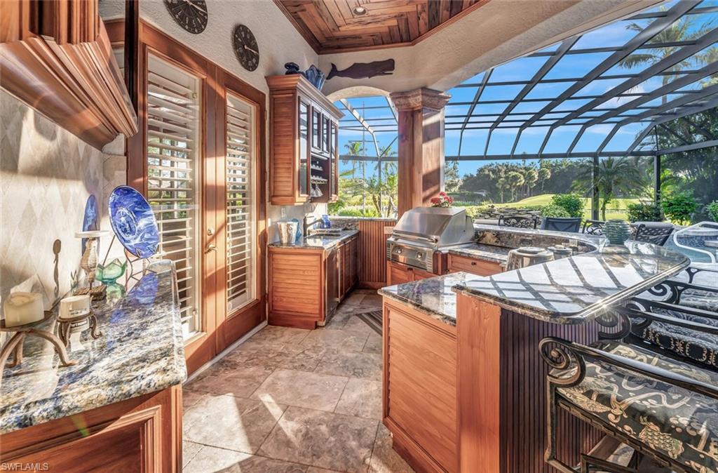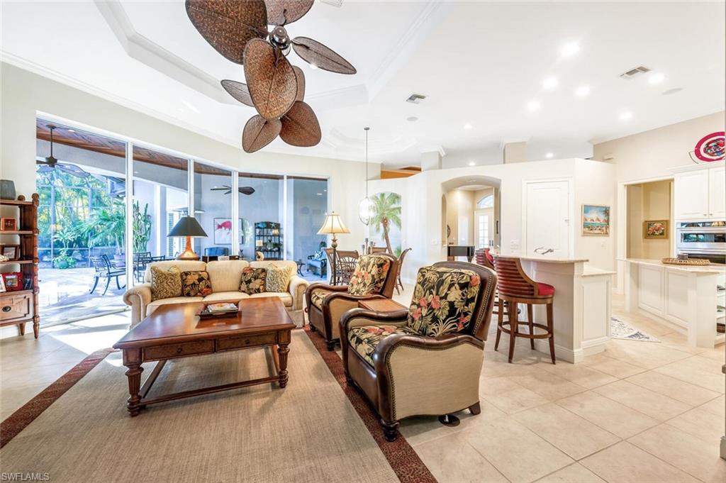 A truly remarkable estate set on nearly half an acre with sweeping lake and golf course views, offering outstanding privacy, and a thoughtfully curated compound-style layout in Kensington Golf & Country Club. A truly rare and highly desirable feature, the detached guest house provides exceptional flexibility with approximately 1,200 square feet of private, self-contained living space and a separate entrance. This well-appointed residence includes two bedrooms, two baths (one ensuite), a generous living room, and a full kitchen—perfect for accommodating long-term staff, multigenerational living, seasonal guests, or generating long-term or seasonal rental income. The main residence features three bedrooms and three bathrooms, including a convenient pool bath, and offers a variety of distinct living spaces, allowing everyone to spread out, gather, and fully enjoy the home’s exceptional amenities, all anchored by a well-appointed kitchen as the heart of the home and complemented by a formal living room, oversized family room, and a media room/flex space. Pocketing sliders open to a sprawling screened lanai overlooking the lake and manicured golf course greens, creating a seamless indoor–outdoor lifestyle. Outdoor living is elevated with a lagoon-style pool, spillover spa, cascading waterfall feature, and a fully equipped summer kitchen. A picture-frame screen enclosure preserves uninterrupted views, while a natural wall of lush tropical foliage on one side and manicured hedges on the other enhance the estate’s sense of privacy and seclusion. Graceful, versatile, and exceptionally rare, this Kensington estate presents a unique opportunity to enjoy lakefront living with golf course views, estate-caliber entertaining spaces, and thoughtfully designed accommodations for today’s dynamic lifestyles—all in a prime Naples location, just minutes from Gulf beaches, the vibrant Mercato, and the Naples Philharmonic.