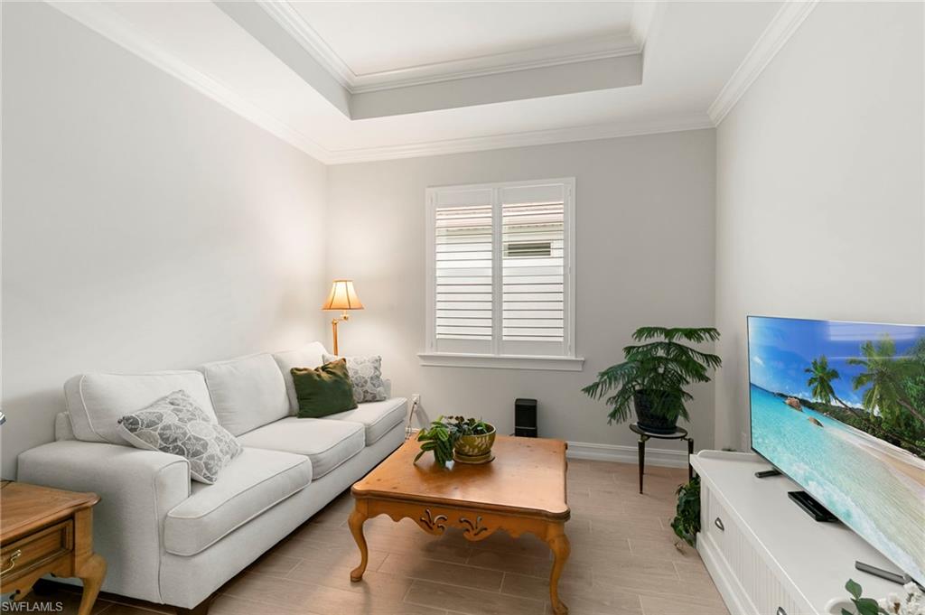 Experience refined South Naples living in this beautifully appointed Shelby model, where timeless design and modern elegance come together in a bright, open setting. High ceilings, detailed crown molding, tray ceilings, and upscale wood-look tile flooring create a sophisticated yet welcoming atmosphere throughout. The open-concept living space flows seamlessly into a chef-inspired kitchen—ideal for entertaining or quiet evenings at home. The private primary suite is a serene retreat, featuring a spa-style bath designed for relaxation and comfort, while the split-bedroom layout offers privacy for guests and family. Thoughtful details such as impact windows, smart home technology, a spacious tandem garage offering flexible parking and storage, and a dedicated pool bath enhance both convenience and peace of mind. Set within an intimate, well-maintained community offering resort-style amenities, residents enjoy a low-maintenance lifestyle with a clubhouse, resort pool, pickleball, bocce, and social spaces—all complemented by low quarterly HOA fees that include lawn care and irrigation. Located in Flood Zone X and just minutes from Naples’ renowned beaches, dining, shopping, and Marco Island, this move-in-ready residence delivers a refined coastal lifestyle with exceptional accessibility.