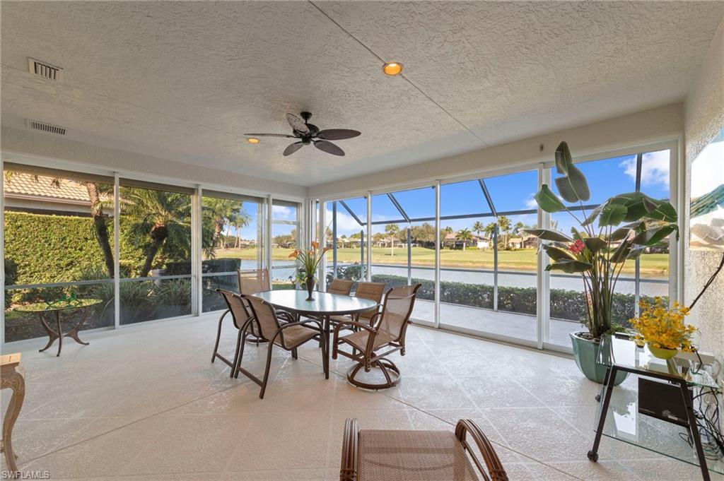 Experience effortless Florida living at 8583 Fairway Bend Drive in Estero, a beautifully maintained 2-bedroom plus den, 2-bath villa featuring expanded living space with an enclosed lanai under air and the added peace of mind of a WHOLE-HOUSE GENERATOR, along with electric storm shutters. The bright, open layout is complemented by stunning lake views, creating a serene backdrop for both everyday living and entertaining. The thoughtfully updated kitchen offers granite countertops, ample cabinetry, and a functional design that flows seamlessly into the main living and dining areas. Large windows and sliding glass doors fill the home with natural light while framing tranquil water views beyond. The versatile den provides flexible space for a home office, hobby room, or guest retreat. The air-conditioned lanai extends the living area, offering a comfortable Florida Room—perfect for year-round relaxation or entertaining while enjoying the picturesque lake setting. A spacious 2-car garage provides ample room for vehicles and storage. The property may be purchased turnkey furnished if desired, creating a truly move-in-ready opportunity. Located within The Vines, residents enjoy optional membership opportunities at The Vines Country Club, featuring championship golf, tennis, dining, and a vibrant social calendar. All set in a prime location west of I-75, in Flood Zone X, just minutes from Coconut Point Mall, RSW International Airport, Hertz Arena, and Southwest Florida’s white-sand beaches.