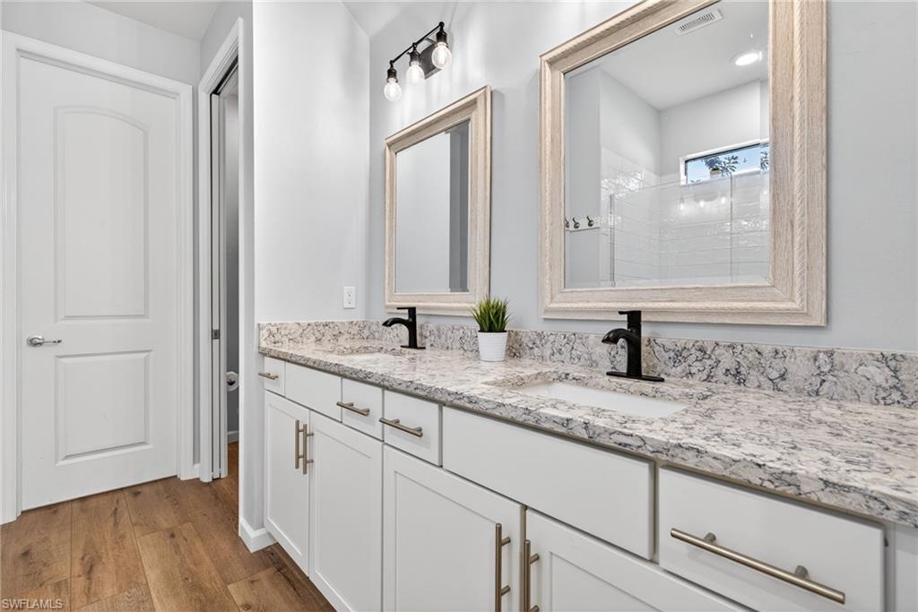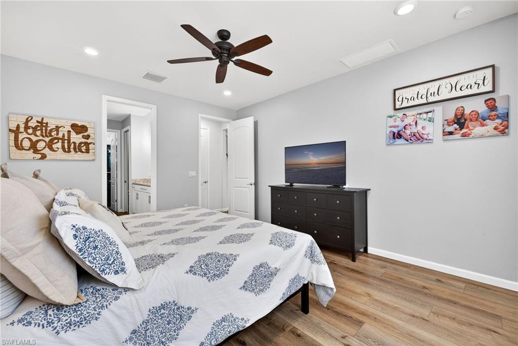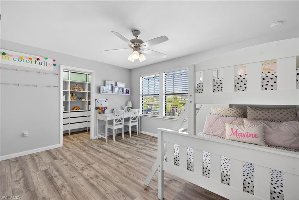 Step inside this gorgeous 5-bedroom, 3-bath home featuring an attached 3-car garage with epoxy floors and a driveway with parking for 3+ vehicles. Light and bright throughout, the home is filled with an abundance of windows and sliding doors that create an open, airy feel. The chef’s kitchen is a standout with Quartz countertops, GE Café Edition appliances in white with brushed bronze accents, including a double oven and full-depth refrigerator with water pitcher feature. Ample counter space and a walk-in pantry make this kitchen as functional as it is beautiful. The resort-style backyard is perfect for entertaining, offering a large covered patio for dining and gatherings, a spacious Heated, Salt Water pool with spa and waterfall feature, and additional brick patio space for sunning and relaxation. *The outdoor wall is outfitted with hot and cold plumbing and electrical for a future built in outdoor kitchen! Downstairs, the generous primary suite features dual sinks, a large walk-in shower, ample storage, and a custom walk-in closet with built-ins. A second bedroom, currently set up as a workout room, provides flexible space to suit your lifestyle. The laundry room offers plenty of counter space and built-in cabinetry for added storage. As you head upstairs, notice the upgraded wood treads that lead you to an oversized loft —ideal as a second family room, game room, playroom, or flex space. The loft also features a large storage closet. Three additional bedrooms offer great closet space and share a large full bathroom with tub/shower. Additional highlights include pre-wiring for VITEX home automation, abundant storage throughout, and a community packed with amenities such as volleyball and basketball courts, pool and spa, fitness center, playgrounds, and more. If you’re searching for light, bright living with space inside and out, this home truly has it all.