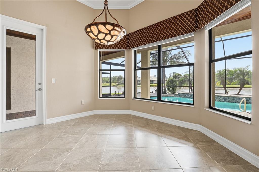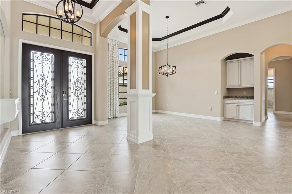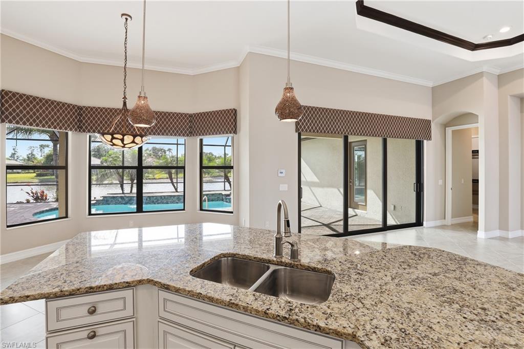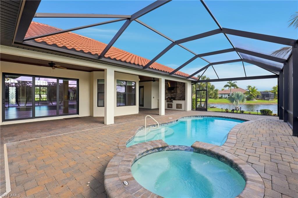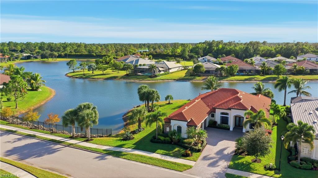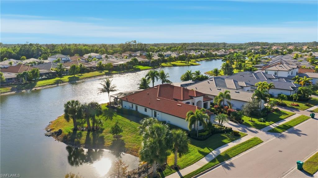 PRICED TO SELL! Look no more. This elegant 2019-built residence is ideally positioned on a rare, oversized wraparound lakefront lot with coveted southern exposure, delivering stunning water views from multiple angles and exceptional natural light throughout the home. Soaring ceilings and refined architectural details that enhance the expansive, open-concept living space. Impact-resistant windows and doors are installed throughout, providing both peace of mind and energy efficiency. The chef’s kitchen is equipped with premium stainless steel appliances and designed to complement both everyday living and entertaining. Natural gas powers the cooktop, tankless water heater, dryer, outdoor grill, and the heated pool and spa—an added luxury rarely found. Porcelain tile flooring is installed on the diagonal throughout the home, adding a sophisticated and cohesive finish. The screened lanai features a picture-frame enclosure that perfectly showcases the serene wraparound lake views. The stately front elevation is accented by professionally installed landscape lighting, and the spacious three-car garage comfortably accommodates larger vehicles. Located within the gated, low-density community of LaMorada, residents enjoy resort-style amenities including pickleball and tennis courts, an elegant clubhouse with a lake-view restaurant and poolside seating, theater room, culinary arts center, fitness and yoga studios. Conveniently situated in North Naples, just minutes from shopping, dining, and daily conveniences. The pristine, sugar-sand beaches of the Gulf are easily accessible via Immokalee Road. This property combines luxury living, location, and a great investment opportunity in one exceptional offering.