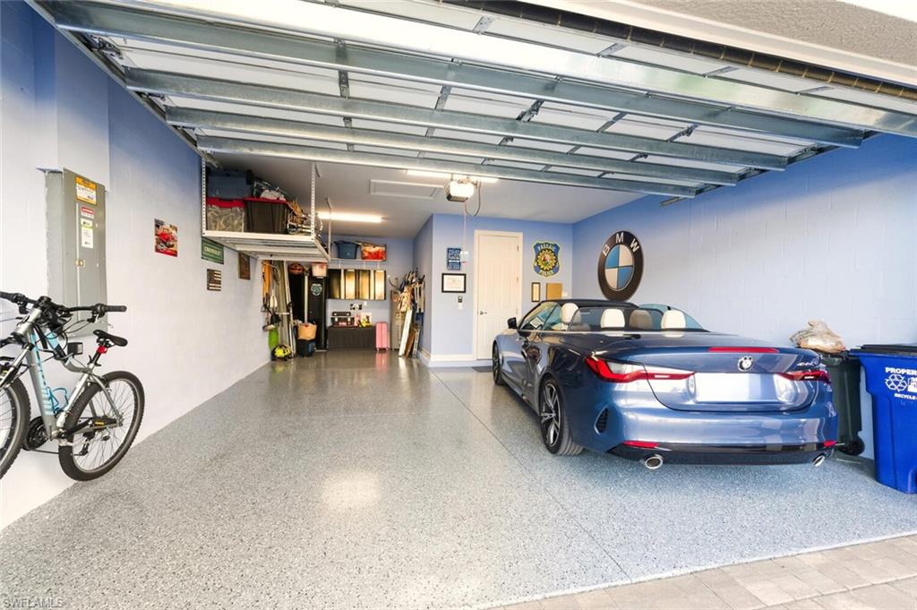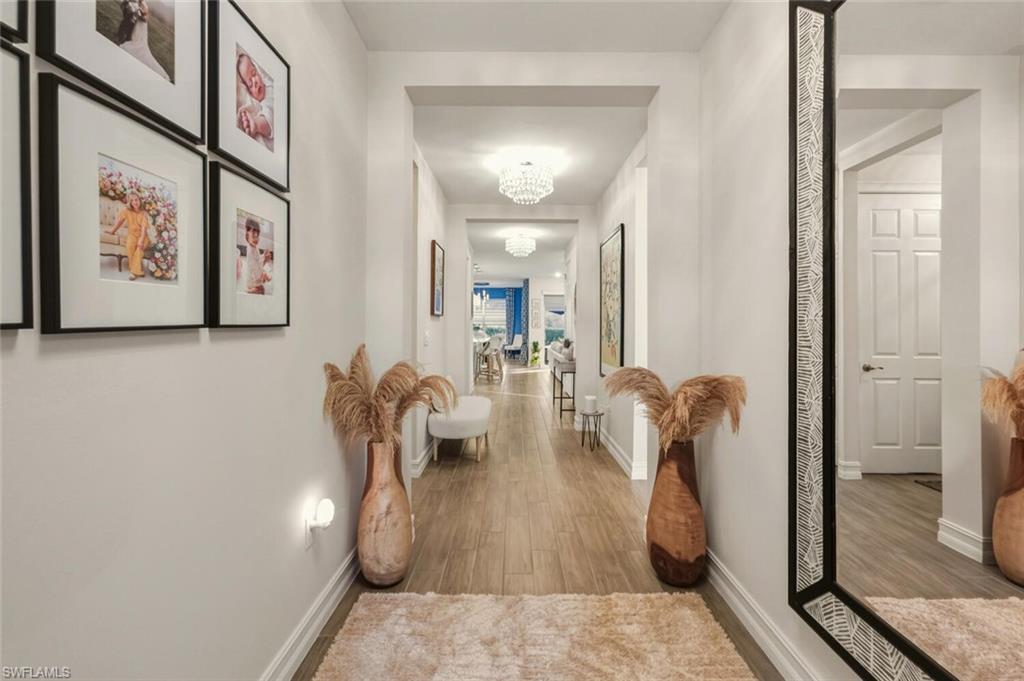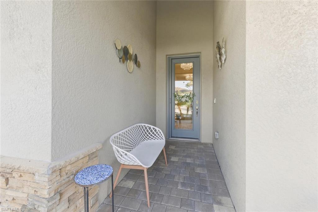 Stunning 3-bedroom, 2-1/2-bath, 2 car garage Charlotte floor plan, Single Family home loaded with upgrades and designed for comfort, privacy, and effortless Florida living. Step outside to your private oasis with a heated saltwater pool and fountain, partial lake view, privacy shrubs and enclosed by a no-see-um picture-frame screen surrounded by Clusia shrubs. The lanai includes an outdoor kitchen with refrigerator, cabinets, two Bahama shutters, and two motorized roll-down screens—perfect for year-round entertaining. The heart of the home is the kitchen that offers 42" soft-close cabinets, large pull-out drawers, upgraded quartz counters, crown molding, backsplash, upgraded stainless steel appliances with a upgraded counter depth luxury refrigerator and a porcelain farmhouse sink. Three motorized shades on the sliding doors, upgraded window treatments, and plantation shutters in the living room add style and convenience. This beautifully maintained home features tile flooring in the main areas and laminate wood flooring in all bedrooms and closets. The upgraded impact-glass front door with no-see-um pocket screen sets the tone for the quality throughout. The primary suite includes a tray ceiling, and direct access to the upgraded laundry room with 42" cabinets, sink, and front-load washer and dryer with base drawers. The primary bath features his-and-hers vanities with large drawers, a shower that has listello accents and tile to the ceiling. The oversized two-car garage is fully finished with epoxy flooring, cabinets, and overhead storage. Additional upgrades include Whole-house reverse osmosis that provides exceptional water quality, Primary closet upgraded by Inspired closets, gutters front and back, fresh interior paint, 5-1/4" baseboards throughout the home. Full landscaping around the home, 2022 roof, and a Honeywell custom security system. The property is not in a flood zone for added peace of mind. This move-in-ready home combines luxury, functionality, and privacy in one exceptional package. Cable and Internet are included in the HOA fees. Located in a gated community with lots of amenities included; Clubhouse, Resort style pool with beach entry, lap lanes and ample sundeck, pool-side tiki hut, lounge chairs and an artificial white sand beach with hammocks for relaxing, Social room with a fully equipped kitchen, Nature trail, Fishing, Biking, Tennis, Bocce and Pickleball courts, Dog parks and Fitness center. Centrally located between Naples and Ft Myers, convenient to RSW airport.