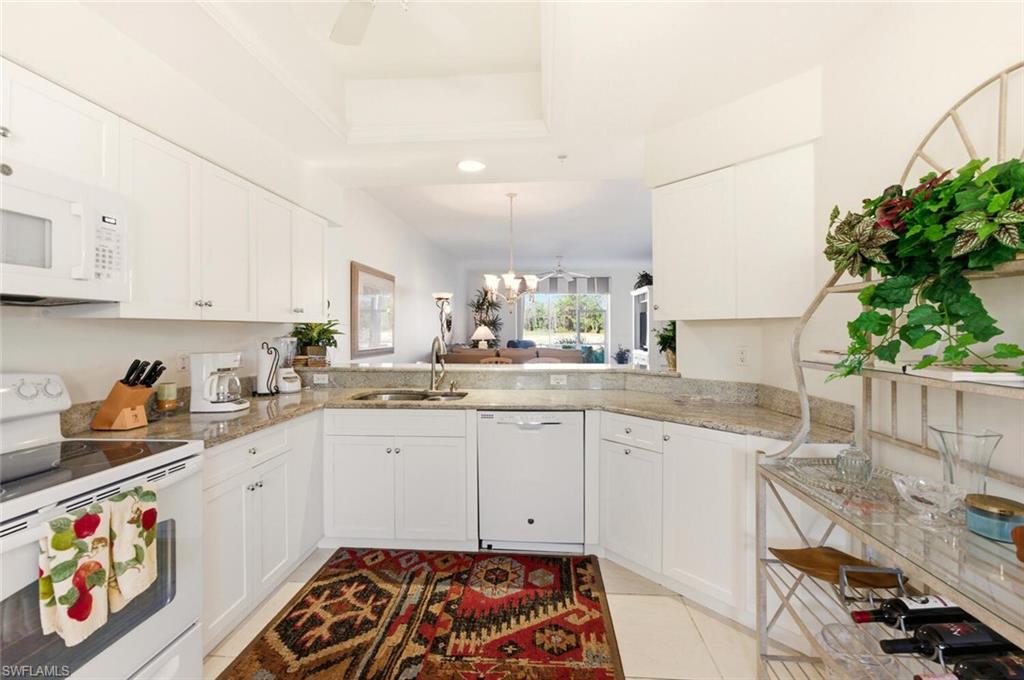 Here it is the highly sought after property many are searching for the first floor end veranda Abbey with 1660 square feet of living space and ready to move into. Two beds, two bath with den with a window giving ample light throughout the living area. You will be enamored with the view overlooking the water and rock scape to the signature twelfth hole where you can watch the golfers go by in the distance. Just a short jaunt to the beautiful Naples Heritage clubhouse and fantastic amenities with indoor and outdoor dining, championship golf, resort style lap pool with bar area and outdoor dining, fitness center with classes, tennis complex and coming in 2026 a brand new Pickleball and Bocce Ball complex. Granite countertops in kitchen. Completely tastefully decorated in neutral decor this larger condo is only slightly smaller than a villa. All of this and so close to downtown Naples, Fifth Avenue and the beaches.