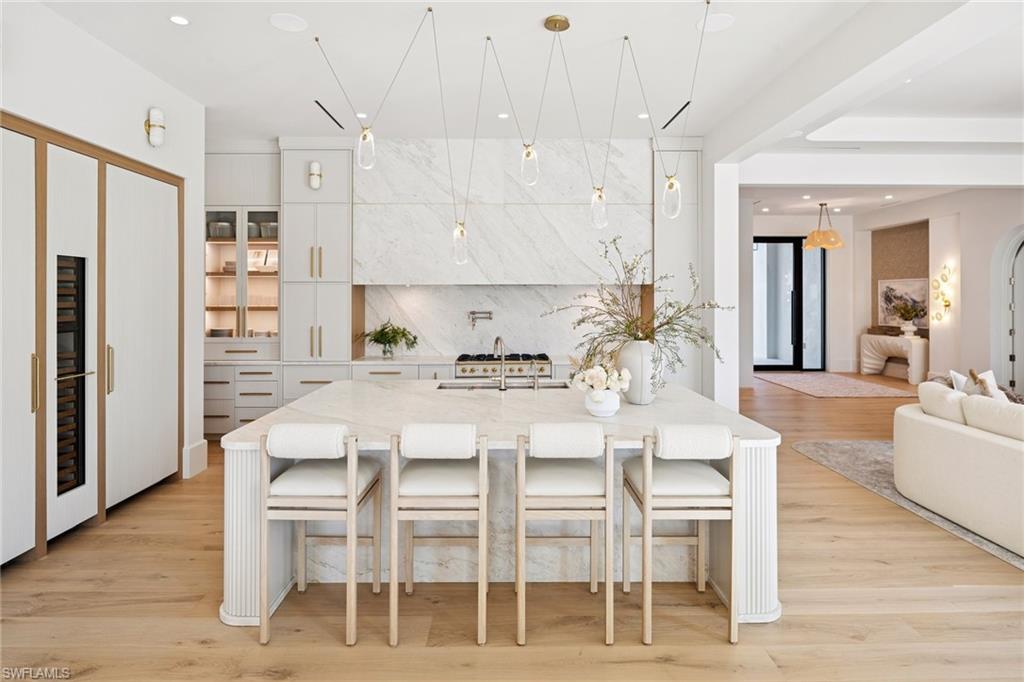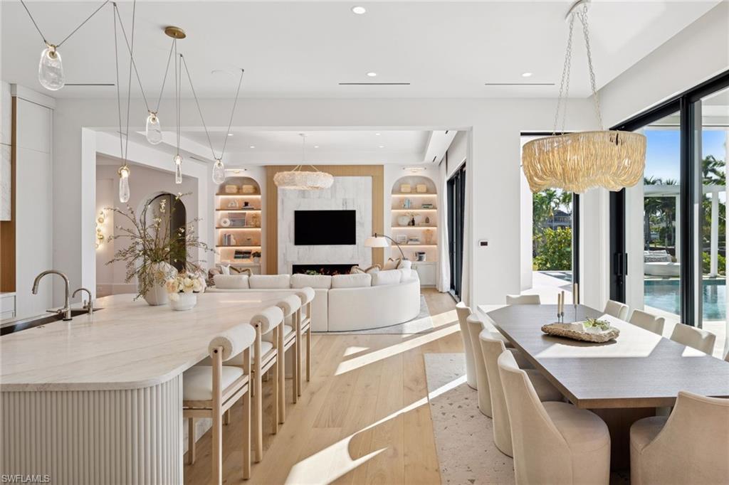 This is the one you have been waiting for. A rare, custom built new construction residence showcasing timeless features and bespoke finishes, set within the highly sought-after Aqualane Shores, one of Naples’ most prestigious enclaves. Highlights include a first-floor primary wing with a spa inspired bath, an inviting waterside lounge and bar, and extraordinary outdoor living spaces overlooking wide western exposure canal views. Designed by the celebrated team at Amy Storm and Company, envisioned by renowned architect Jon Kukk, and expertly executed by C&E Builders, this luxury residence exudes effortless sophistication. Natural materials and serene, layered neutral tones are thoughtfully integrated throughout, creating a timeless aesthetic that complements any design style. An elevator provides seamless access to every level, enhancing everyday living. Inside, bright and airy interiors are complemented by wide plank white oak floors, adding warmth and refined elegance throughout. The gourmet kitchen is a chef’s dream, showcasing a custom stone hood, a La Cornue range, top-tier appliances, and a butler’s pantry. Step outside to your private oasis, where an expansive lanai is designed for entertaining and features a fully equipped outdoor kitchen, fireplace, and generous gathering space. Relax by the sparkling pool and spa, unwind beneath the pergola with a daybed, or gather around the fire pit under the stars - creating an inviting setting for memorable evenings. For tech enthusiasts, the home is equipped with a state-of-the-art, high end AV system that delivers an immersive entertainment experience throughout the residence. Boaters will appreciate the direct Gulf access, making this a true waterfront retreat. Ideally located just moments from Naples’ pristine beaches, along with the world-class shopping and dining of 3rd Street South and 5th Avenue South, this home offers the perfect balance of luxury, convenience, and serene coastal living. This exceptional residence must be seen to be truly appreciated.